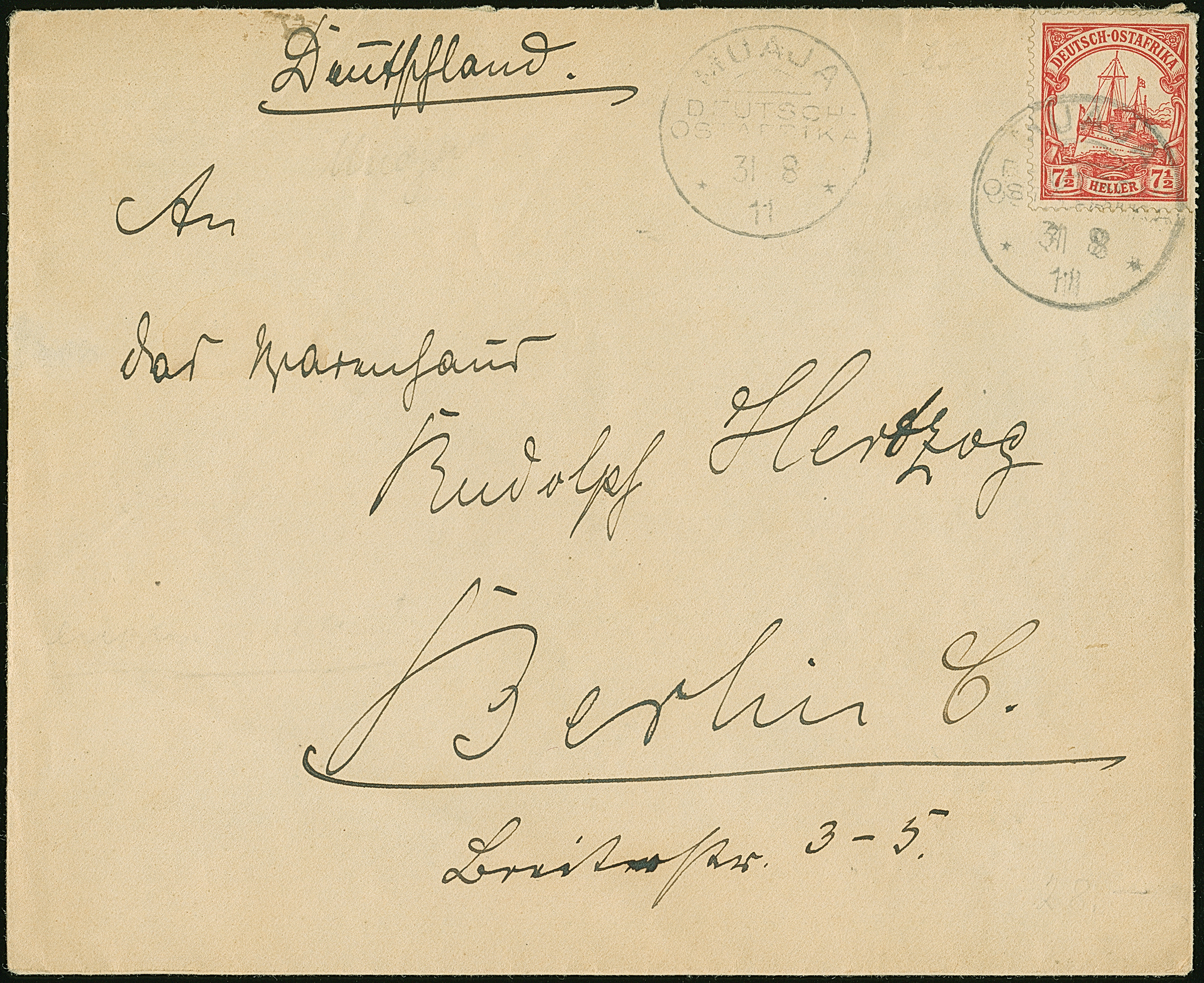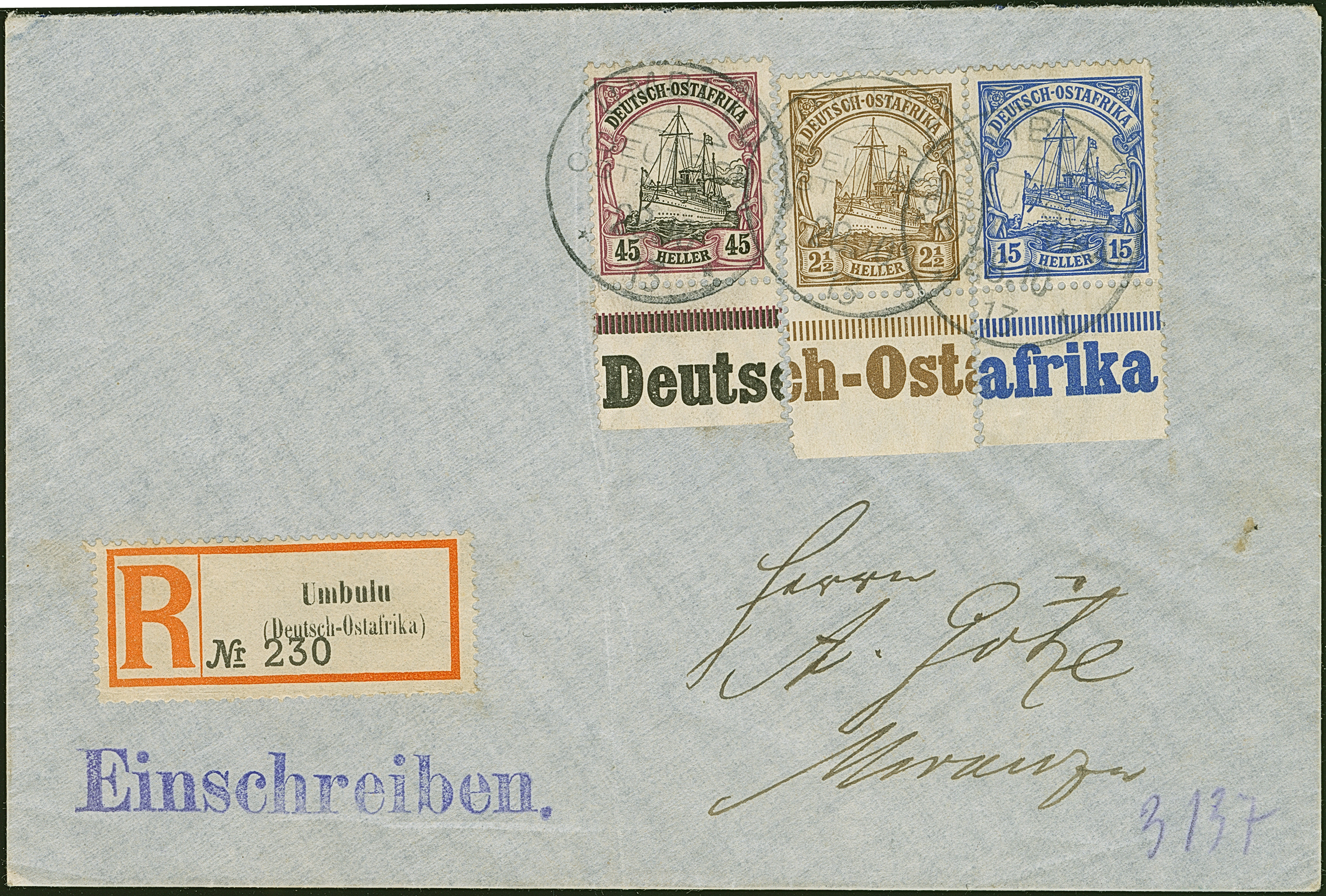 "UMBULU 28.10.13", 3 saubere Abschläge, je auf Unterrandstück 1905/20, 2½ H., 15 H. und 45 H. mit zusammen ergebender Randinschrift “Deutsch-Ostafrika”, auf philatelistischem R-Brief nach Muanza. Ein seltenes Stück in schöner Erhaltung. Fotoattest Jäschke-L. BPP (2026)