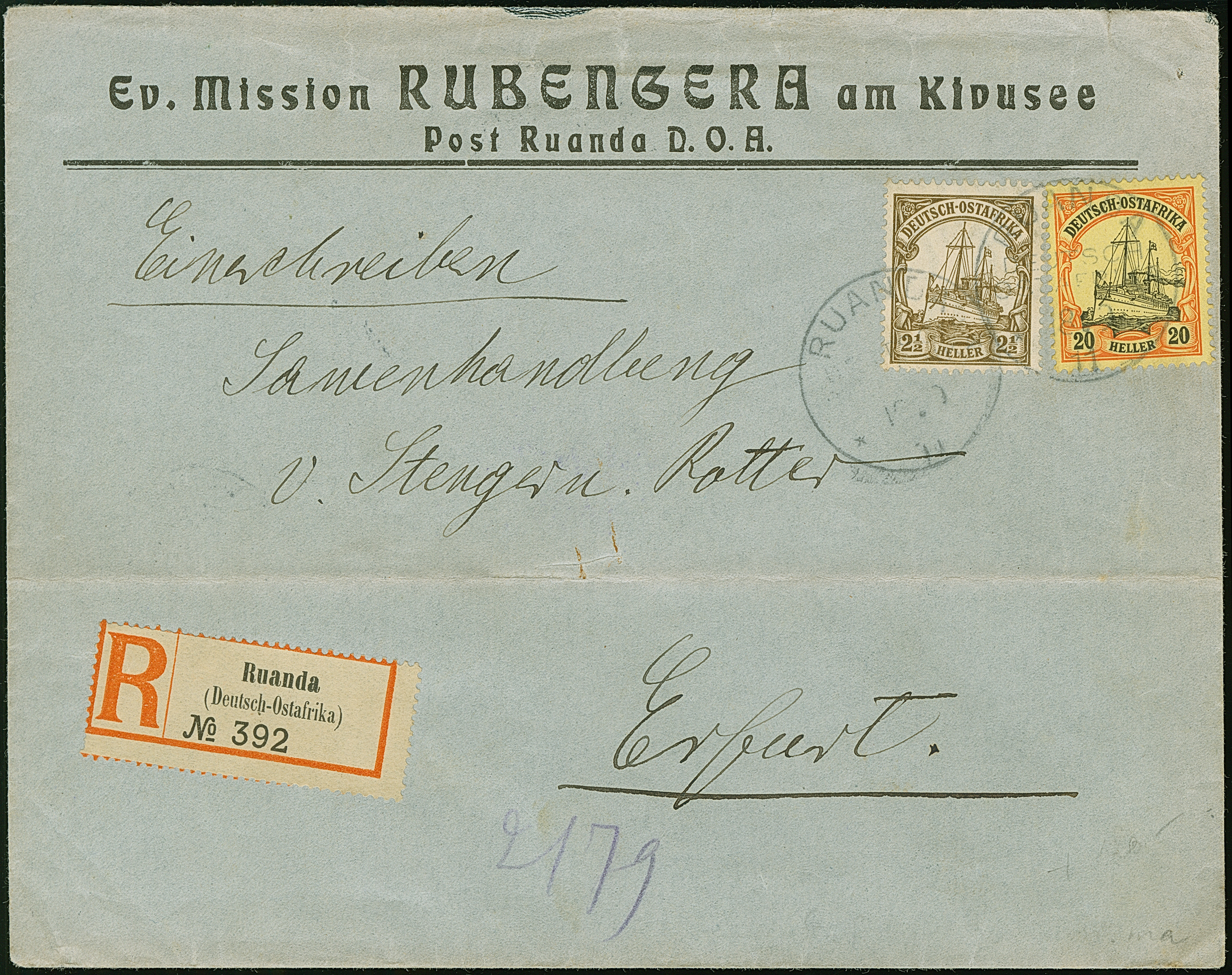 "RUANDA 18/9 11" auf 2½ H. und 20 H. auf Bedarfs-R-Brief mit gedrucktem Absender "Ev. Mission RUBENGERA am Kivusee" an eine Samenhandlung in Erfurt, mit Durchgangsstempel von Bukoba und Ankunftsstempel. Der Umschlag waagerecht gefaltet. Sehr selten.