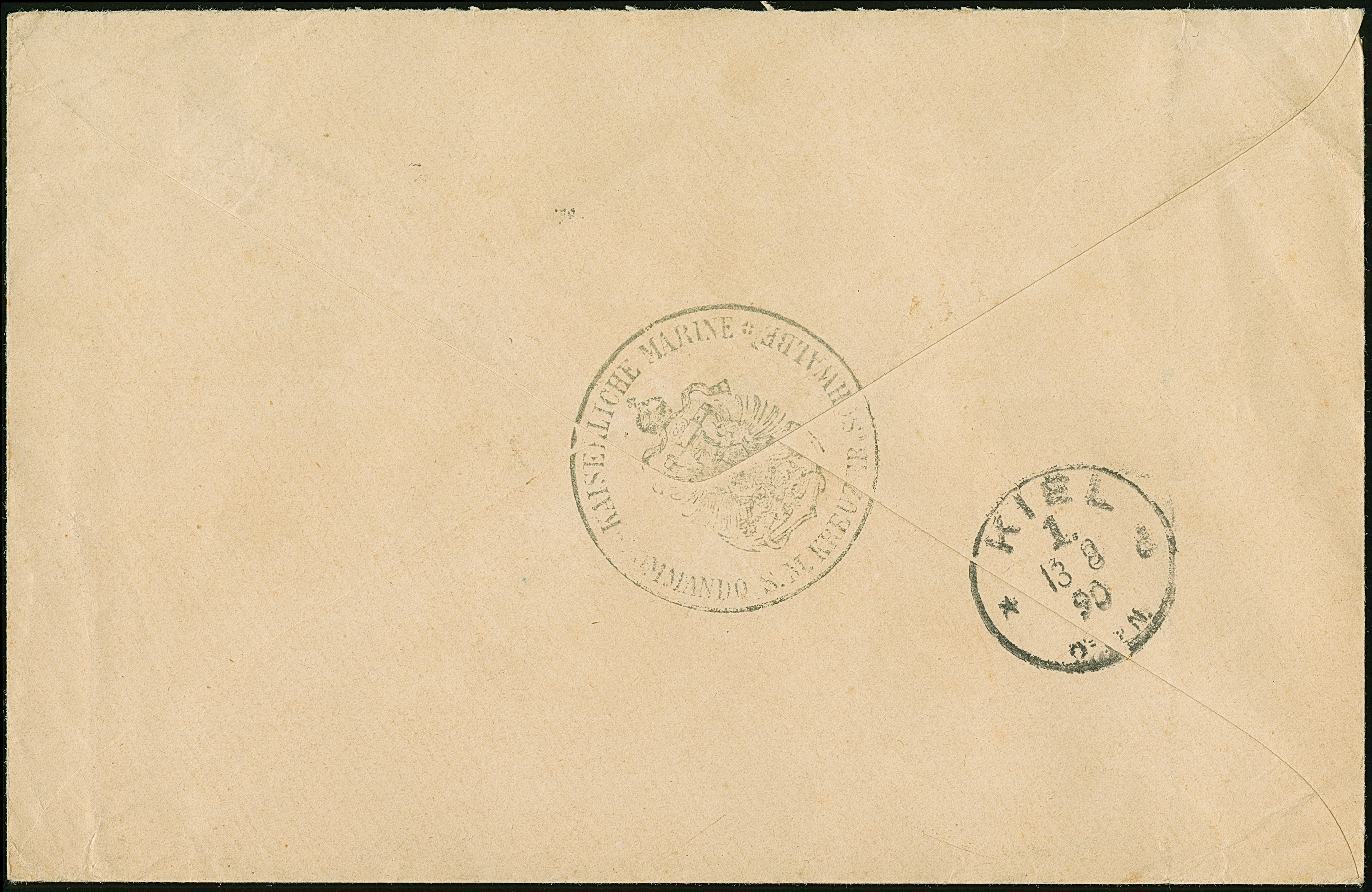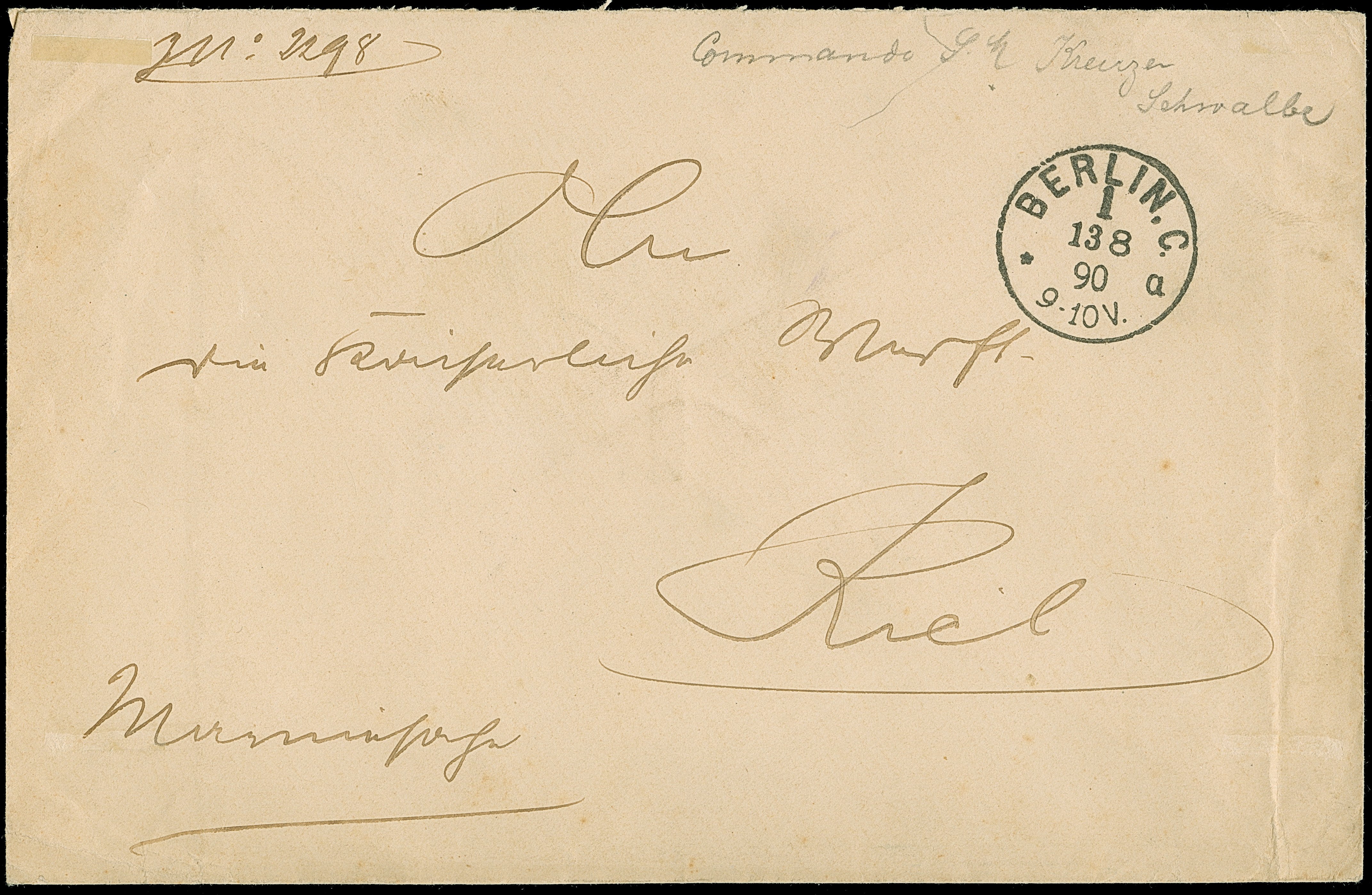 "KAISERLICHE MARINE S.M. KREUZER SCHWALBE", Absender Stempel rückseitig auf Marinesache, befördert über das Hofpostamt mit Aufgabestempel "BERLIN C.1. 13 8 90", nach Kiel. Ein seltener Beleg von der Seeblockade während des Araber-Aufstandes. Bescheinigung Crüsemann (1966)