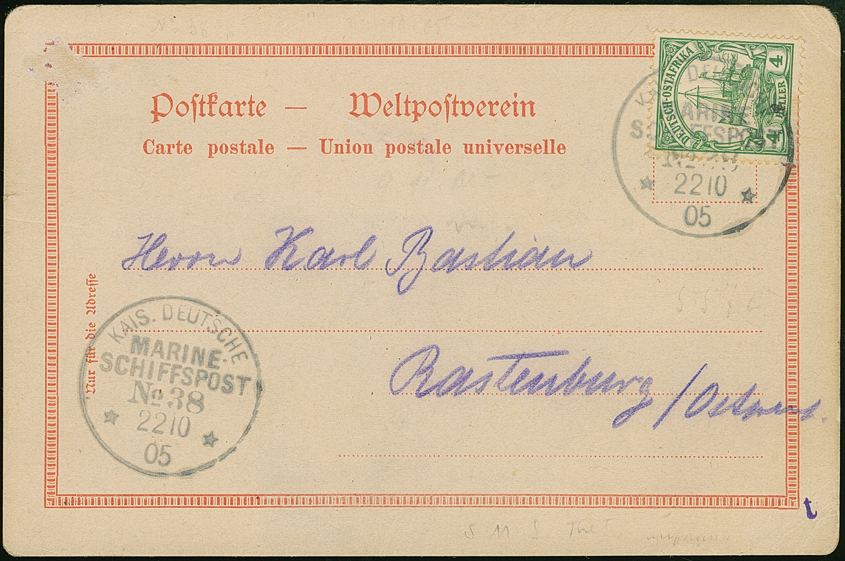 "MSP No.38/ 22.10.05" (SMS Thetis), zwei klare Abschläge auf 4 H. o.Wz. auf bedarfsgebrauchter Ansichtskarte mit, nach Rastenburg