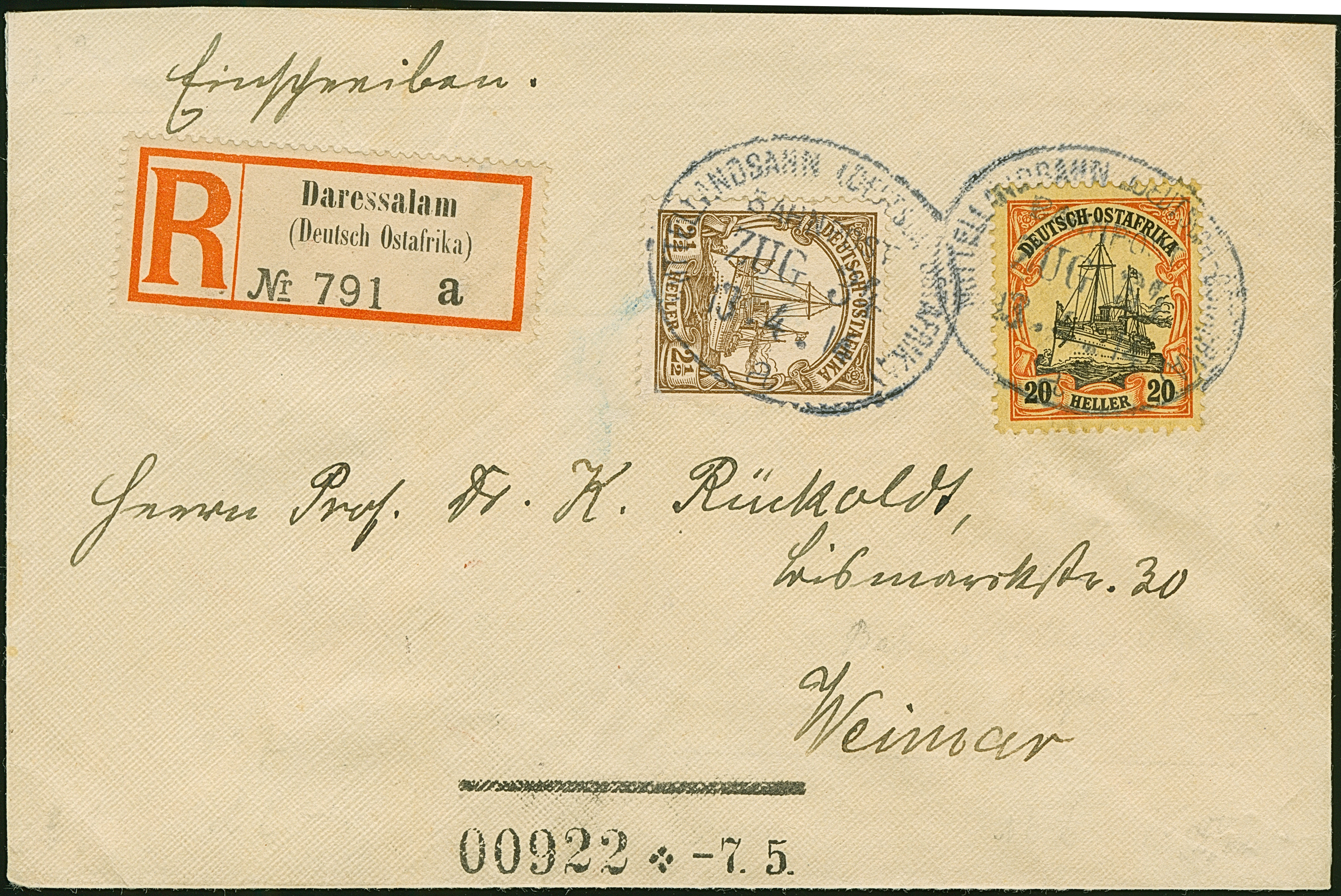 “MITTELLANDBAHN (DOA) a ZUG 34 13.4.14” zweimal klar auf Kaiseryacht 2½ H. ohne Wasserzeichen und 20 H. mit Wasserzeichen als tarifgerechte Frankatur auf R-Brief mit R-Zettel “Daressalam (Deutsch-Ostafrika)” nach Weimar mit Ankunftsstempel, in einwandfreier Erhaltung