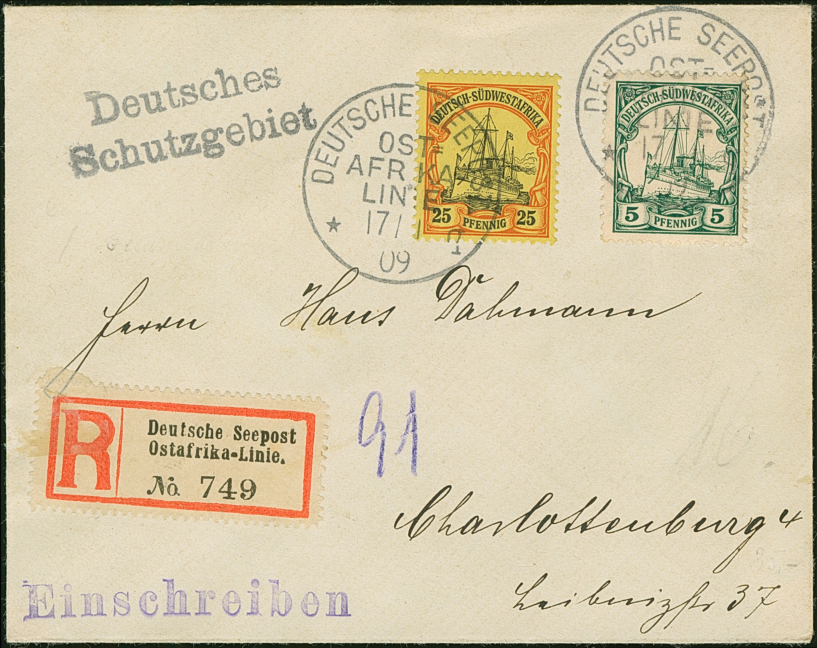 “DSP OST-AFRIKA-LINIE *q 17.1.09” (D. Feldmarschall) zweimal klar auf DSWA Kaiseryacht 5 und 25 Pfg. als tarifgerechte Frankatur auf R-Brief mit R-Zettel “Deutsche Seepost Ostafrika-Linie” und L2 “Deutsches Schutzgebiet” nach Charlottenburg mit Ankunftsstempel, in einwandfreier Erhaltung