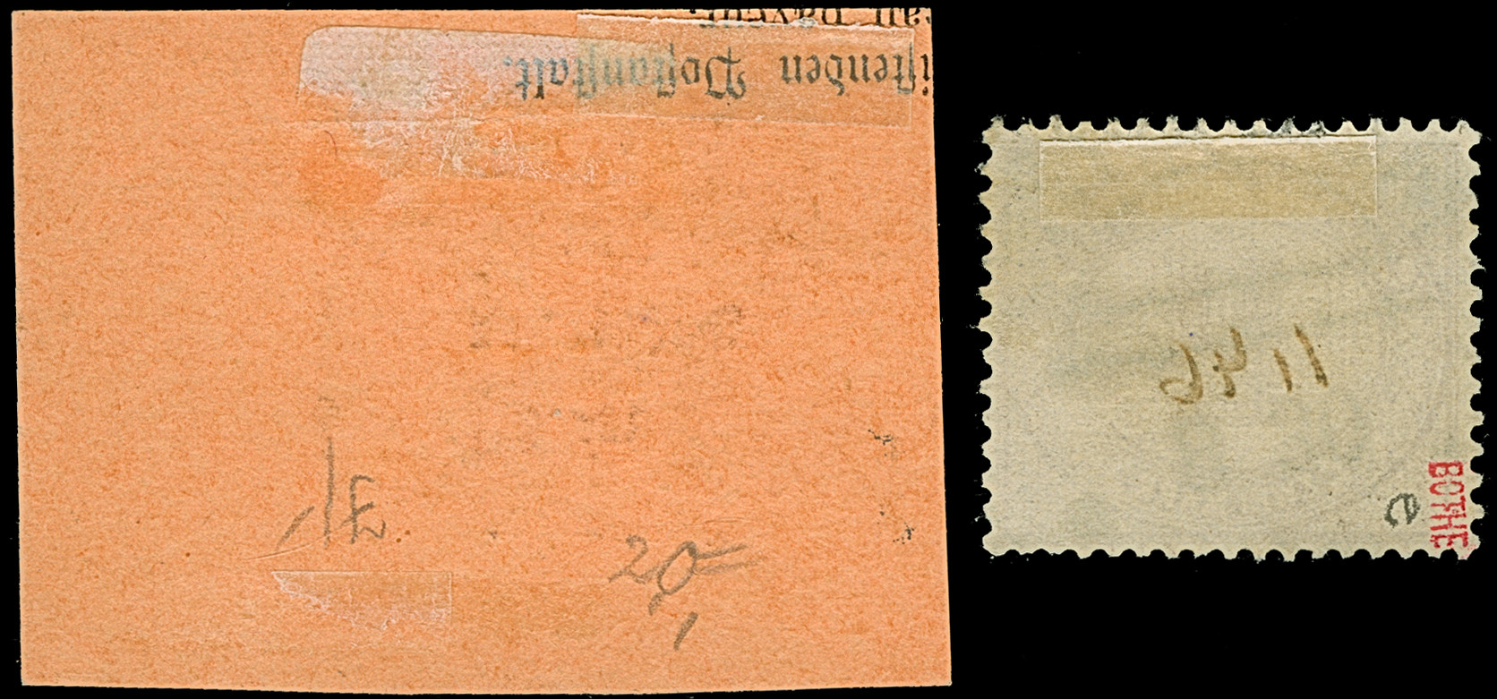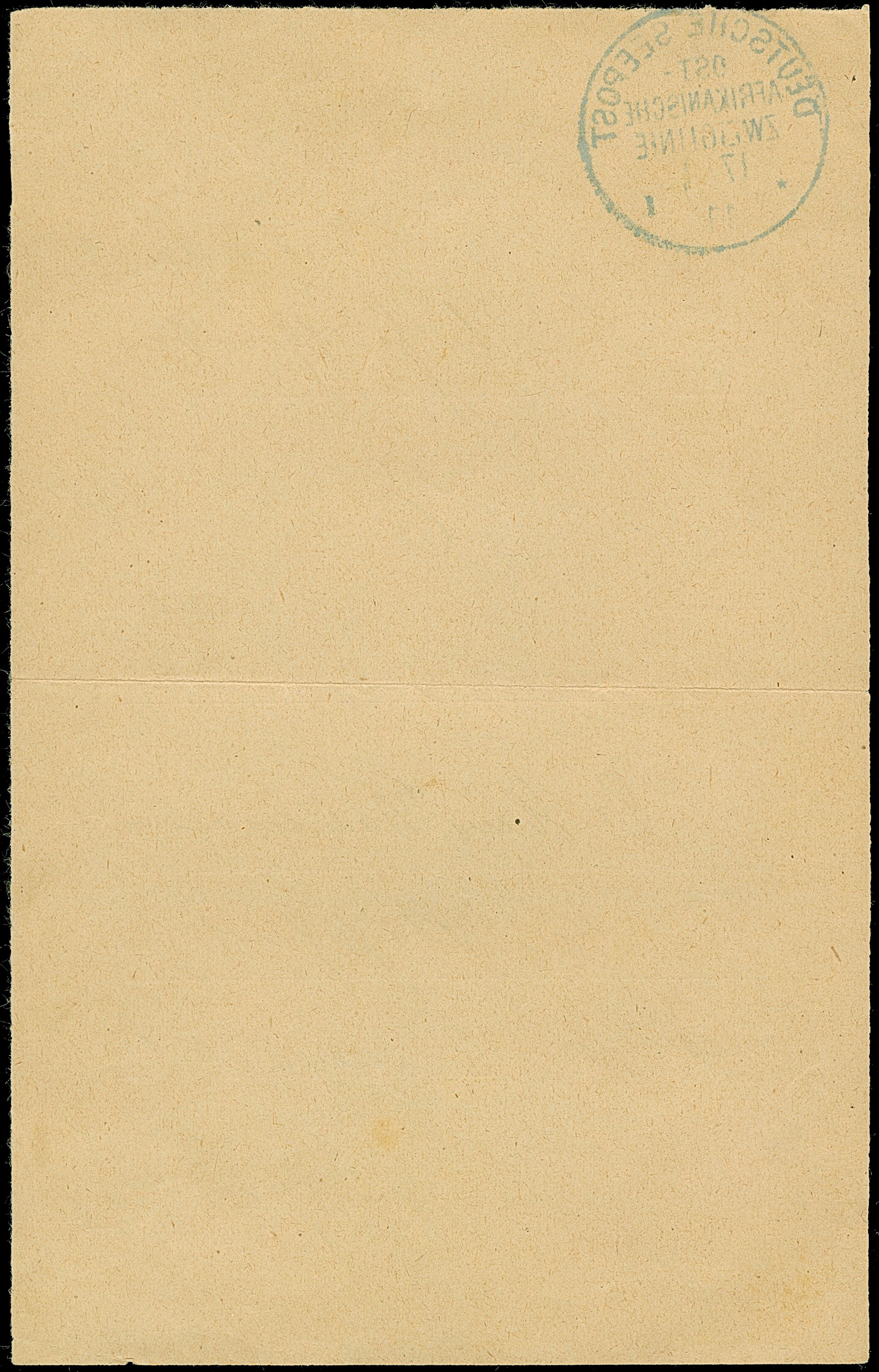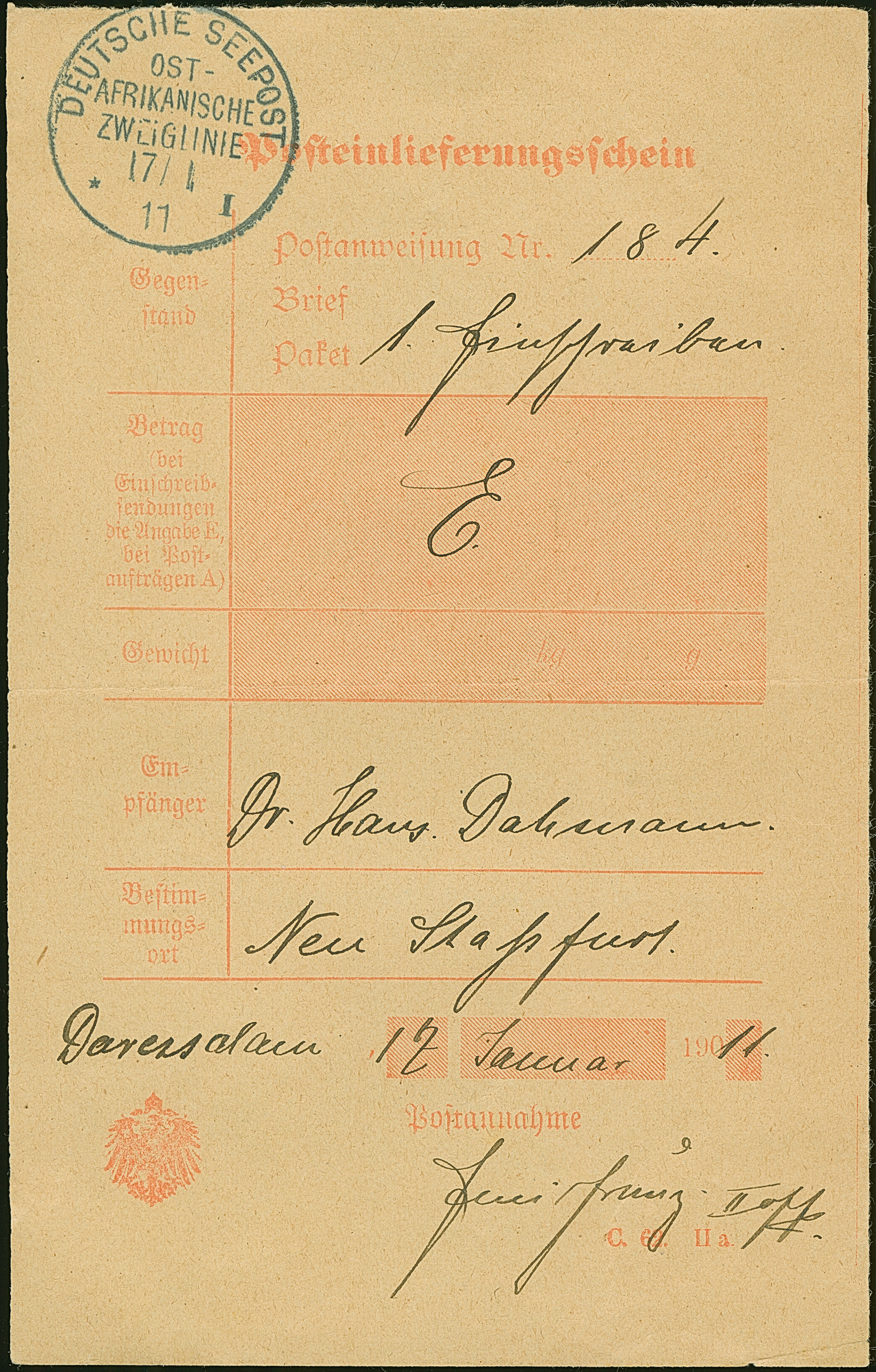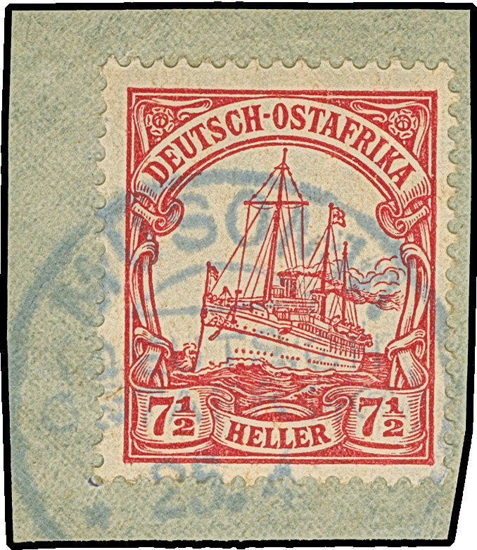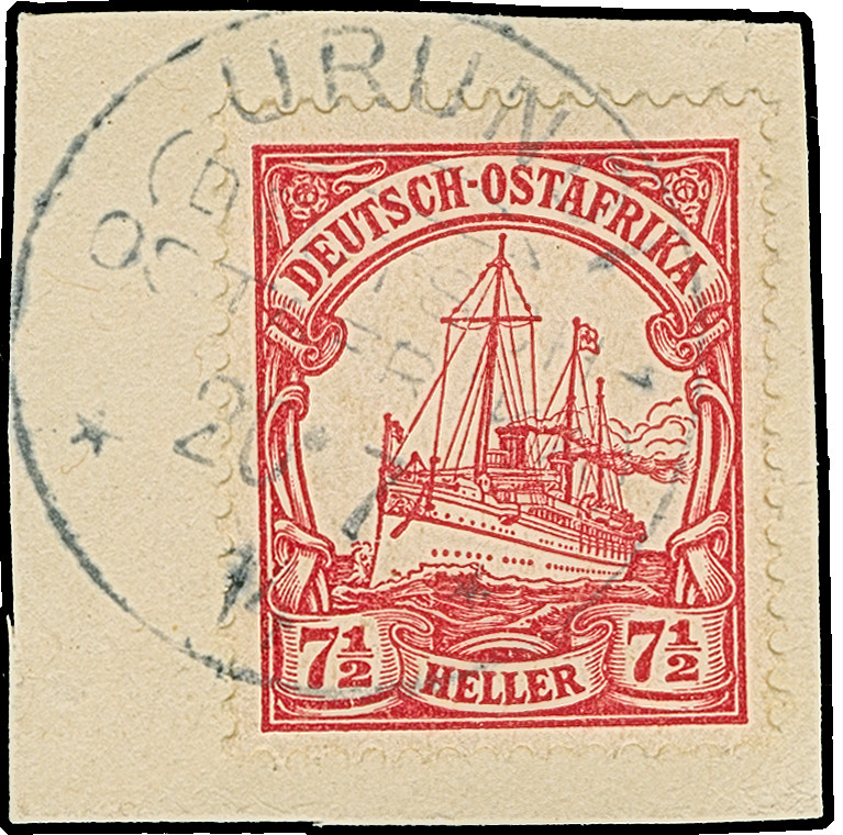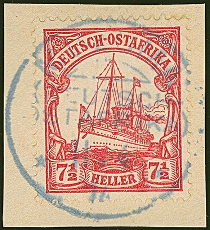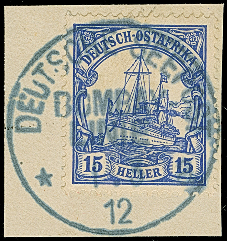 “DSP OST-AFRIKANISCHE ZWEIGLINIE *I 17.1.11” (D. Sultan) sehr klar auf Posteinlieferungsschein für einen R-Brief mit handschriftlicher Datierung “Daressalam 17.Januar 1911”. Das Formular mit waagerechter Faltung, ansonsten in guter Erhaltung. Eine ganz ungewöhnliche Verwendung mit dem seltenen Schiffspoststempel