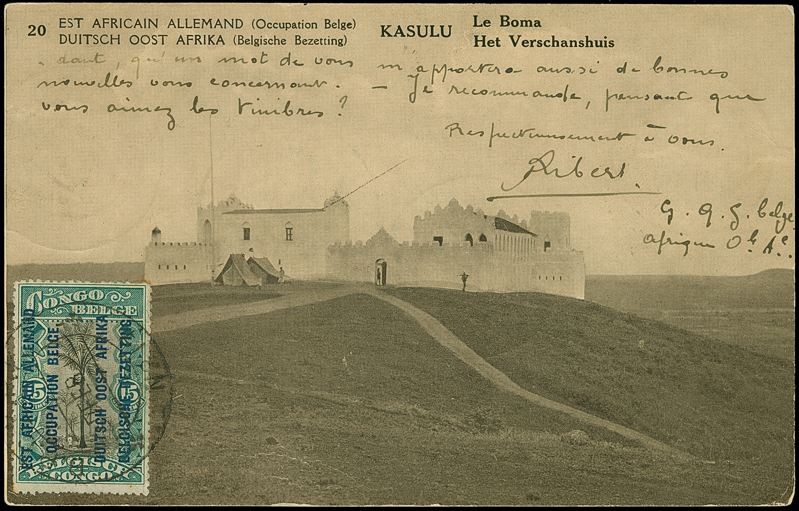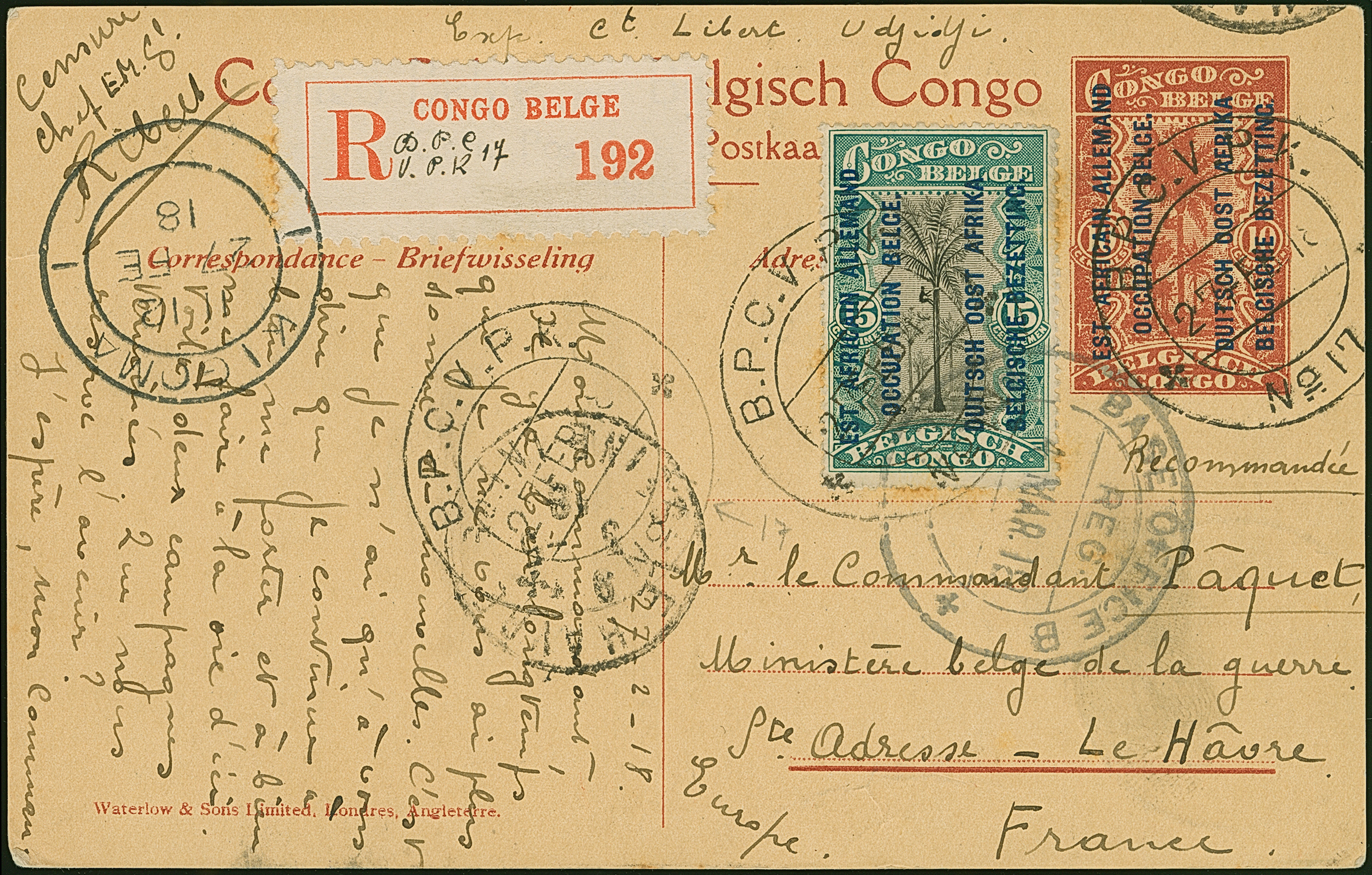 1916, Aufdruck-Ausgabe 5 C., zwei Einzelmarken mit Feldpoststempel “B.P.C.V. P. No.17 27.FEB.18” vorder- und rückseitig auf Aufdruck-Bild-Ganzsachenkarte “Kasulu” 10 C. als R-Karte mit viel Text via Kigoma nach Le Havre mit Ankunftsstempel, in guter Erhaltung