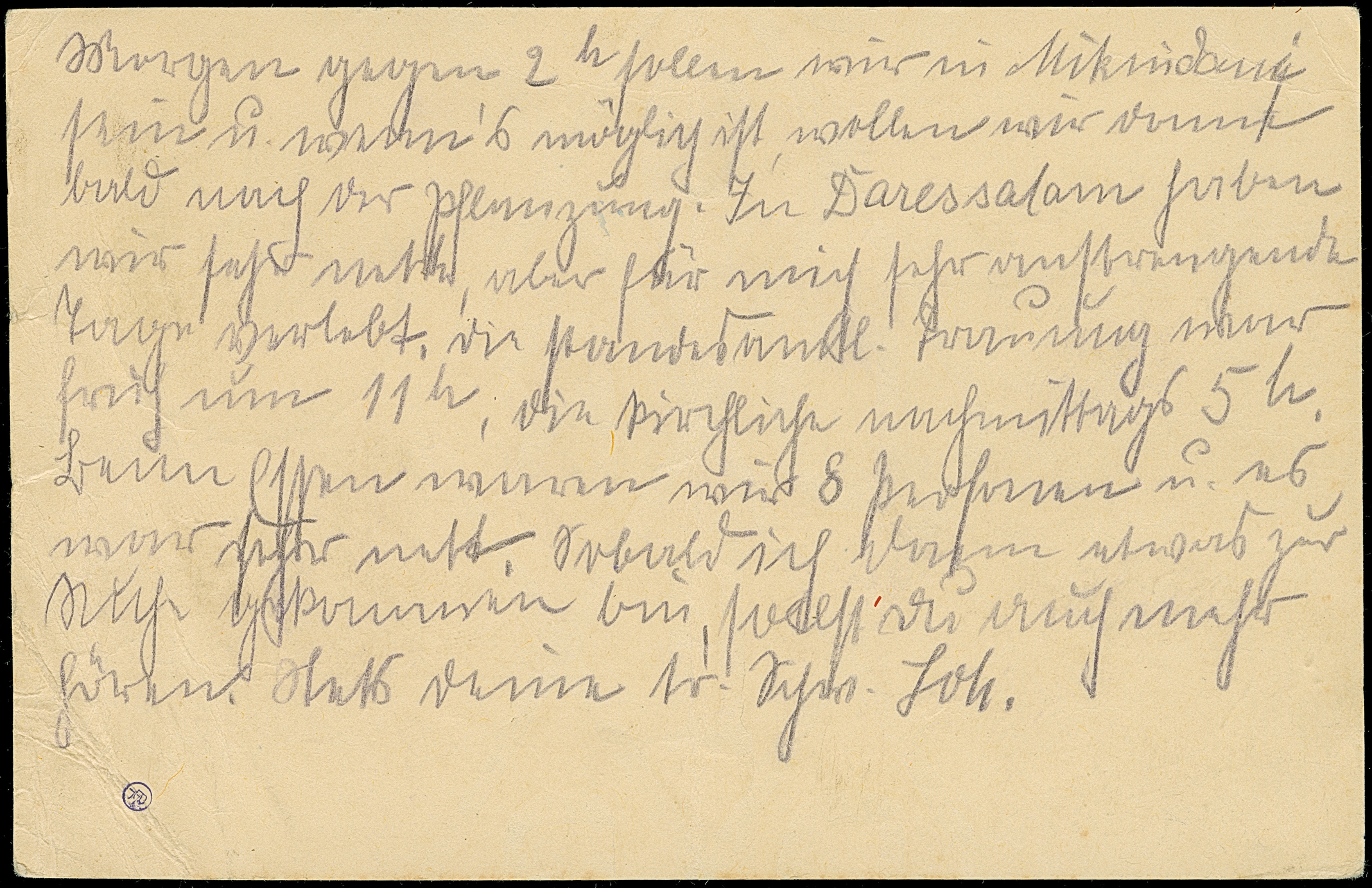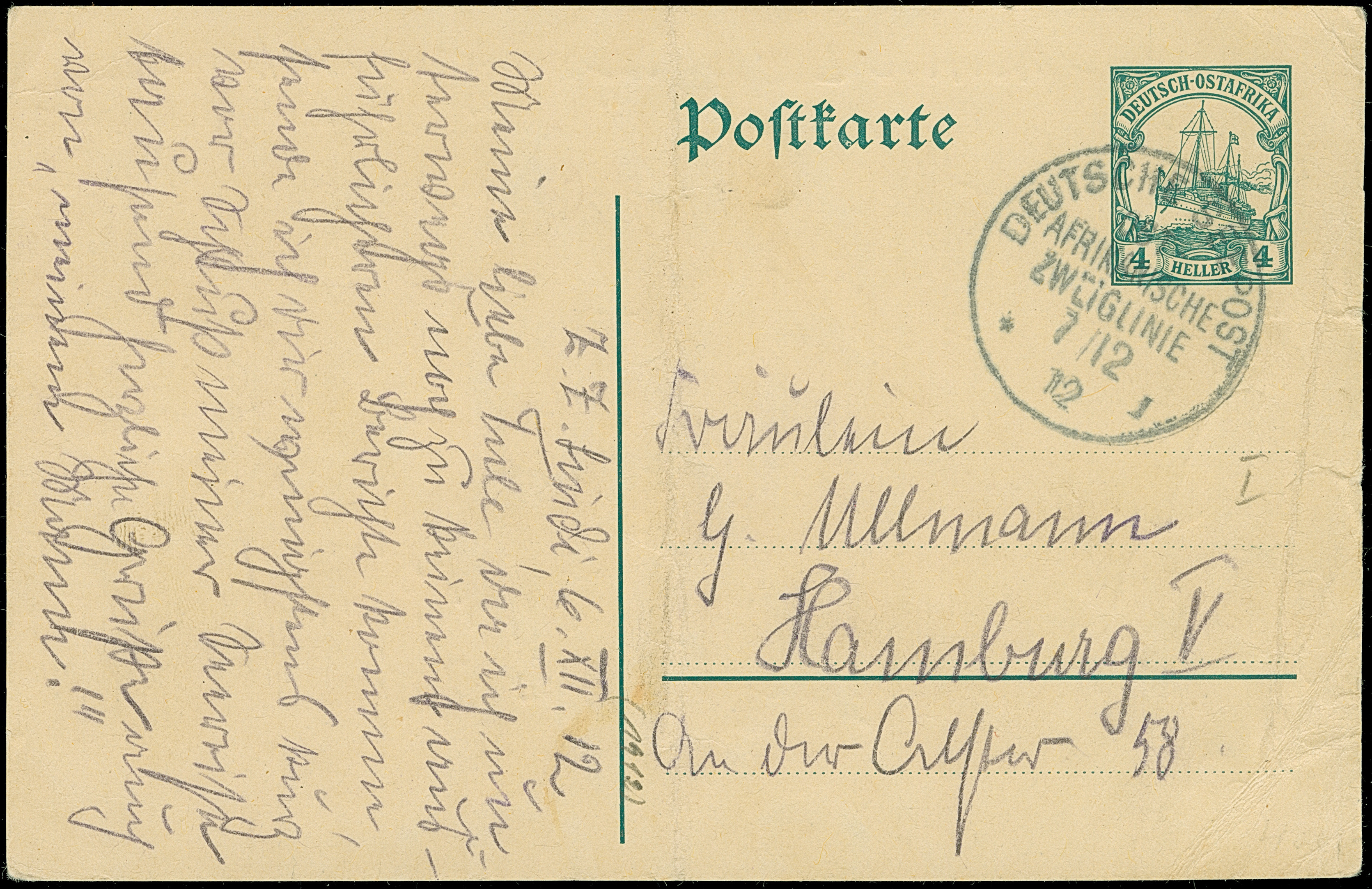 “DSP OST-AFRIKANSICHE ZWEIGLINIE *I 7.12.12” (D. Sultan) klar auf Ganzsachenkarte 4 H. mit viel Text und Datierung “z. Z. Lindi, 6.XII.12” nach Hamburg. Die Karte ist senkrecht gefaltet und hat rechts Randfehler. Trotz der Einschränkungen eine interessante Karte aus dem Bedarf mit besserem Schiffspoststempel