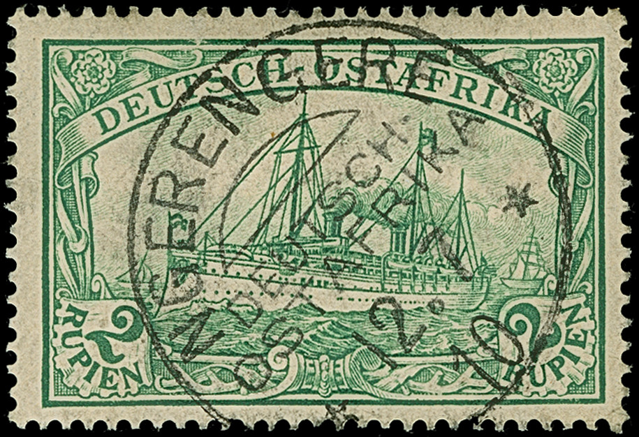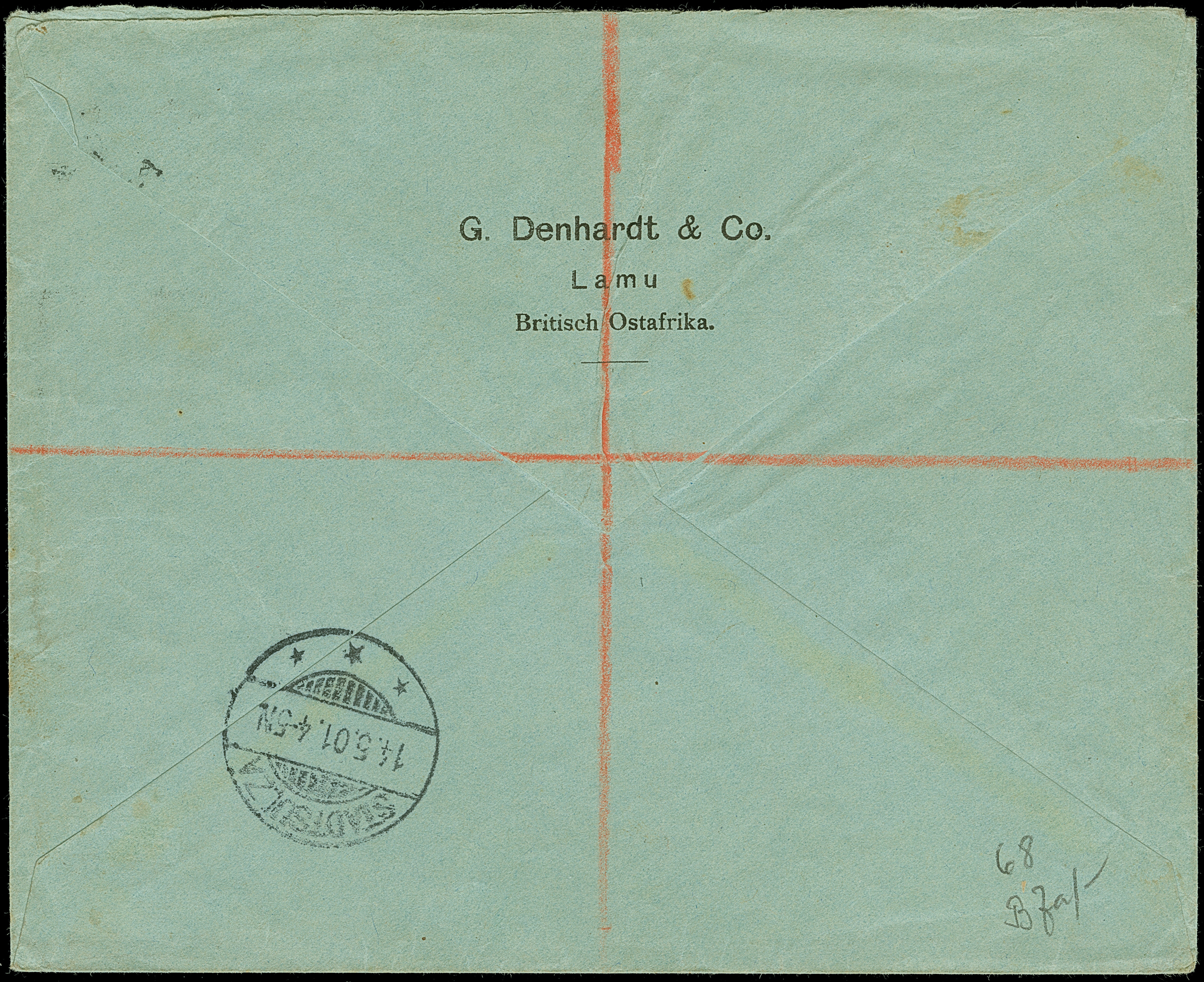 “DSP OST-AFRIKANISCHE HAUPTLINIE *k 1.5.05” (D. König) etwas schwach auf Deutsches Reich Germania Reichspost 10 und 50 Pfg. als tarifgerechte Frankatur auf R-Brief der 2. Gewichtsstufe mit rückseit gedrucktem Absender “G. Denhardt & Co. Lamu Britisch Ostafrika” und handschriftlichem R-Vermerk “R 101” in Blau nach Stadtsulza mit Ankunftsstempel. Der Umschlag mit leichten Beförderungsspuren, sonst in guter Erhaltung