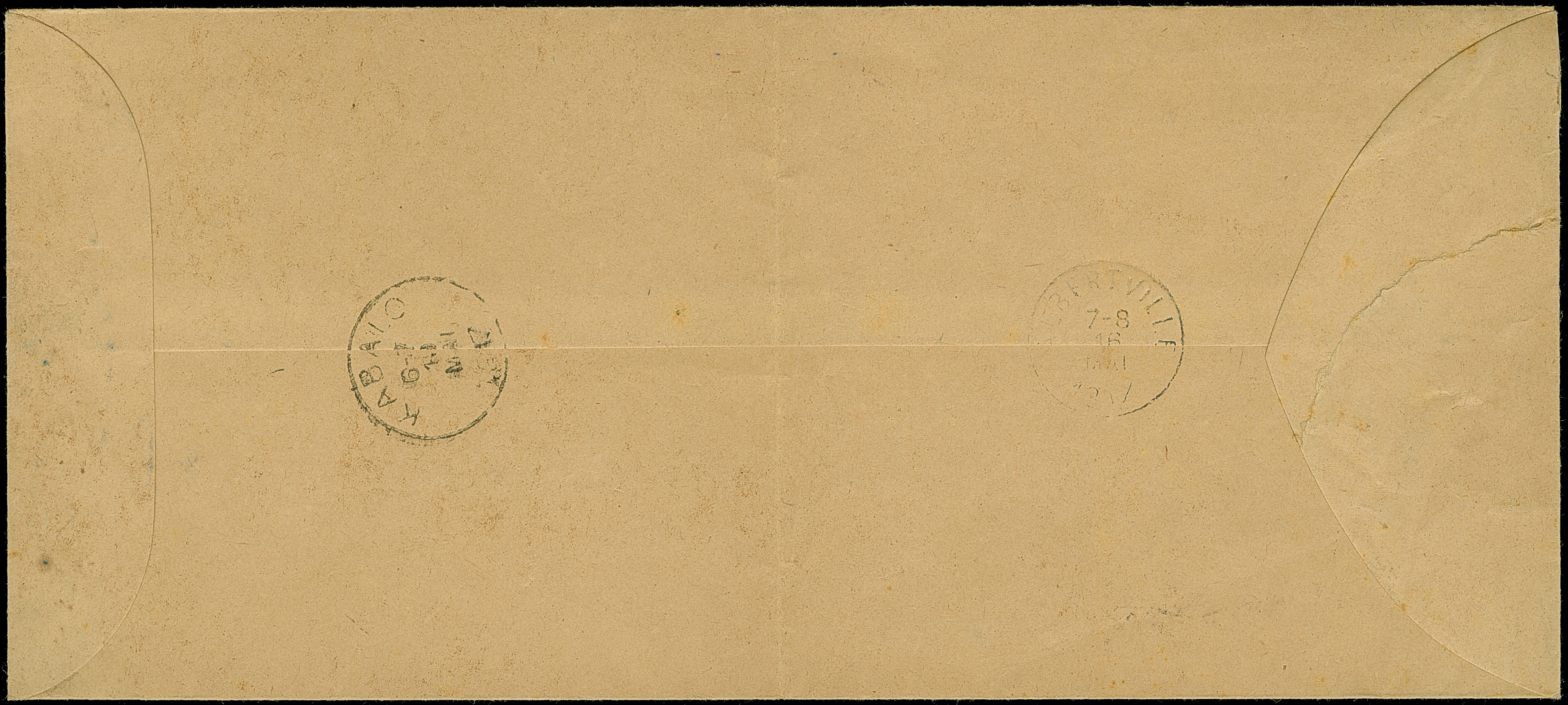 1917, “KIGOMA 15.MY.17” blauer Stempel klar auf langformatigem Vordruck-Dienstbrief “EAST-AFRICAIN ALLEMAND OCCUPATION BELGE” mit Briefstempel via Albertville nach Kabalo mit Ankunftsstempel. Der Umschlag mit senkrechter Faltung und kleinem Randfehler, ansonsten in guter Erhaltung, selten