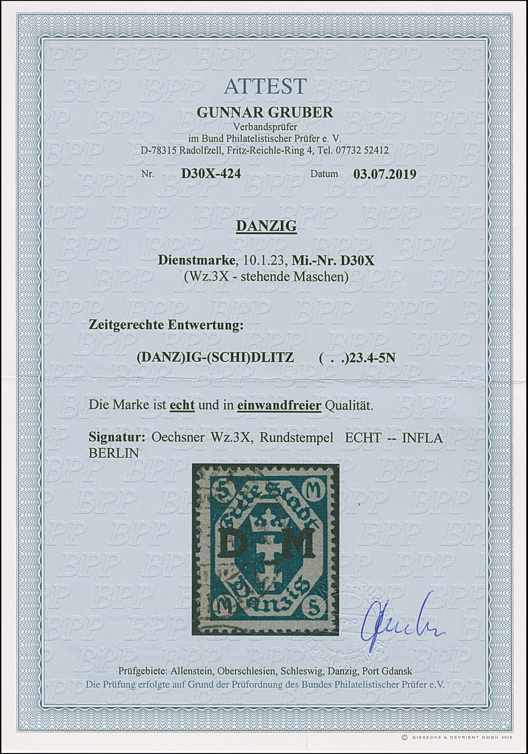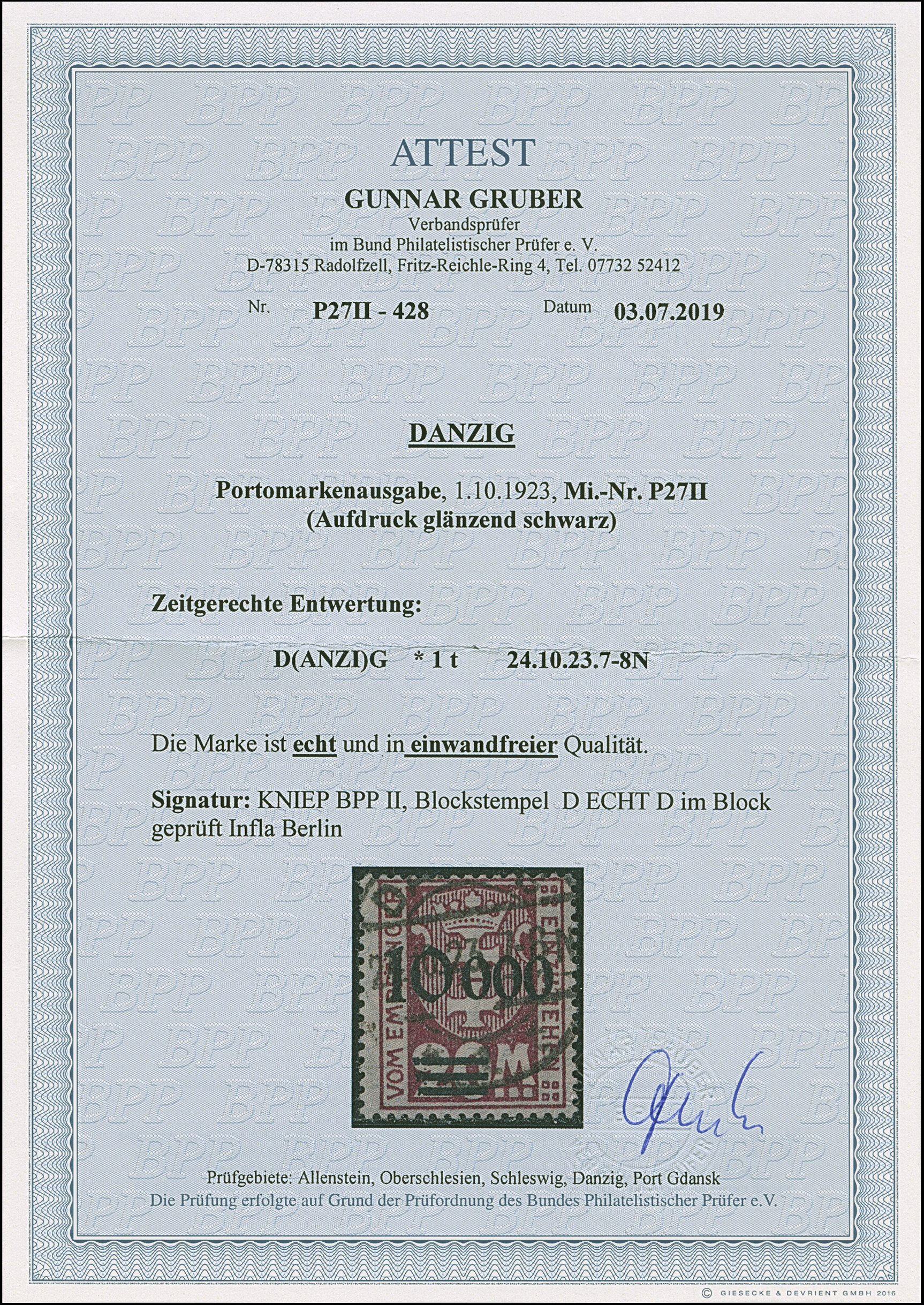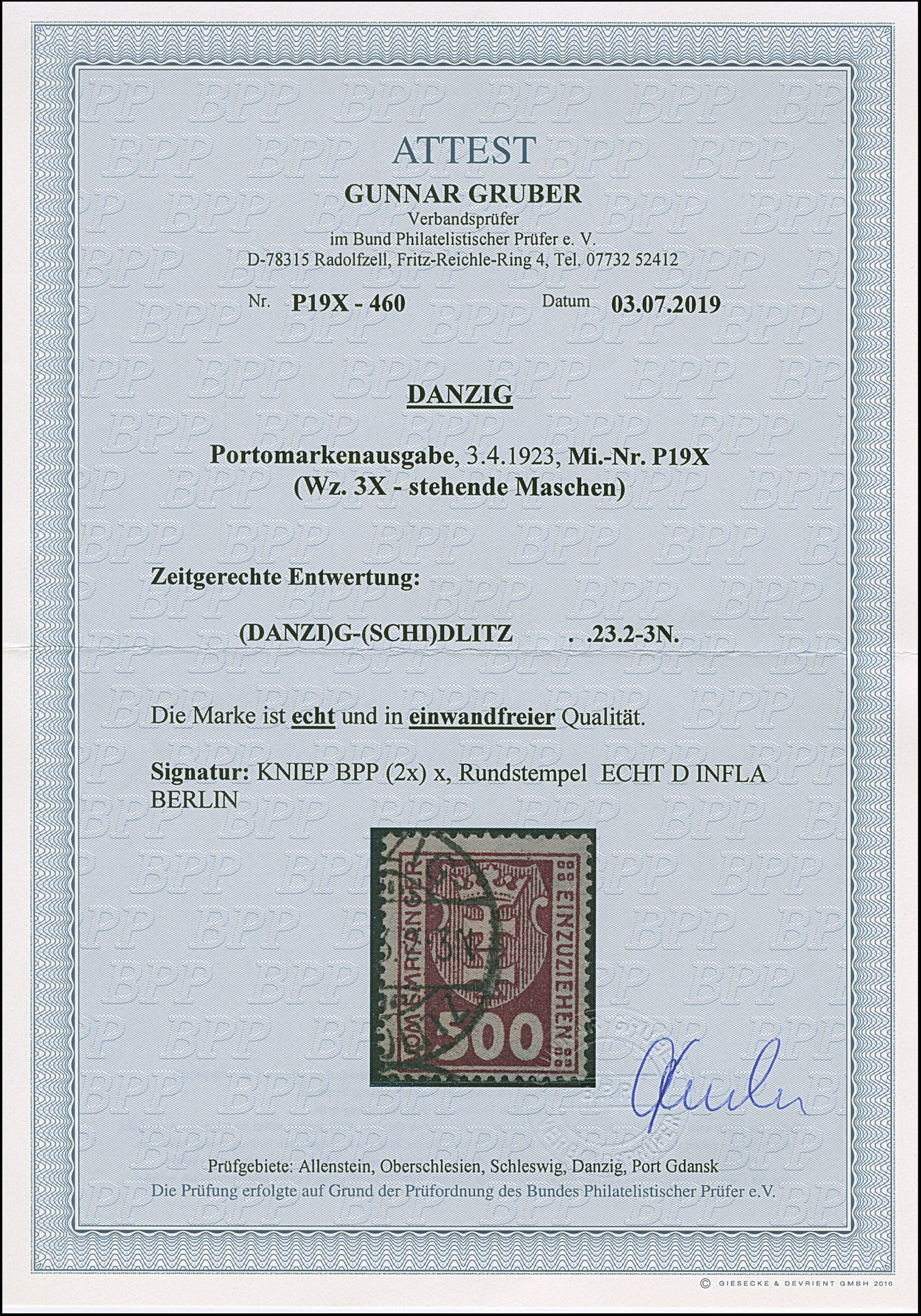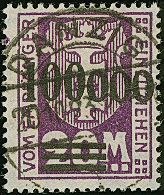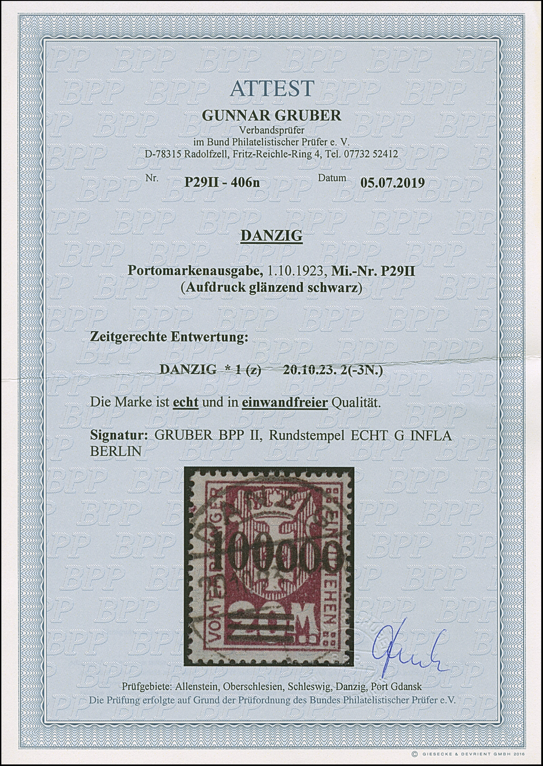 1923, 100000 auf 20 Mark, glänzender Aufdruck, farbfrisch und gut gezähnt, sauber und klar, zeitgerecht gestempelt “DANZIG 20.10.23”, tadellos, u.a. sign. Infla sowie Gruber BPP mit Fotoattest (2019)