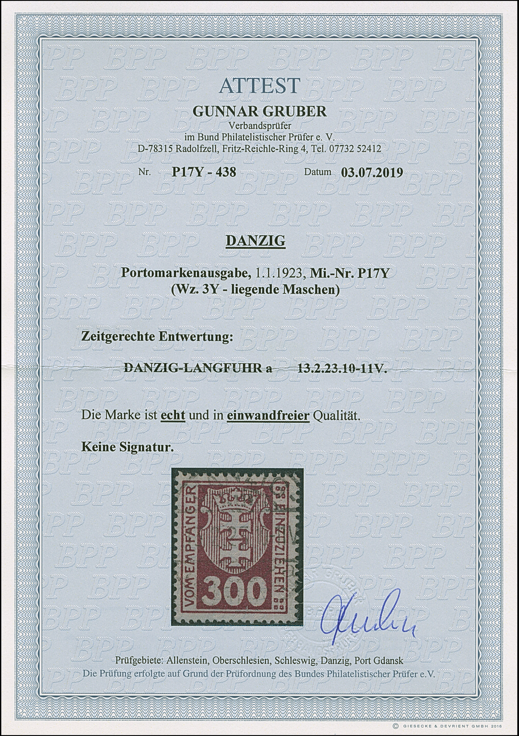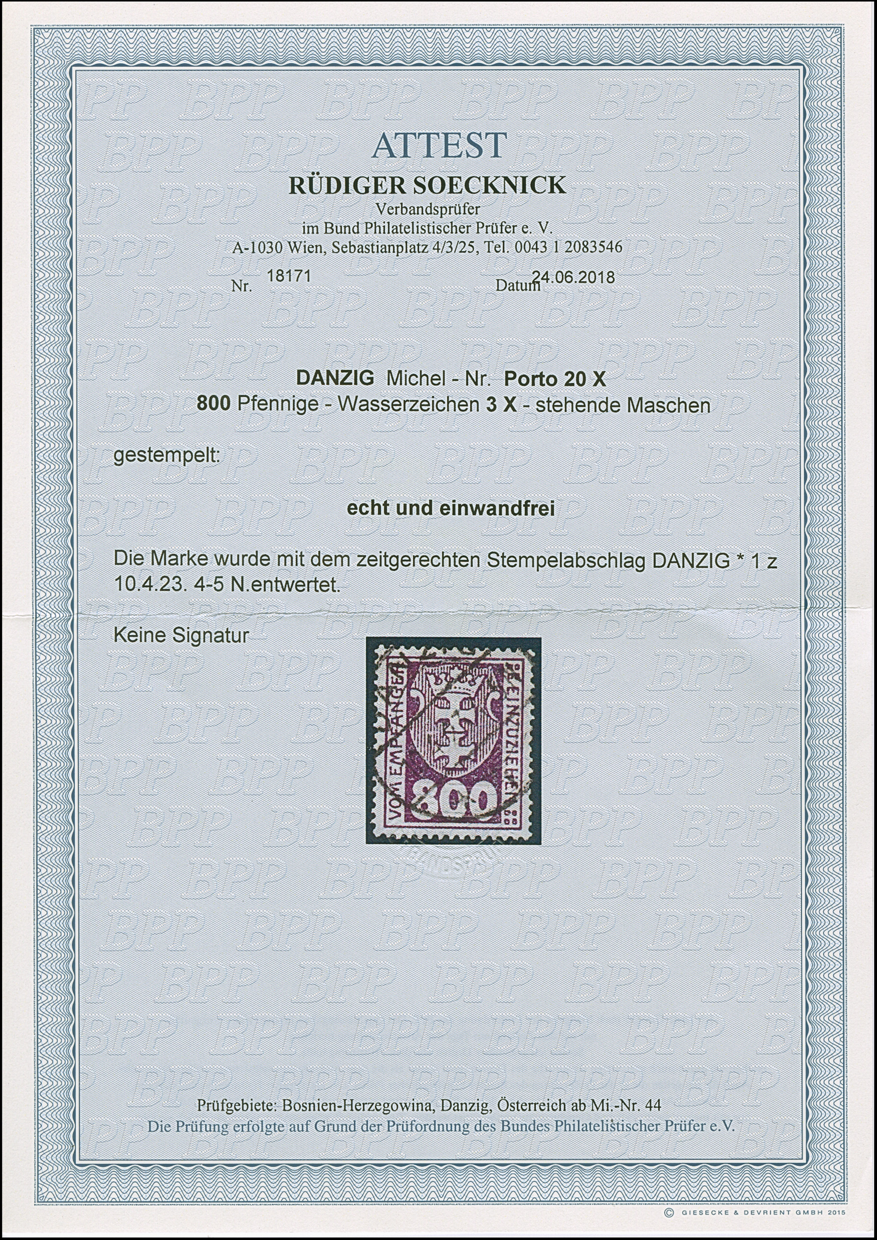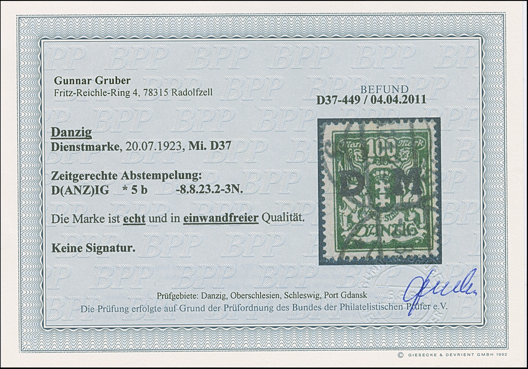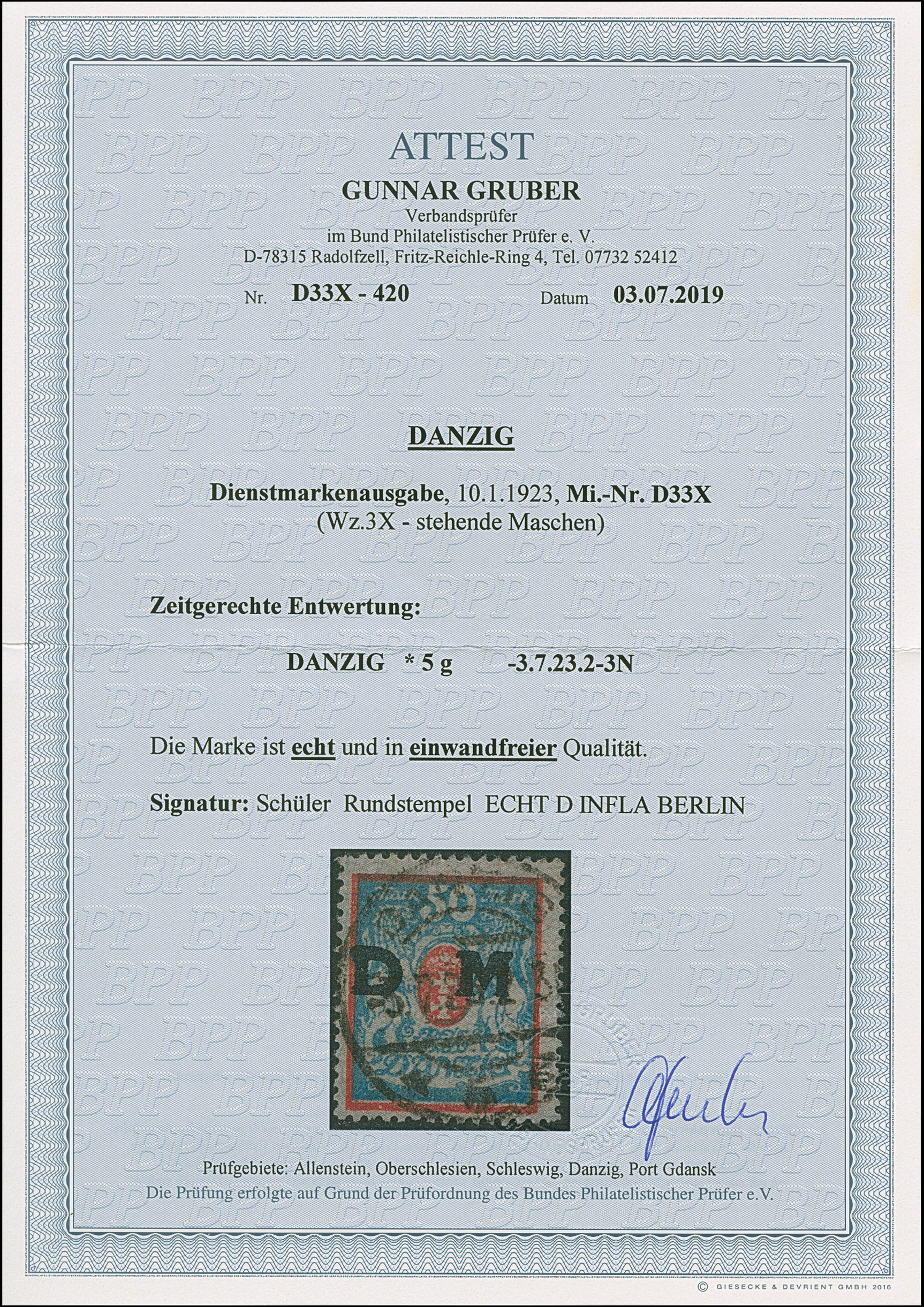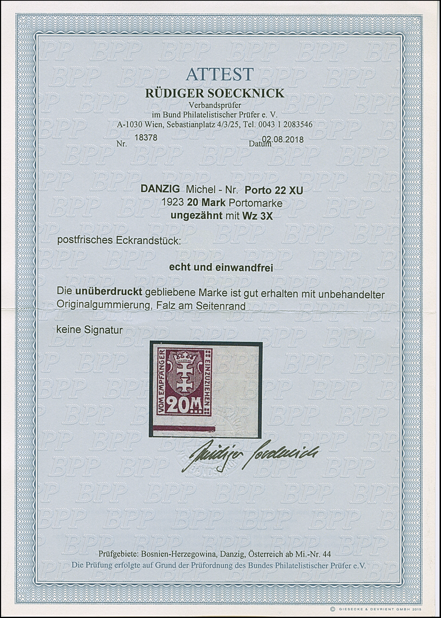 1923, 100000 auf 20 Mark, glänzender Aufdruck, farbfrisch und gut gezähnt, sauber und klar, zeitgerecht gestempelt “DANZIG 20.10.23”, tadellos, u.a. sign. Infla sowie Gruber BPP mit Fotoattest (2019)