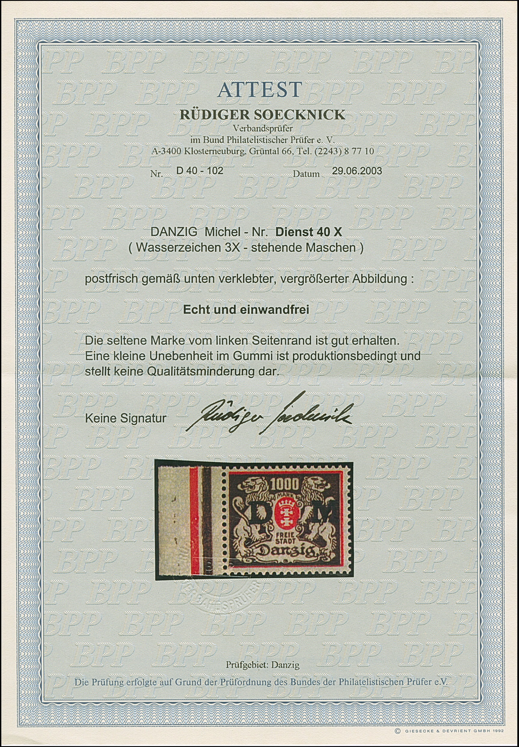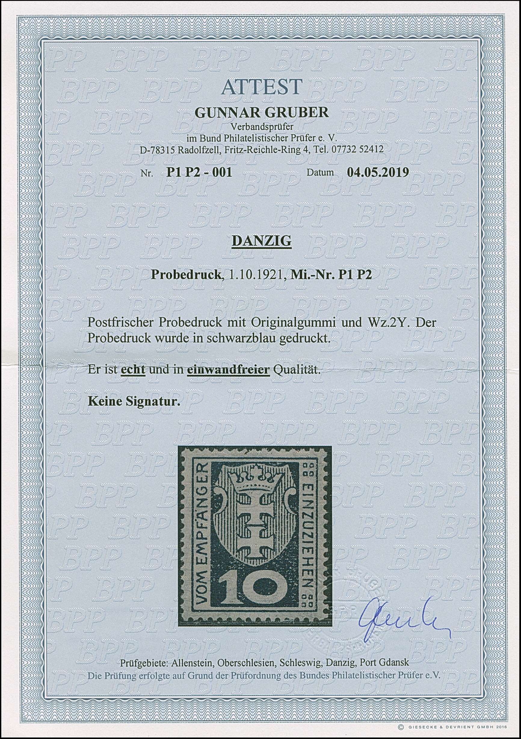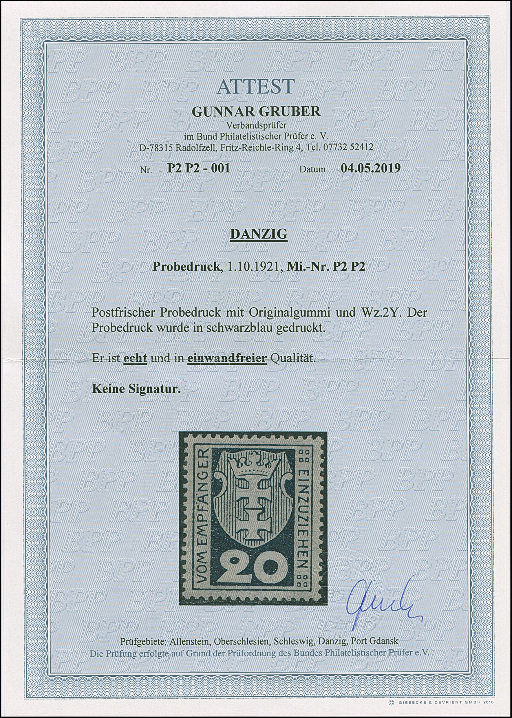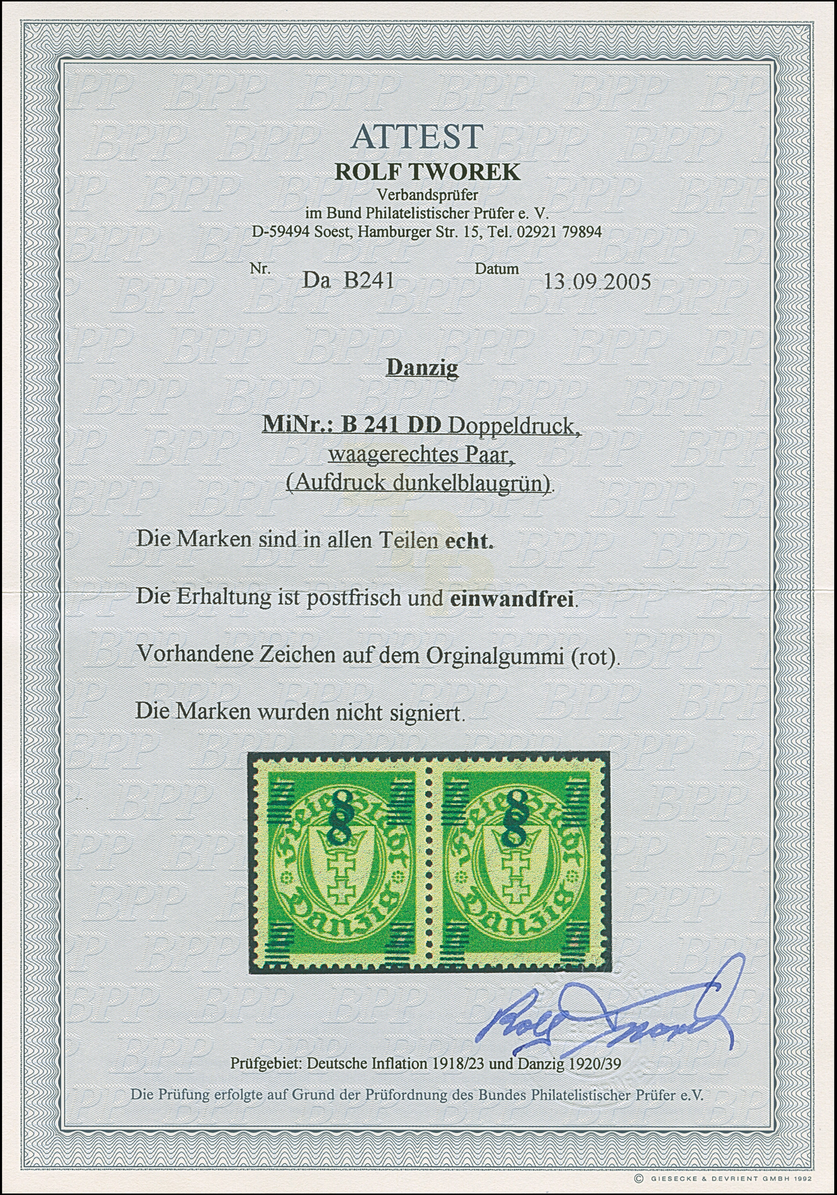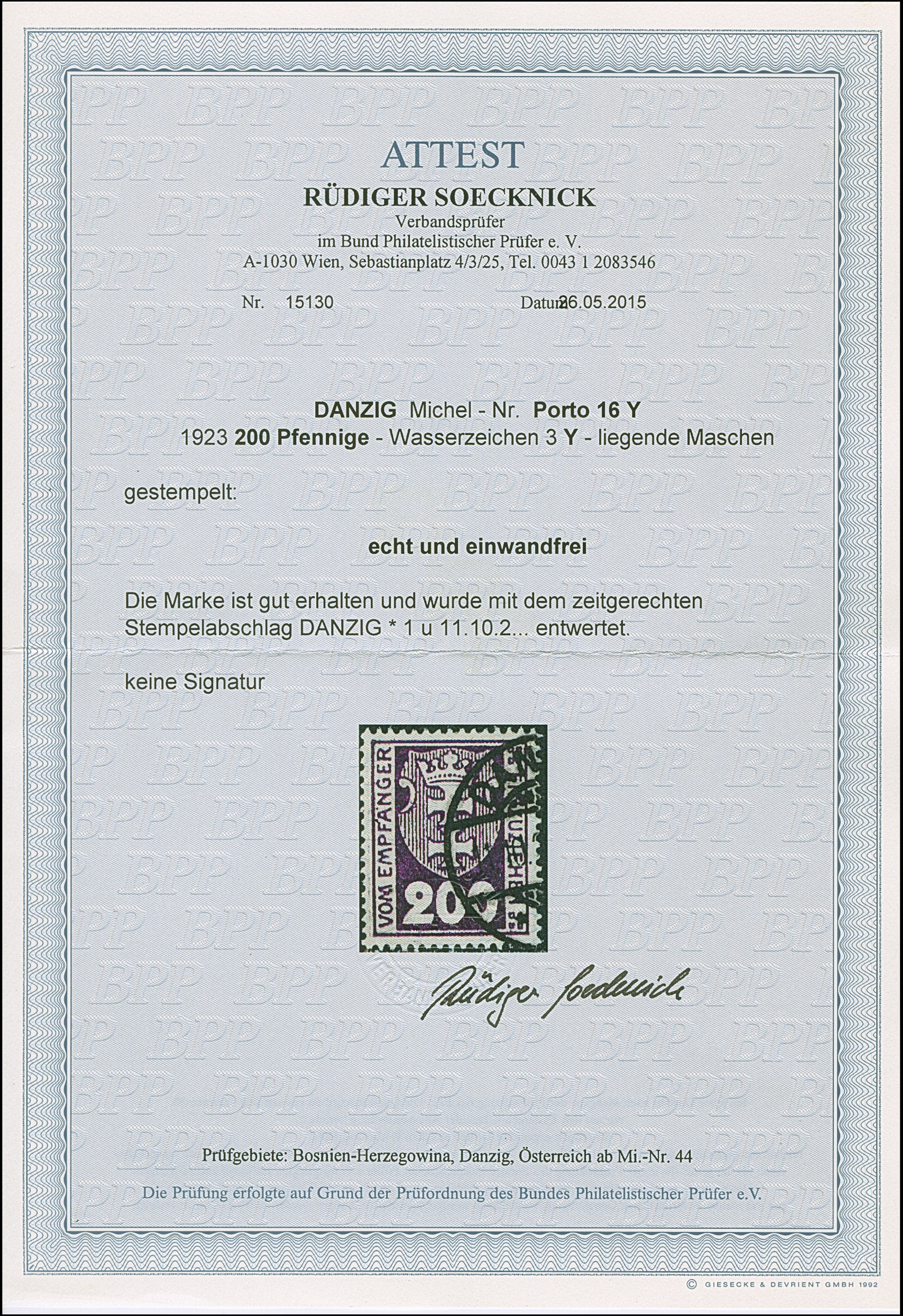 1923, 100000 auf 20 Mark, glänzender Aufdruck, farbfrisch und gut gezähnt, sauber und klar, zeitgerecht gestempelt “DANZIG 20.10.23”, tadellos, u.a. sign. Infla sowie Gruber BPP mit Fotoattest (2019)