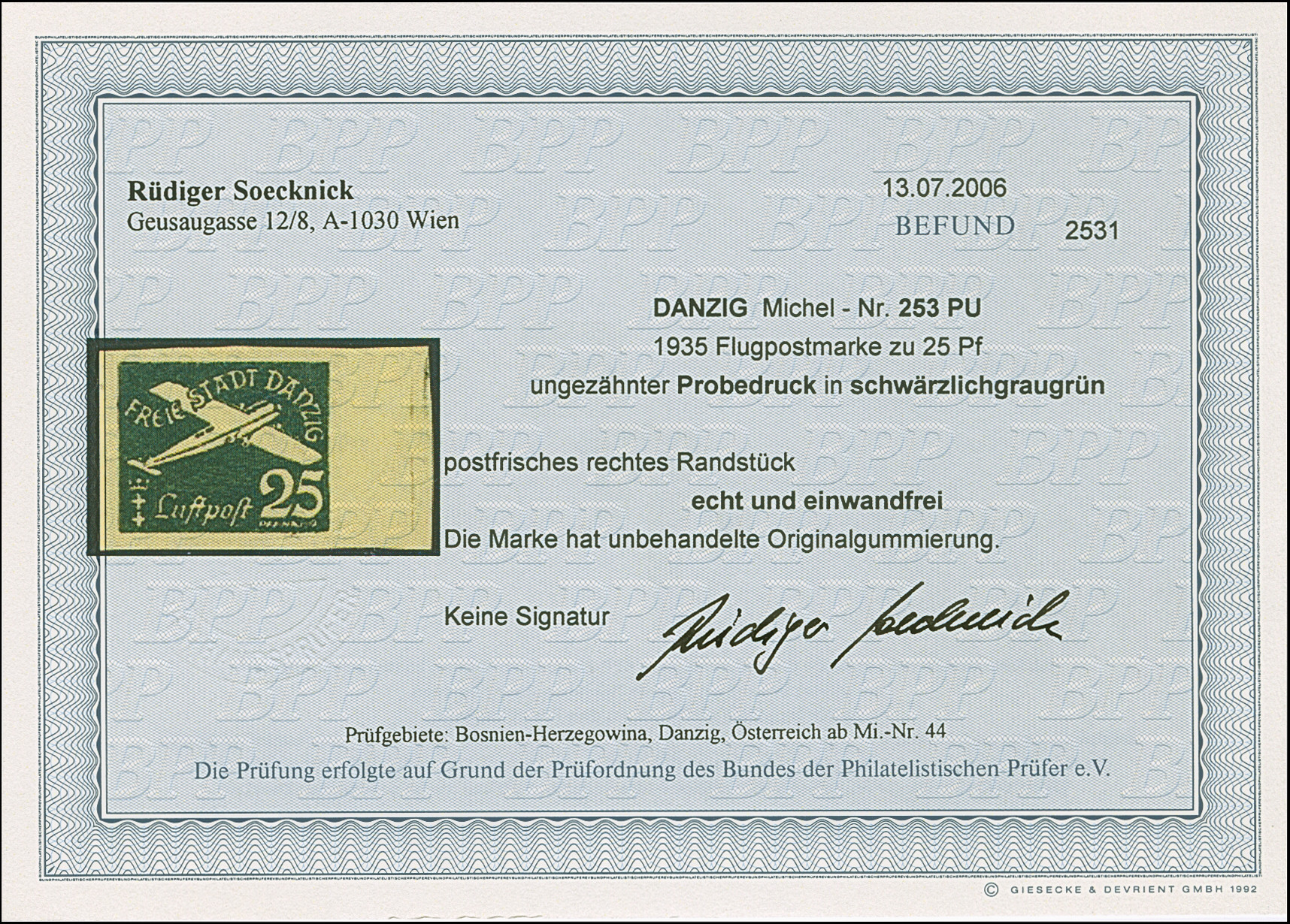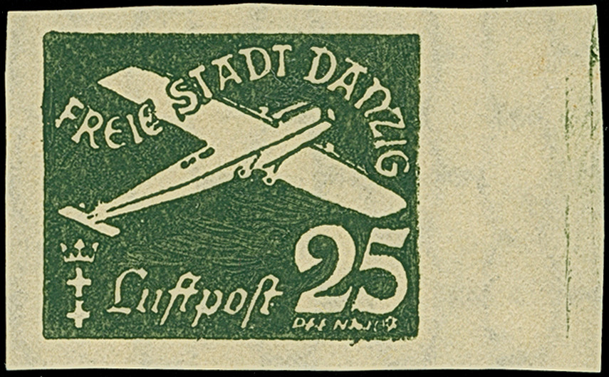 1935, Flugpost 25 Pfennig schwärzlichgraugrün, ungezähnter Probedruck mit rechtem Seitenrand, postfrisch, tadellos. Eine sehr seltene Marke, ProFi hat keine Handvoll Stücke registriert, unsigniert mit Befund Soecknick BPP (2006)