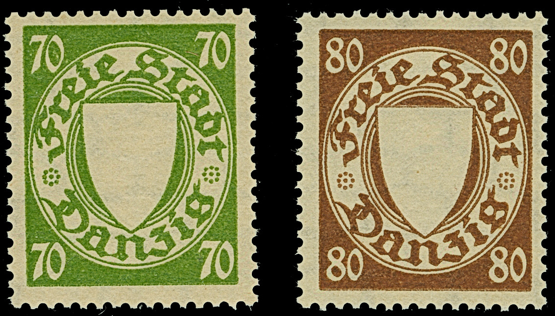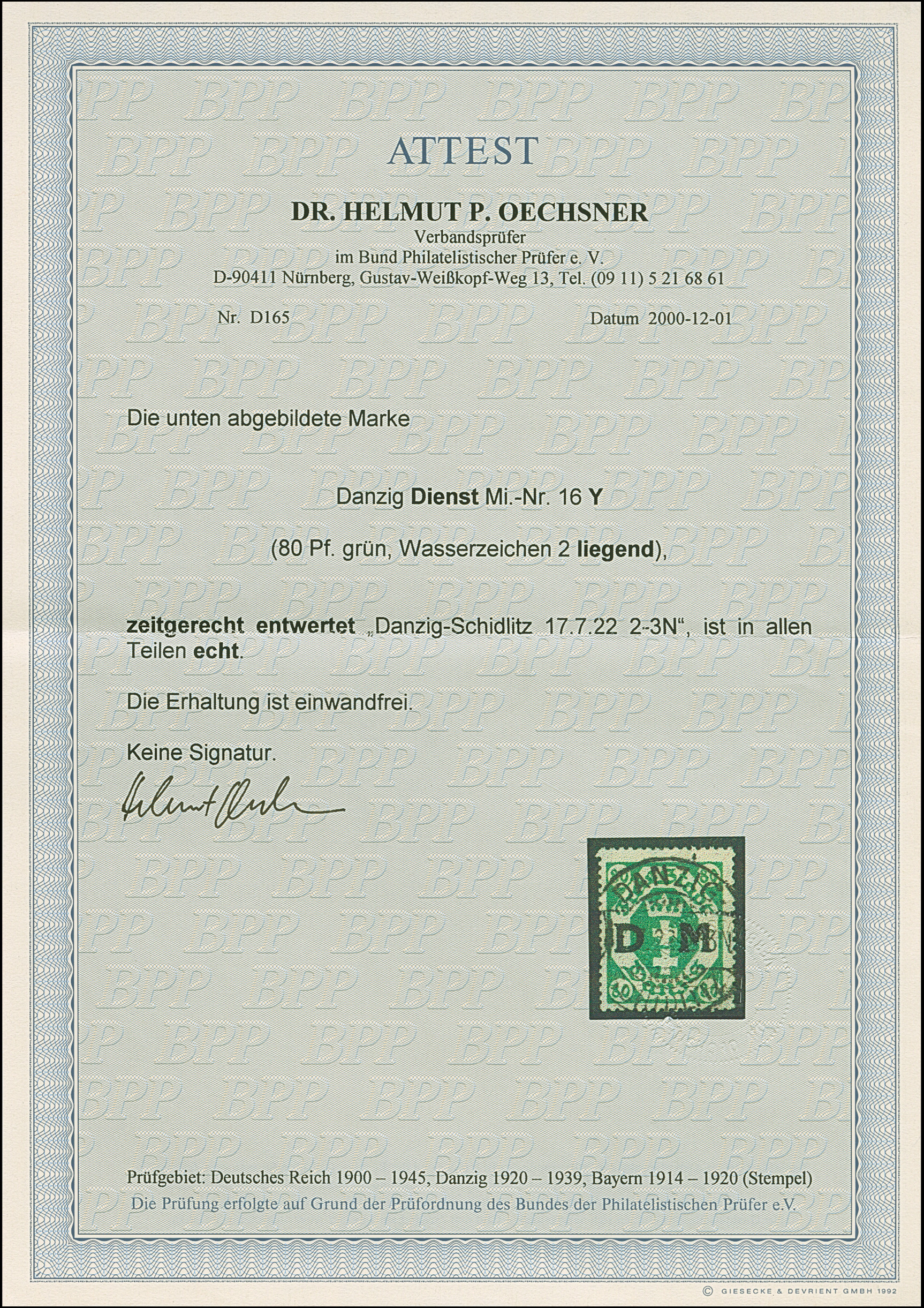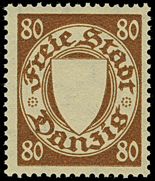 1922, Staatswappen 80 Pfennig, liegendes Wasserzeichen, farbfrisch und gut gezähnt, sehr schön zentrisch, zeitgerecht gestempelt “DANZIG-SCHIDLITZ 17.7.22”, tadellos, Fotoattest Oechsner BPP (2000)