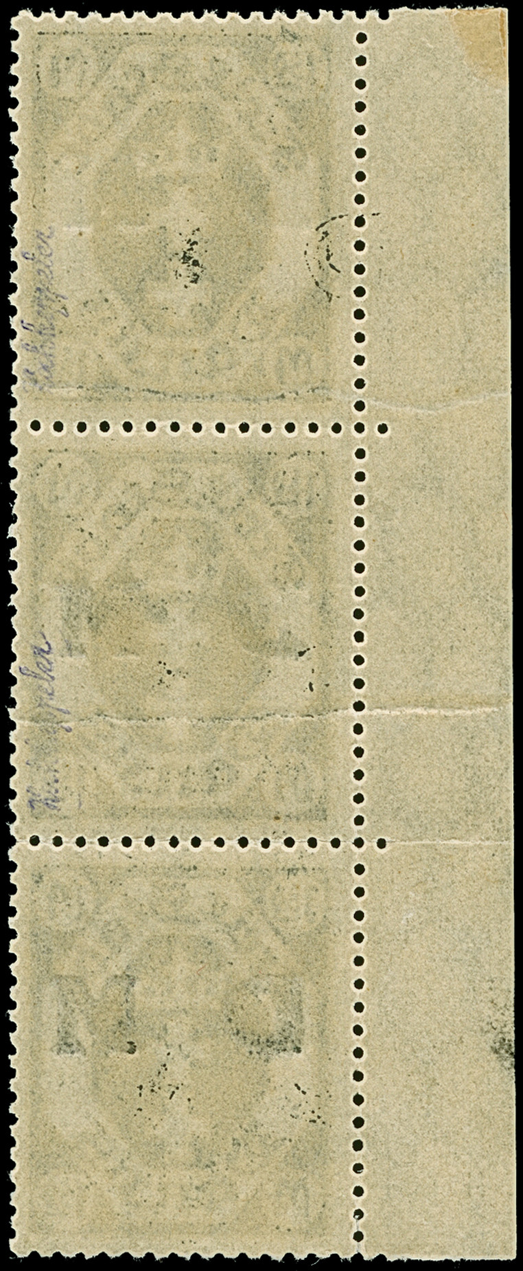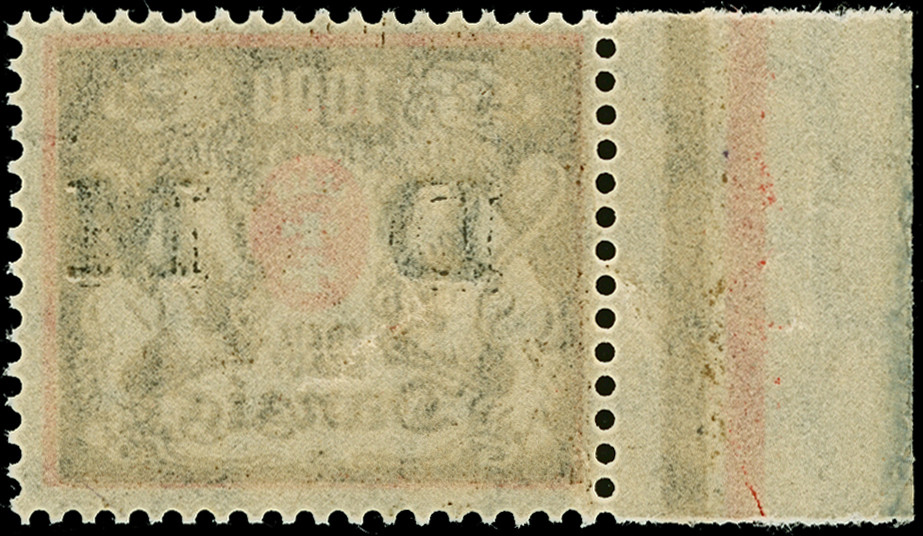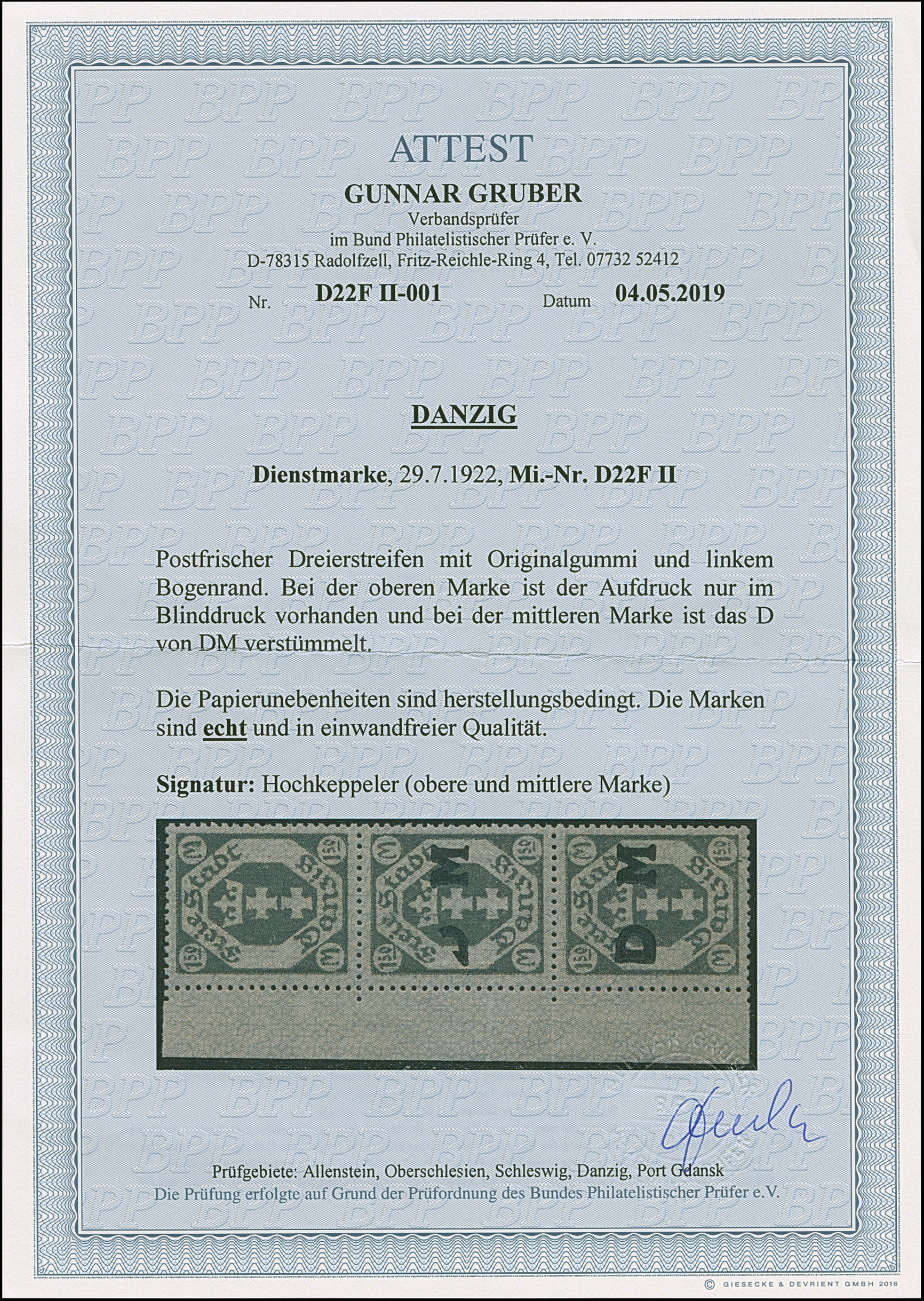 1921, Staatswappen 1,50 Mark, senkrechter Dreierstreifen mit linkem Seitenrand, die obere Marke ohne Aufdruck (nur im Blinddruck), die mittelere Marke mit “verstümmeltem D”, die untere mit Normalaufdruck, postfrisch, tadellos, sign. Hochkeppeler sowie Fotoattest Gruber BPP (2019)