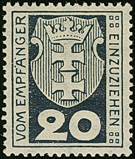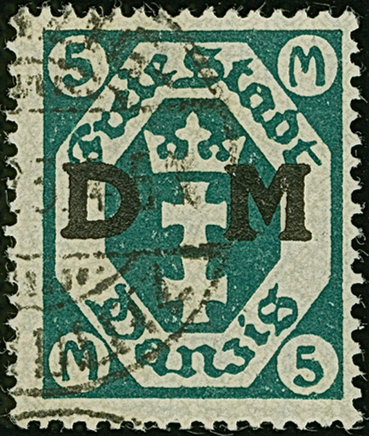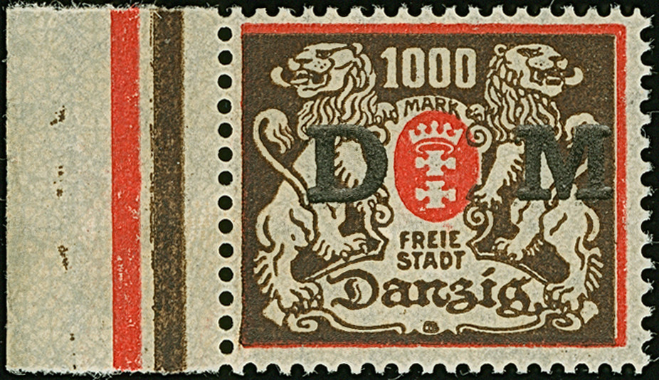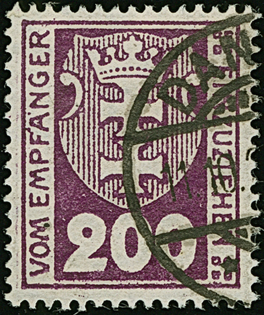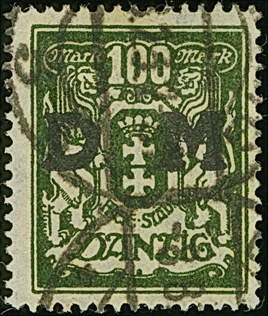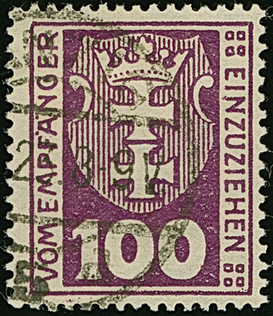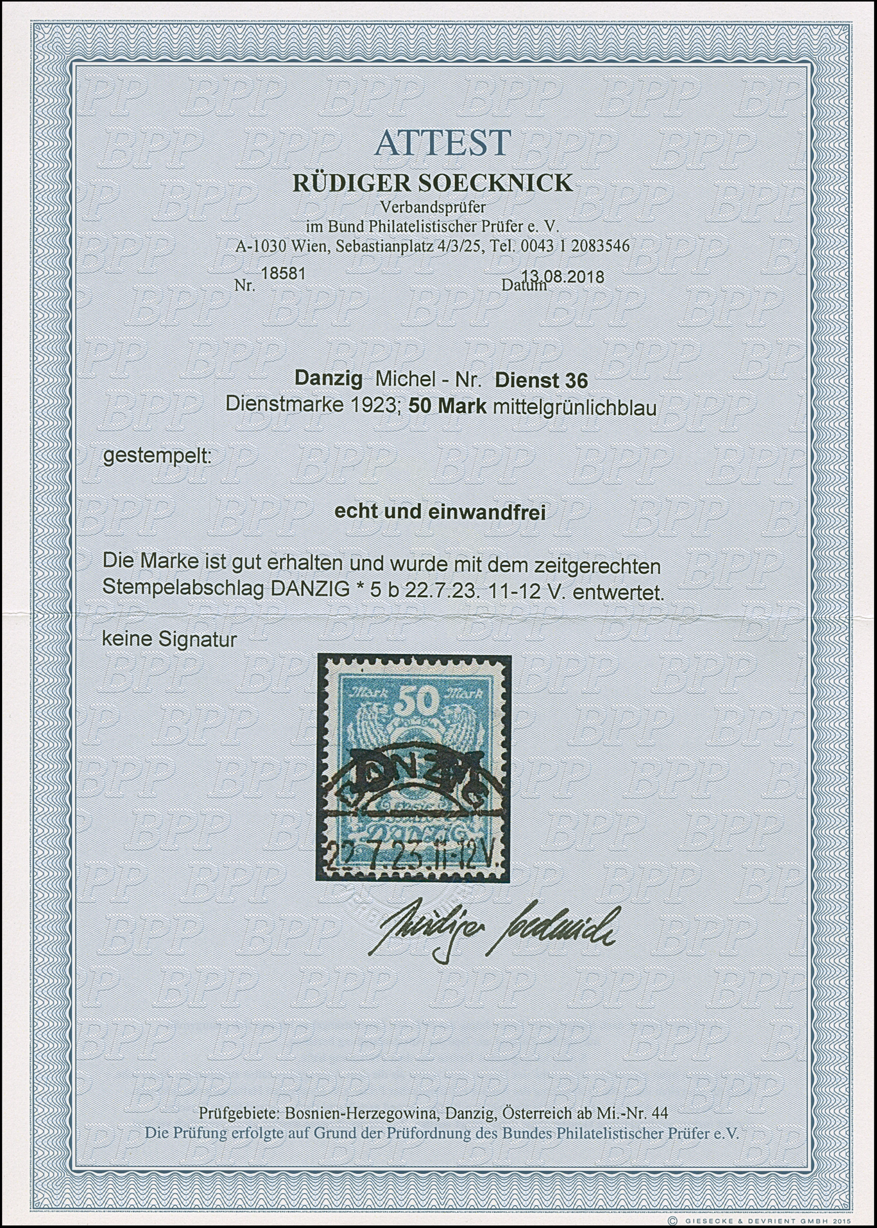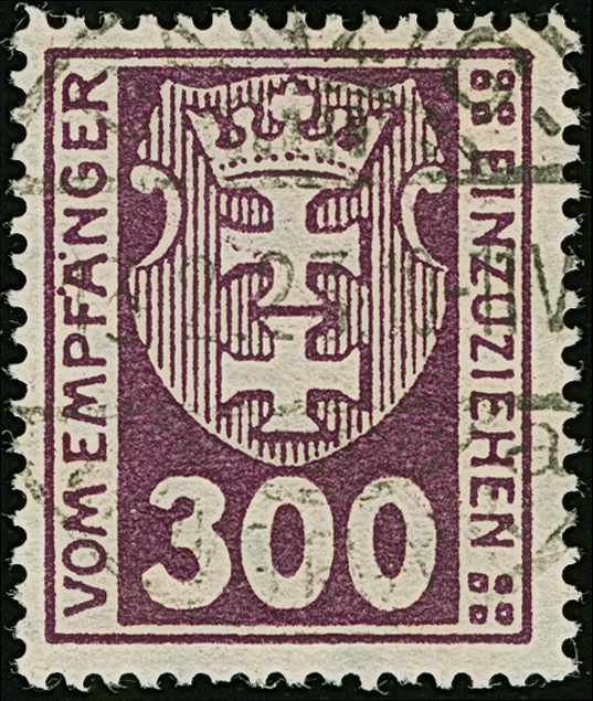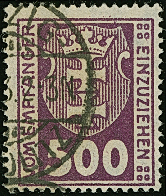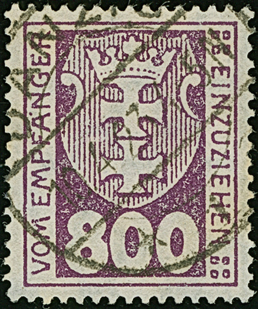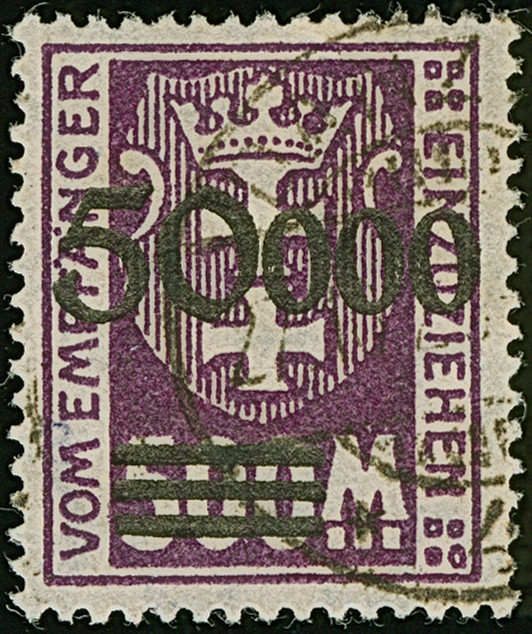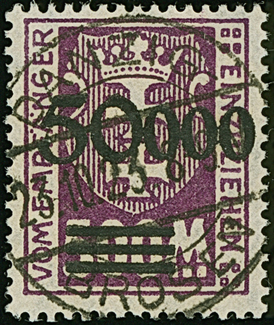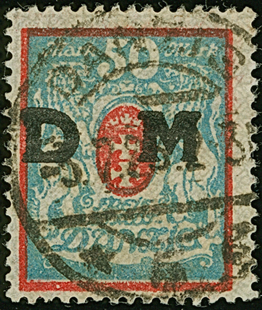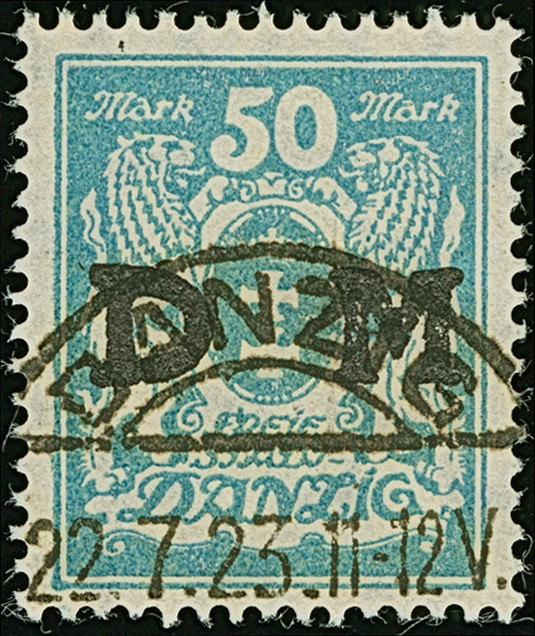 1923, Staatswappen 50 Mark, farbfrisch und gut gezähnt, sauber zentrisch und zeitgerecht gestempelt “DANZIG 22.7.23", tadellos, ein schönes Stück dieser seltenen Marke, Fotoattest Soecknick BPP (2018)