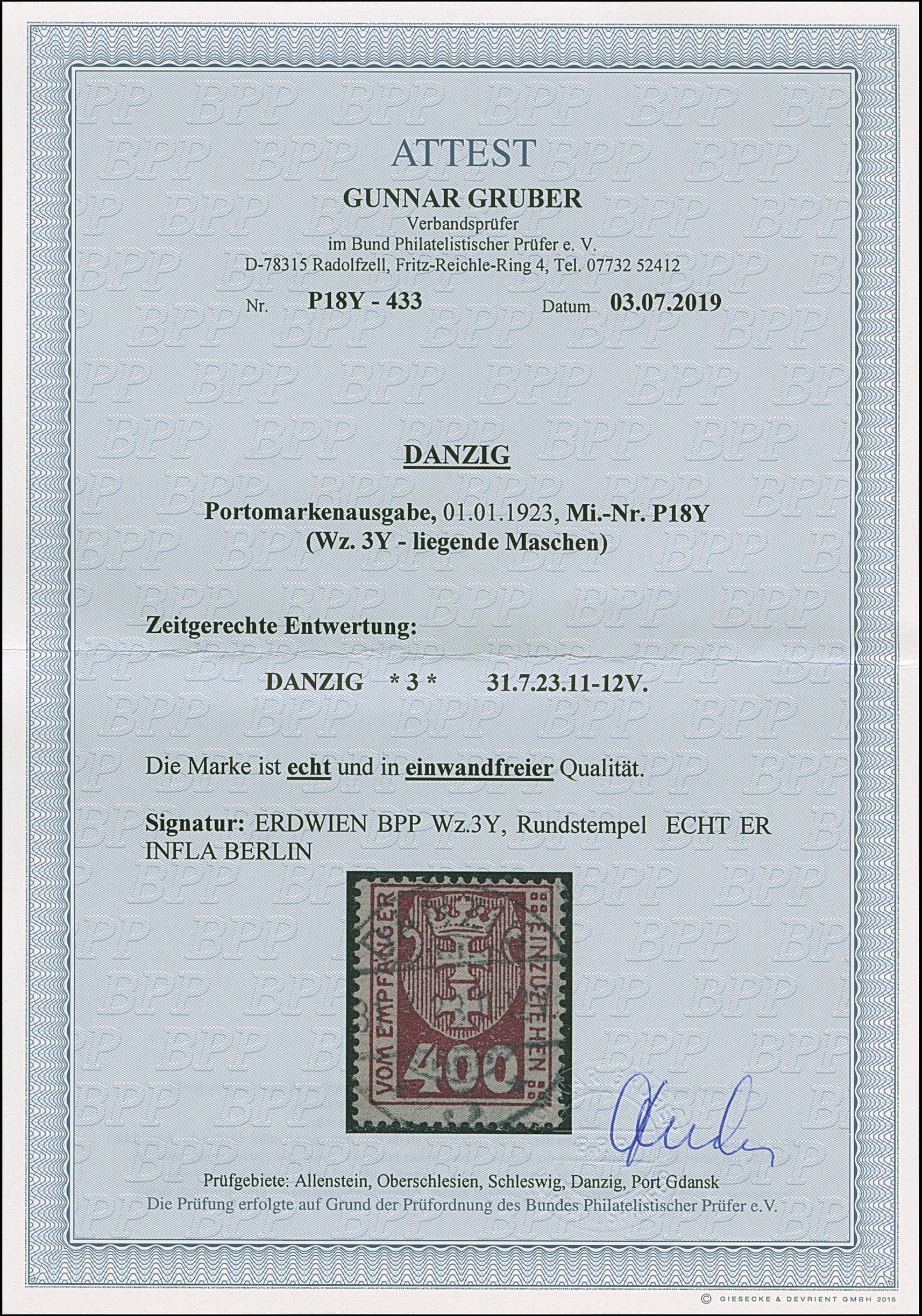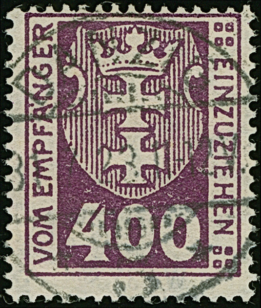 1923, Staatswappen 400 Mark, liegendes Wasserzeichen, farbfrisch und gut gezähnt, sauber und zentrisch, zeitgerecht gestempelt “DANZIG 3 31.7.23. 11-12V”, tadellos, Fotoattest Gruber BPP (2019)