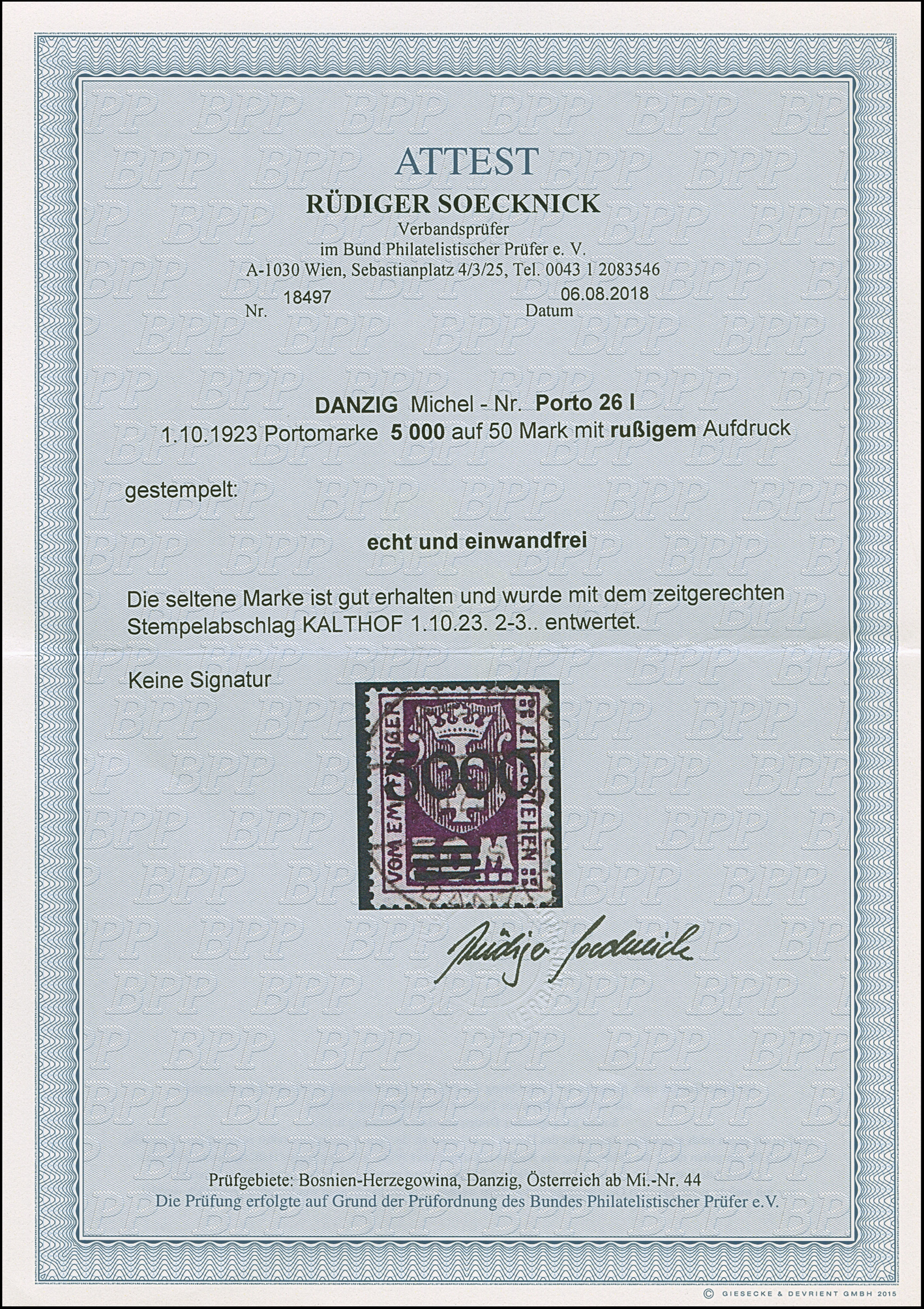 1923, 5000 auf 50 Mark, rußiger Aufdruck, farbfrisch und gut gezähnt, sauber zeitgerecht gestempelt “KALTHOF 1.10.23”, tadellos, Fotoattest Soecknick BPP (2018)