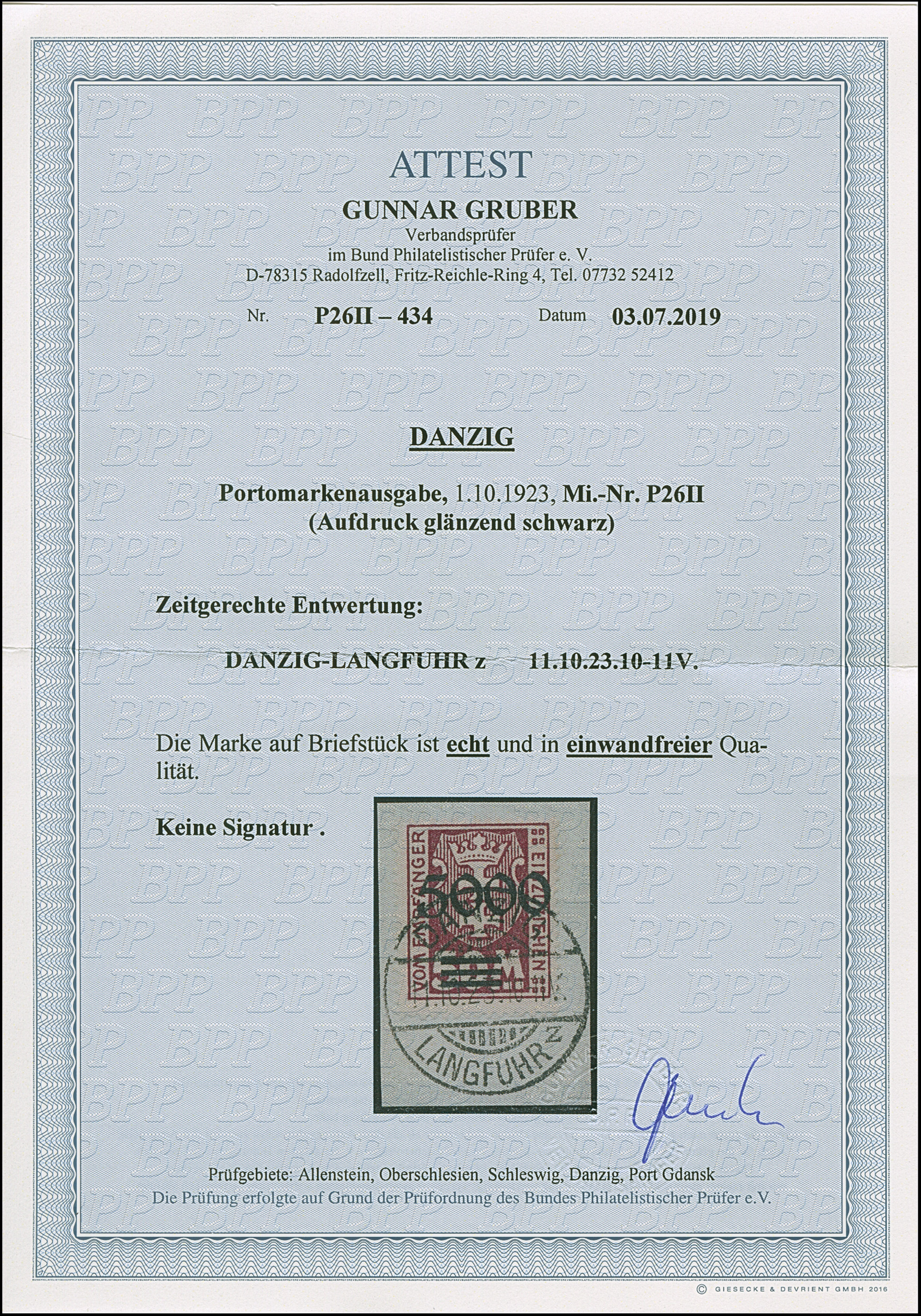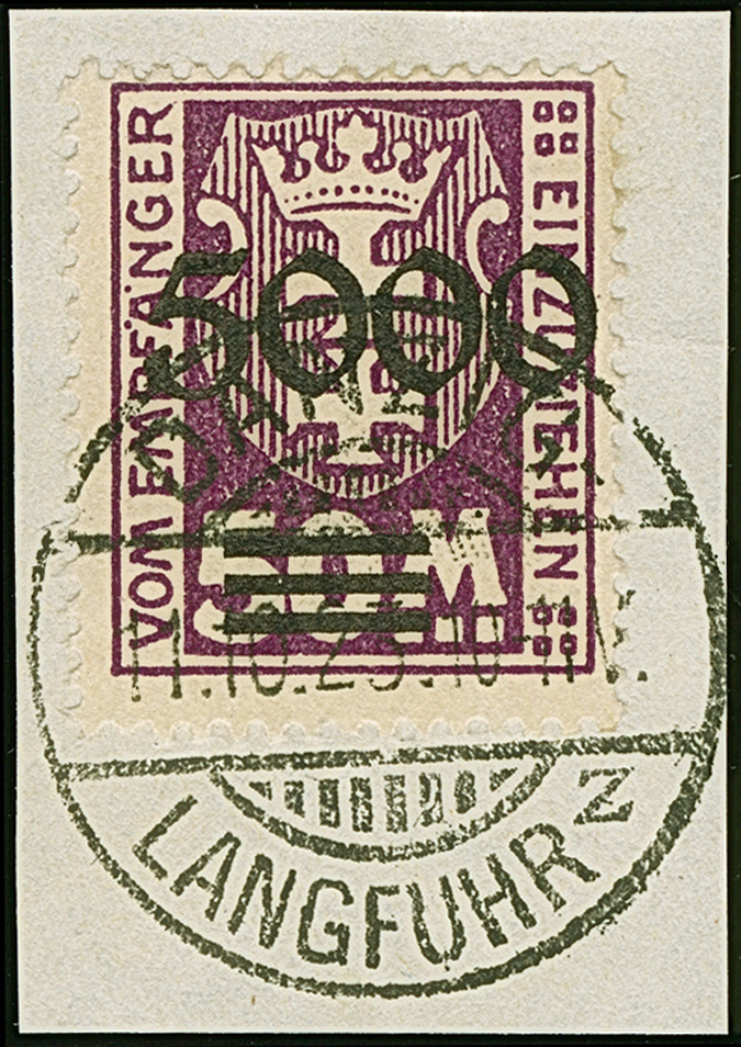 1923, 5000 auf 50 Mark, glänzender Aufdruck, farbfrisch und gut gezähnt, sauber mit zeitgerechtem Stempel “DANZIG-LANGFUHR 11.10.23” auf Briefstück, tadellos, Fotoattest Gruber BPP (2019)