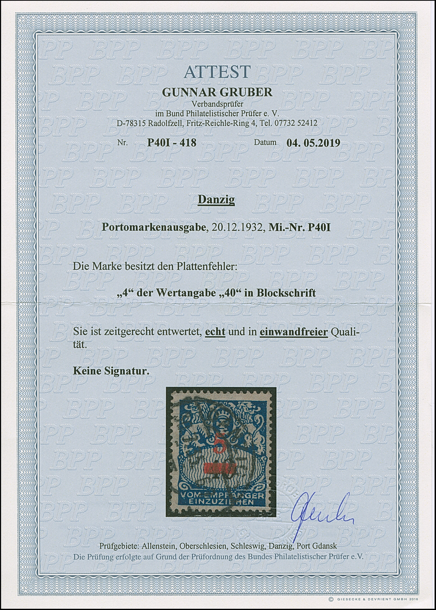 1932, Staatswappen 5 auf 40 Pfennig, mit Plattenfehler “4 der Wertangabe in Blockschrift”, sauber zeitgerecht gestempelt, tadellos, Fotoattest Gruber BPP (2019)
