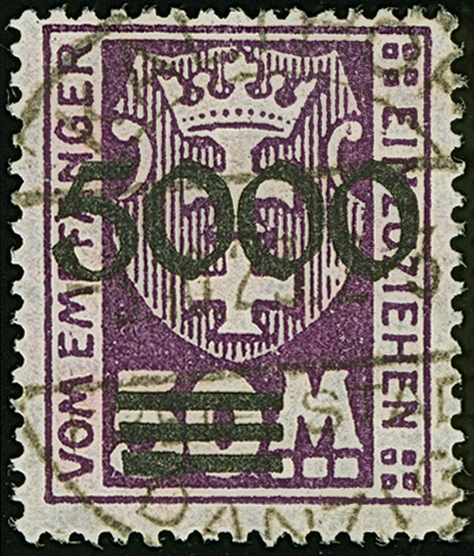 1923, 50000 auf 500 Mark, rußiger Aufdruck, farbfrisch und gut gezähnt, sauber zeitgerecht gestempelt “DANZIG-BRÖSEN 23.10.23”, tadellos, Fotoattest Gruber BPP (2019)