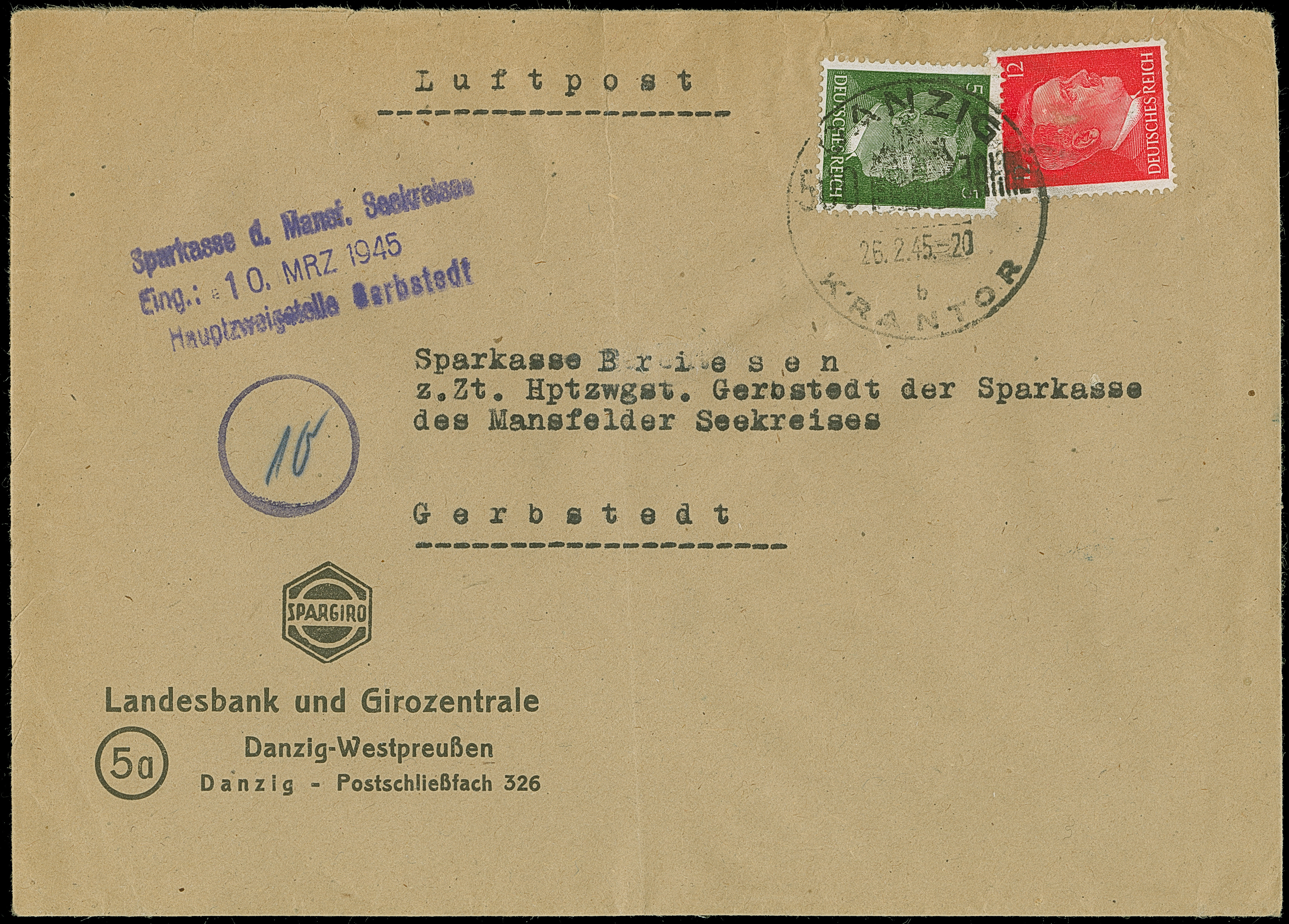 1945, Hitler 5 und 12 Pfennig mit Sonderstempel “DANZIG KRANTOR 26.2.45” auf Luftpost-Vordruckbriefumschlag des Landesbank und Girozentrale nach Gerbstadt, mit Luftpost aus der zwei Tage zuvor von den Sowjets eingekesselten Stadt ausgeflogen, sehr früher Kessel-Beleg, leichte Beförderungsspuren, einmal senkrecht gefaltet, sonst tadellos