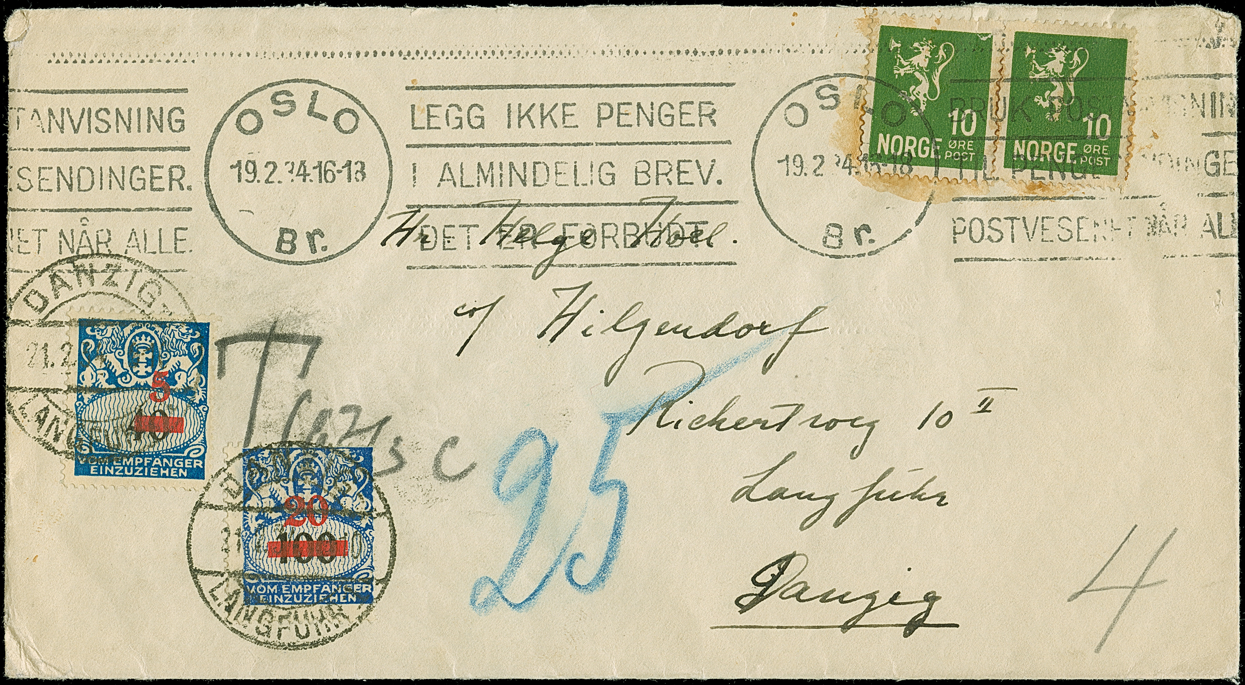 1932, 5 auf 40 Pfennig und 20 auf 100 Pfennig, sauber mit Stempel “DANZIG-LANGFUHR 21.2.34” auf unterfrankiertem Brief aus Oslo, Norwegen, gute Erhaltung