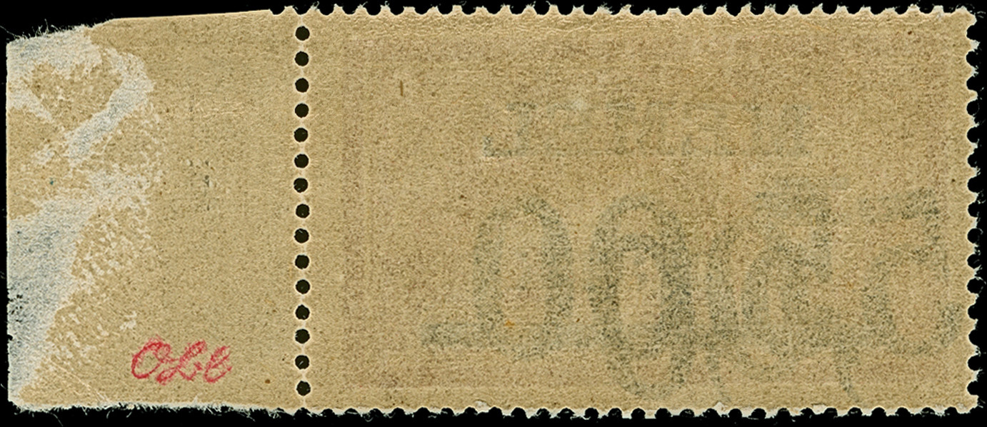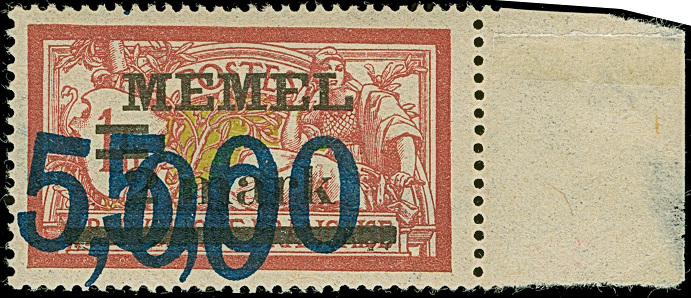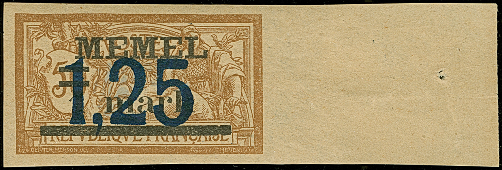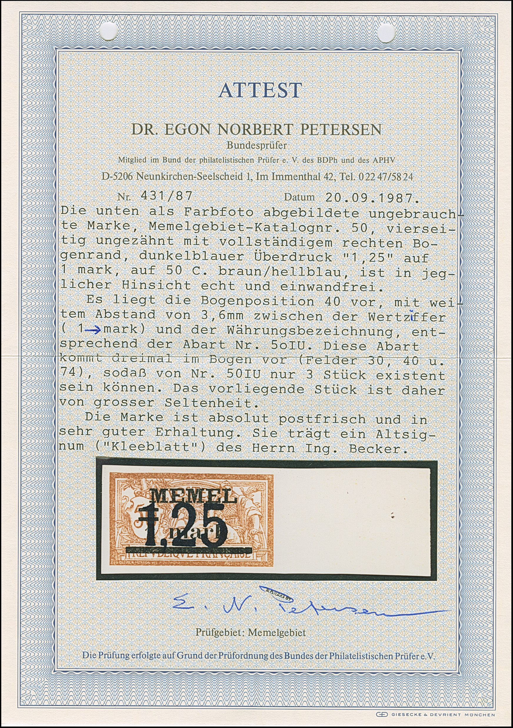 1922, 1,25 auf 1m auf 50 C., farbfrisch und allseits breitrandig ungezähntes rechtes Seitenrandrand von Feld 40, mit Aufdruckfehler "weiter Abstand zwischen 1 und mark", postfrisch, tadellos. Mit einer Auflage von lediglich 3 möglichen Exemplaren eine der großen Seltenheiten, sign. Ing. Becker sowie Fotoattest Dr. Petersen BPP (1987)