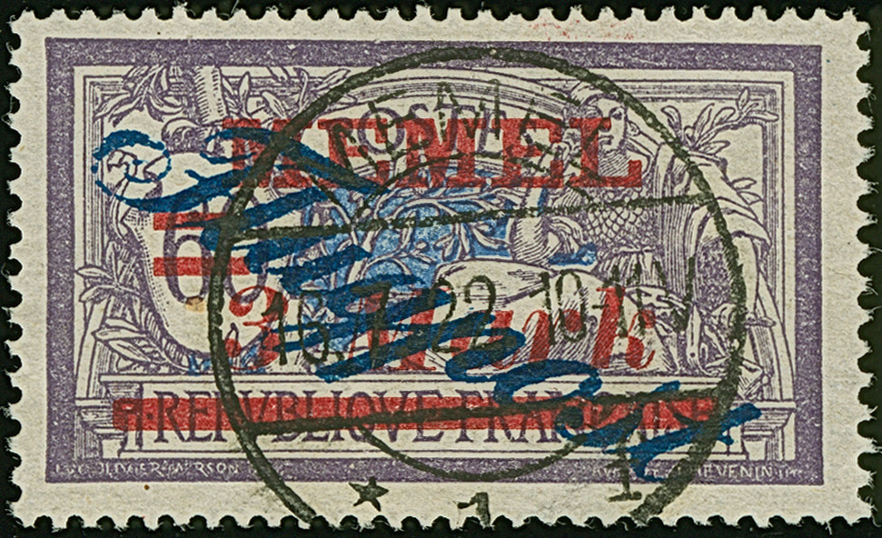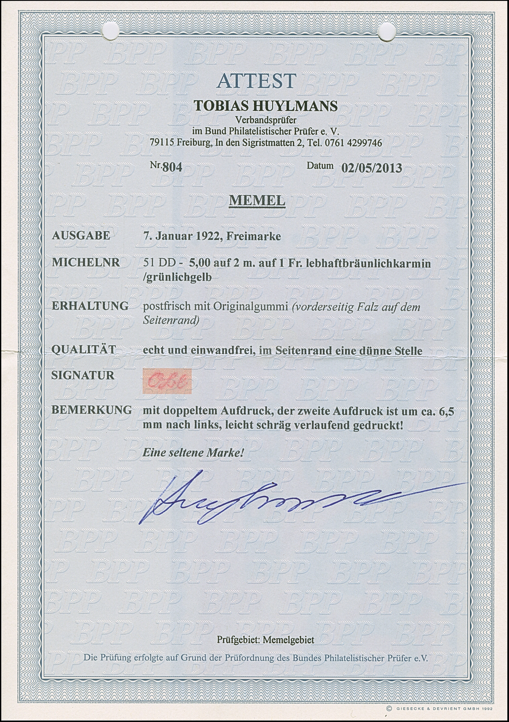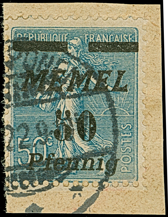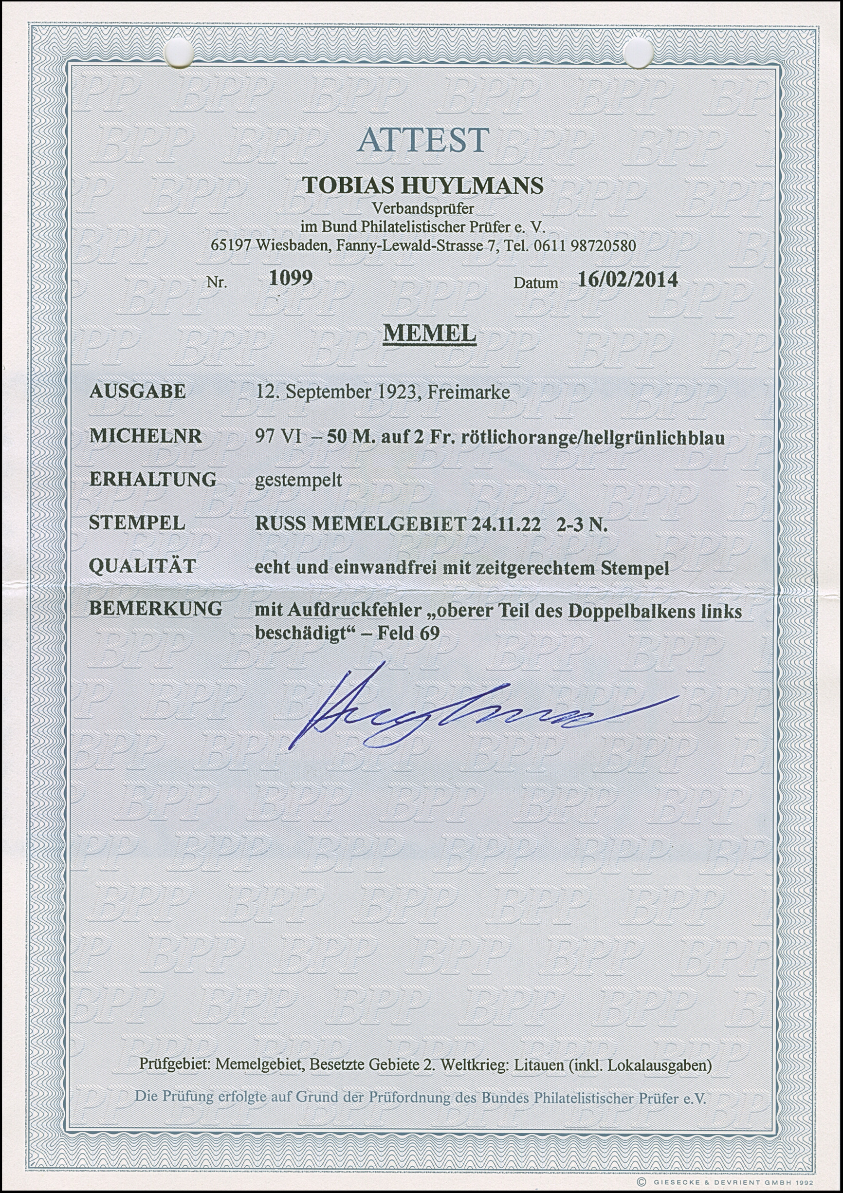 1922, Freimarke 50 Mark auf 2 Franc, mit Aufdruckfehler “oberer Teil des Doppelbalkens links beschädigt”, farbfrisch und gut gezähnt, sauber zentrisch gestempelt “RUSS 24.11.22”, tadellos, Fotoattest Huylmans BPP (2014)