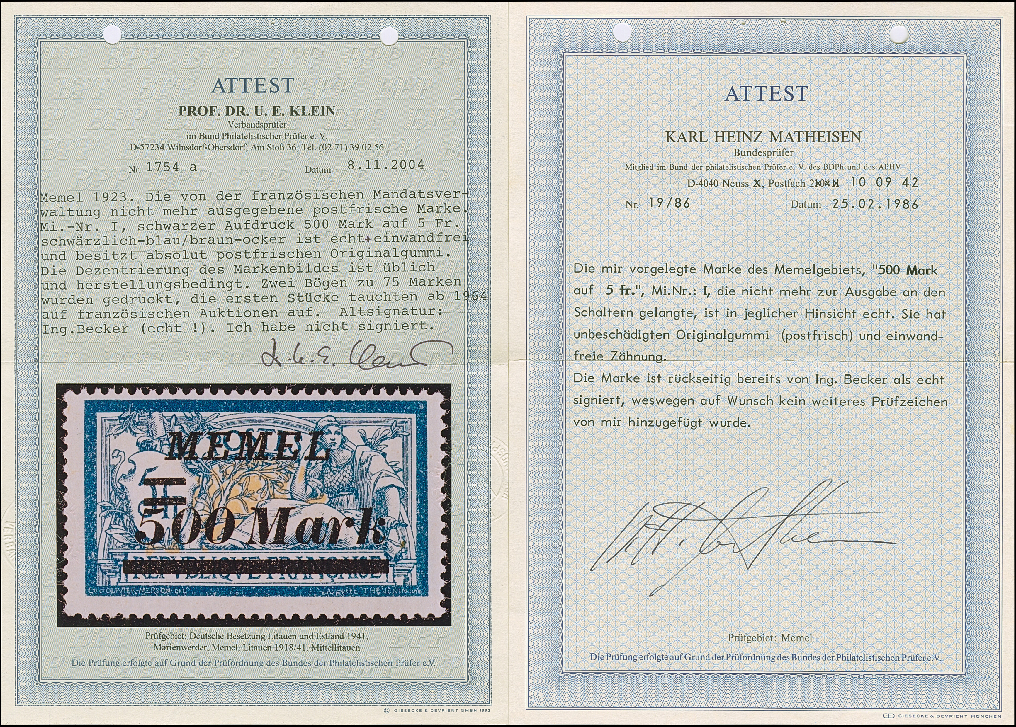 Nicht ausgegebene Marke: 1923, Freimarke 500 Mark auf 5 Francs schwärzlichblau/hellbraunocker, postfrisch, tadellos, ausgabetypisch gezähnt, sign. Ing. Becker sowie Fotoattest Klein BPP (2004)