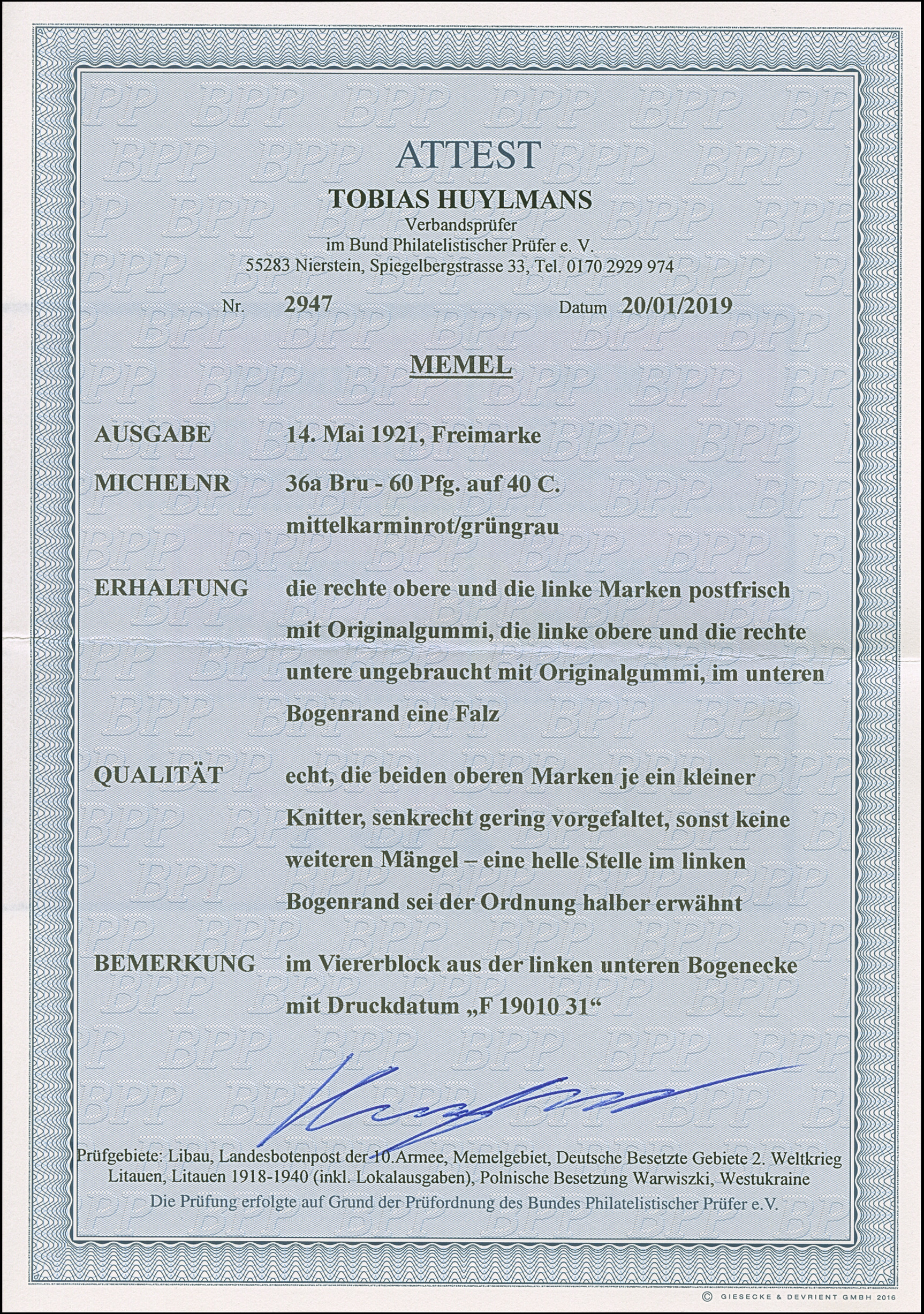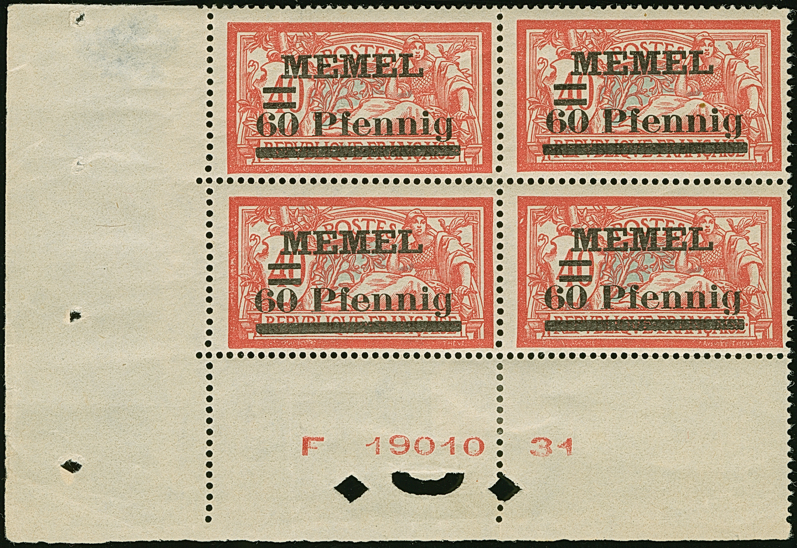 1921, 60 Pfennig auf 40 Centimes mittelkarminrot/grüngrau, Viererblock aus der linken unteren Bogenecke mit komplettem Druckdatum "F 19010 31", zwei Werte postfrisch, zwei ungebraucht, Falz im unteren Bogenrand, kleine helle Stelle nur im Rand, die beiden oberen Marken je ein kleiner Knitter, senkrecht gering vorgefaltet, sonst tadellos, eine sehr seltene Einheit, Fotoattest Huylmans BPP (2019)