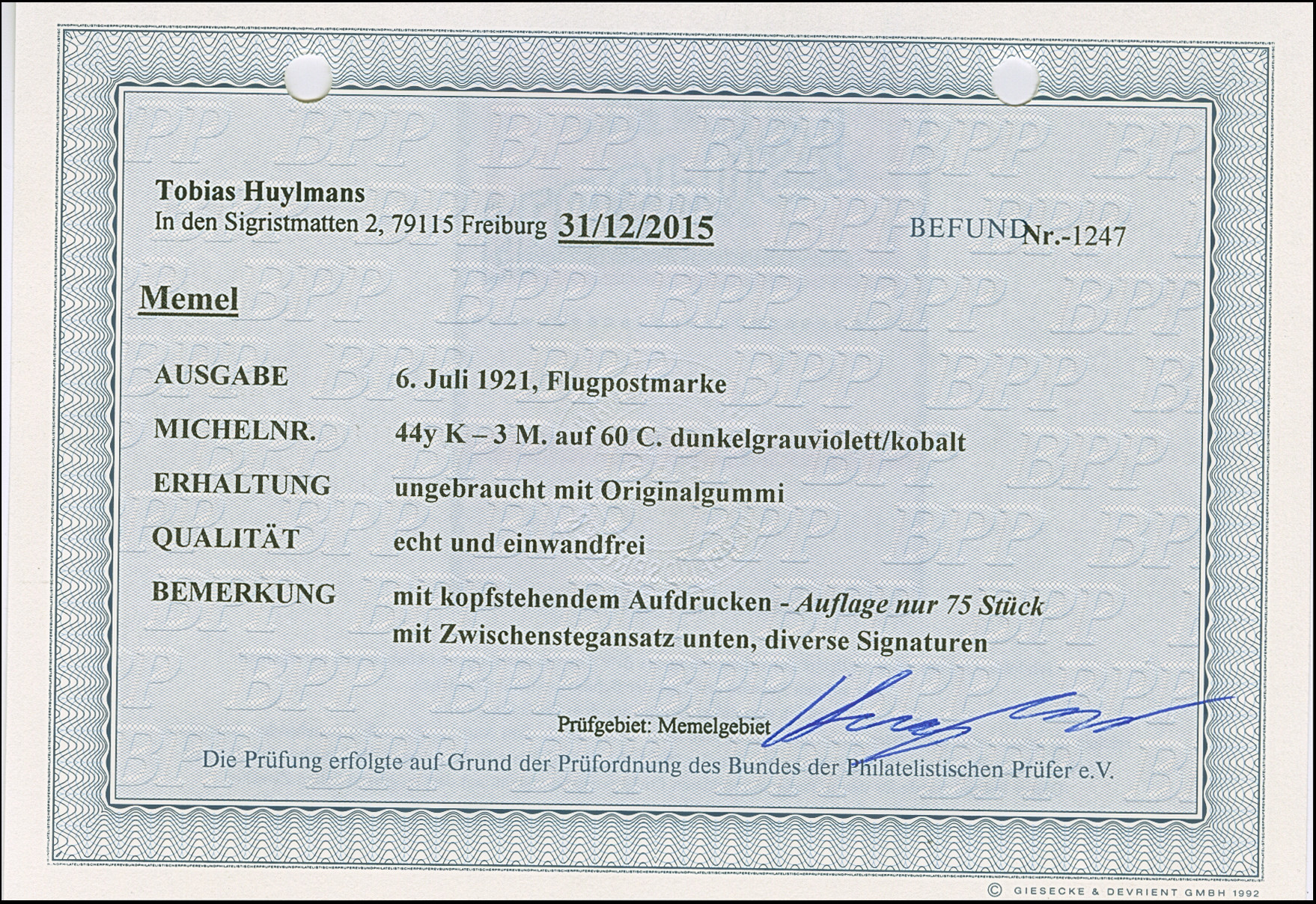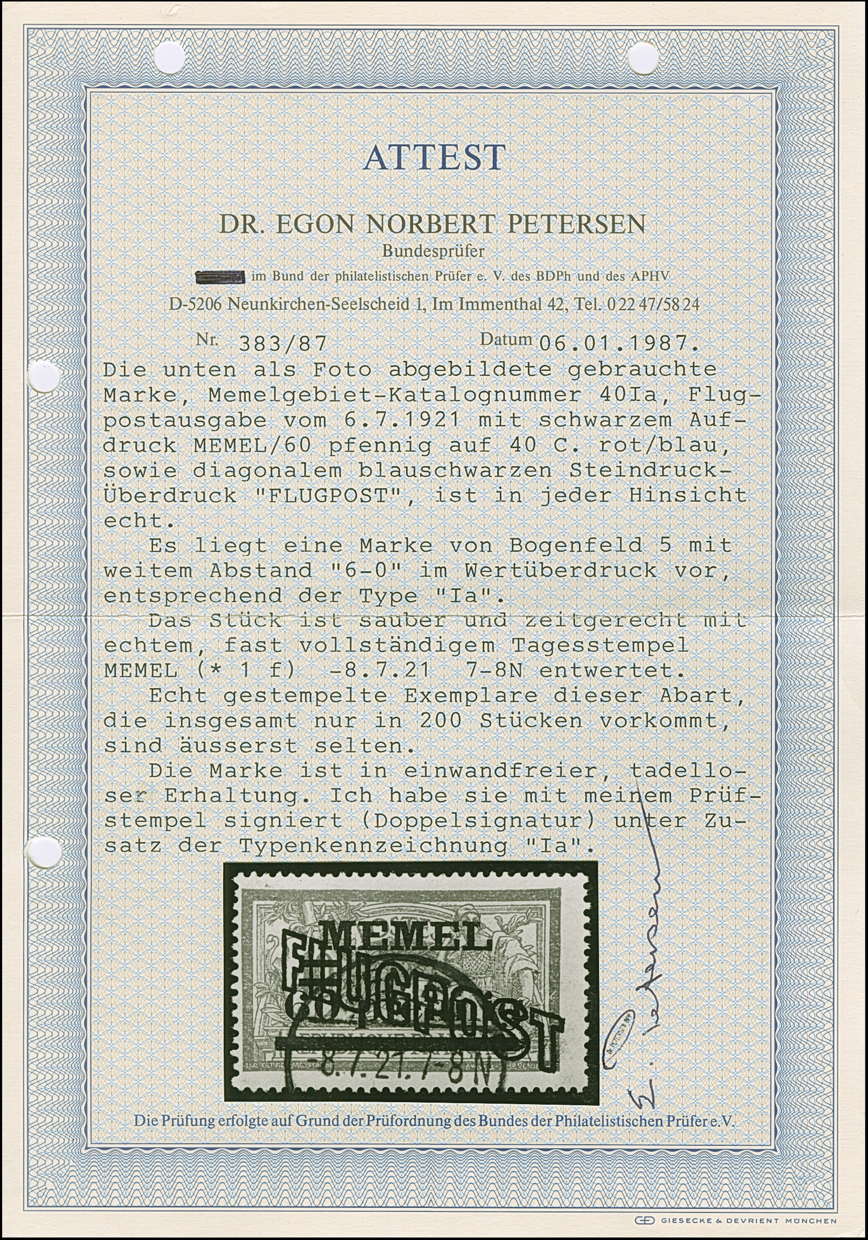 1921, Flugpost 60 pfennig auf 40 Centimes, mit Aufdruckfehler “weiter Abstand zwischen 6-0 im Wertüberdruck", farbfrisch, ausgabetypisch gezähnt, sauber gestempelt, tadellos, eine seltene Marke, sign. Dr. Petersen BPP mit Fotoattest (1987)