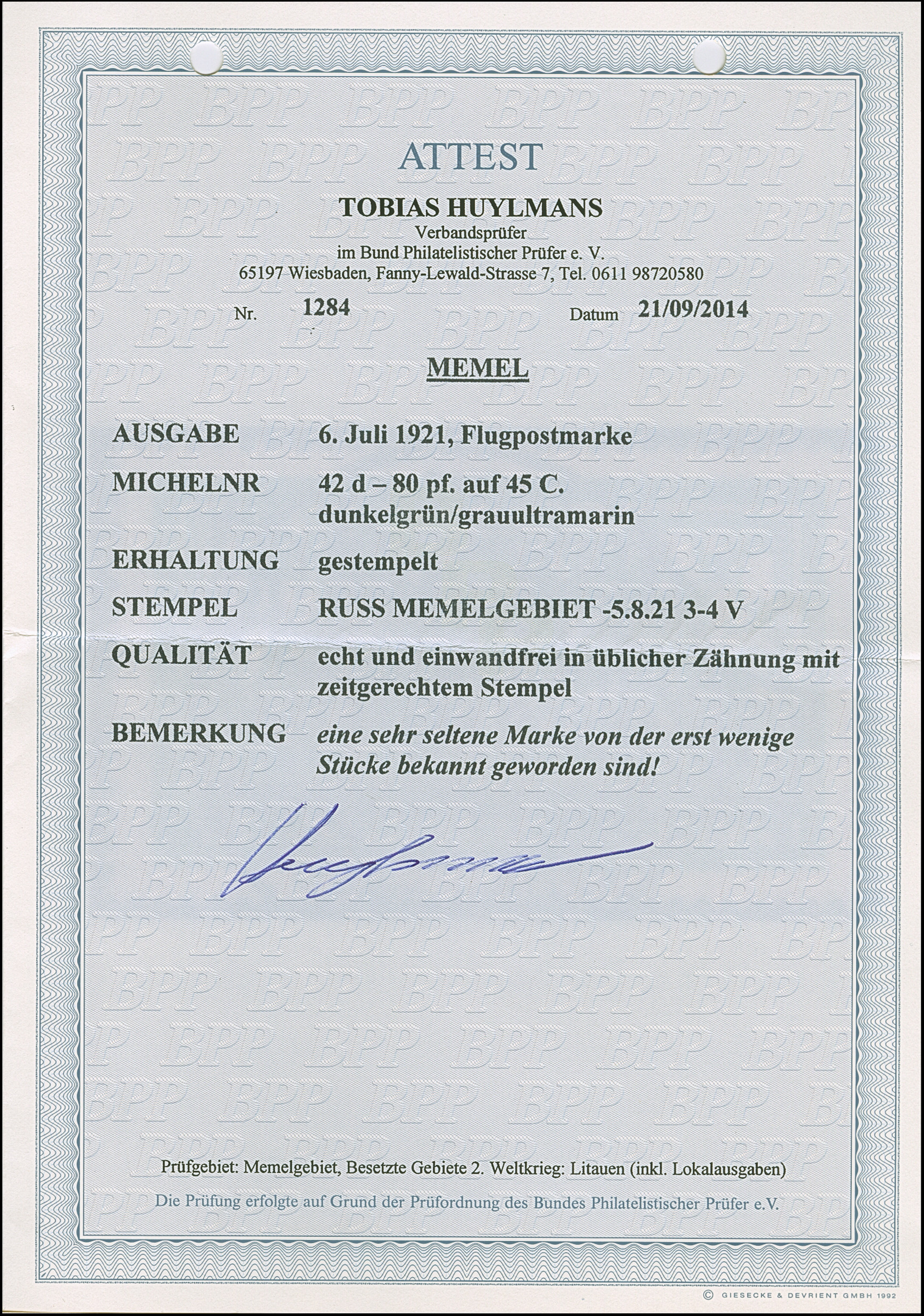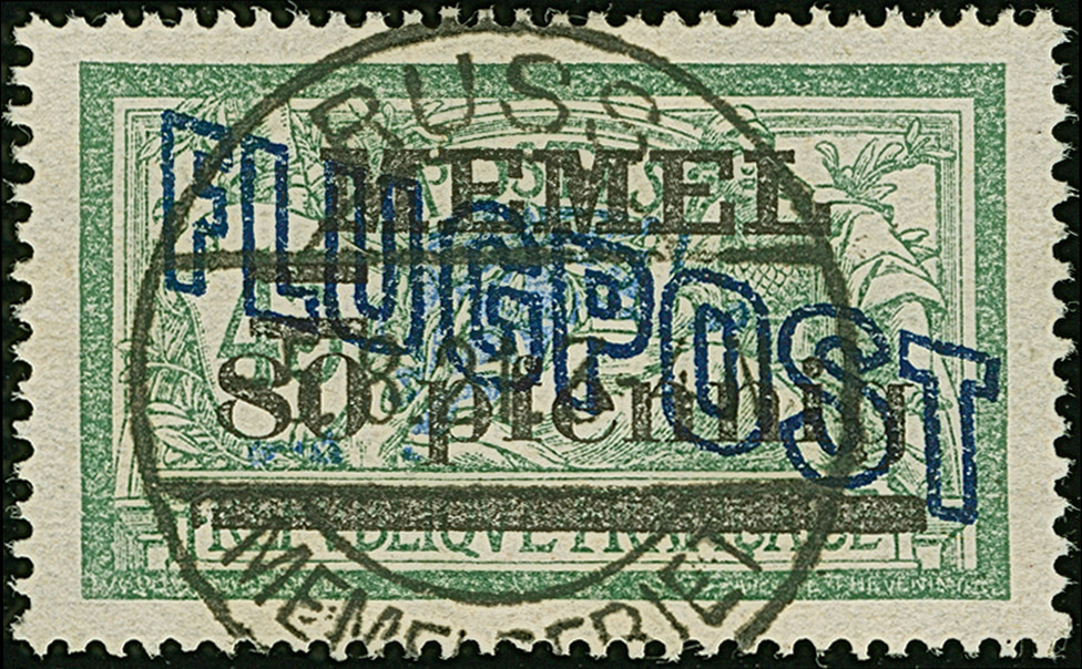 1921, Flugpost 80 pfennig auf 45 Centimes dunkelgrün/grauultramarin auf GC-Papier, farbfrisch und ausgabetypisch gezähnt, sauber mit vollem Stempel “RUSS MEMELGEBIET -5.8.21” entwertet, tadellos, eine seltene Marke, Fotoattest Huylmans BPP (2014)
