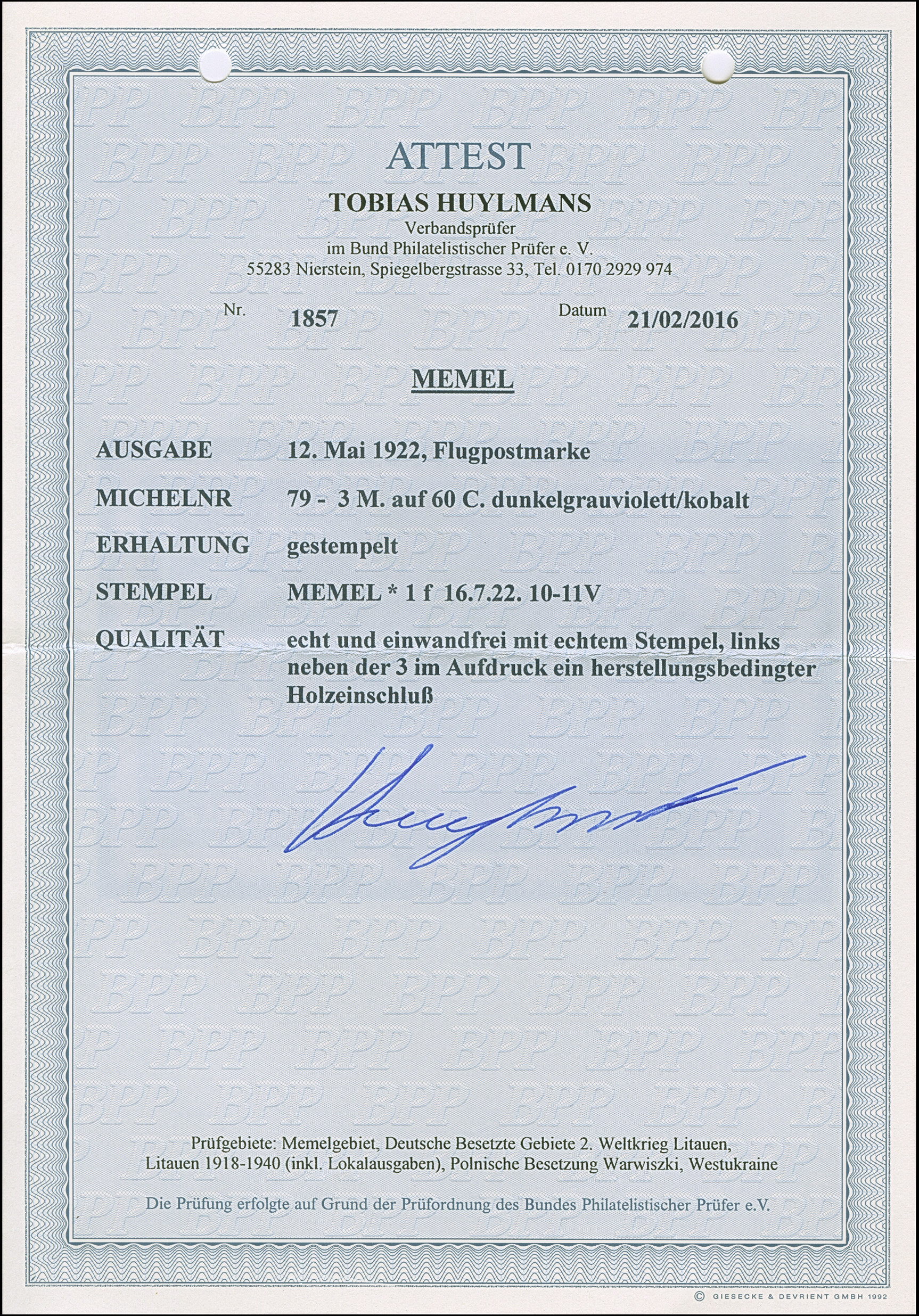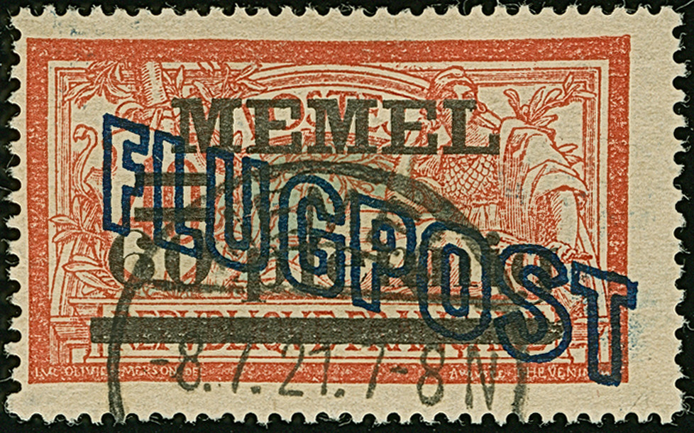 1922, Flugpost 3 Mark auf 60 Centime, farbfrisch und gut gezähnt, sauber und zentrisch gestempelt “MEMEL * 1 f 16.7.22”, kleiner Holzeinschluss, tadellos, Fotoattest Huylmans BPP (2016)