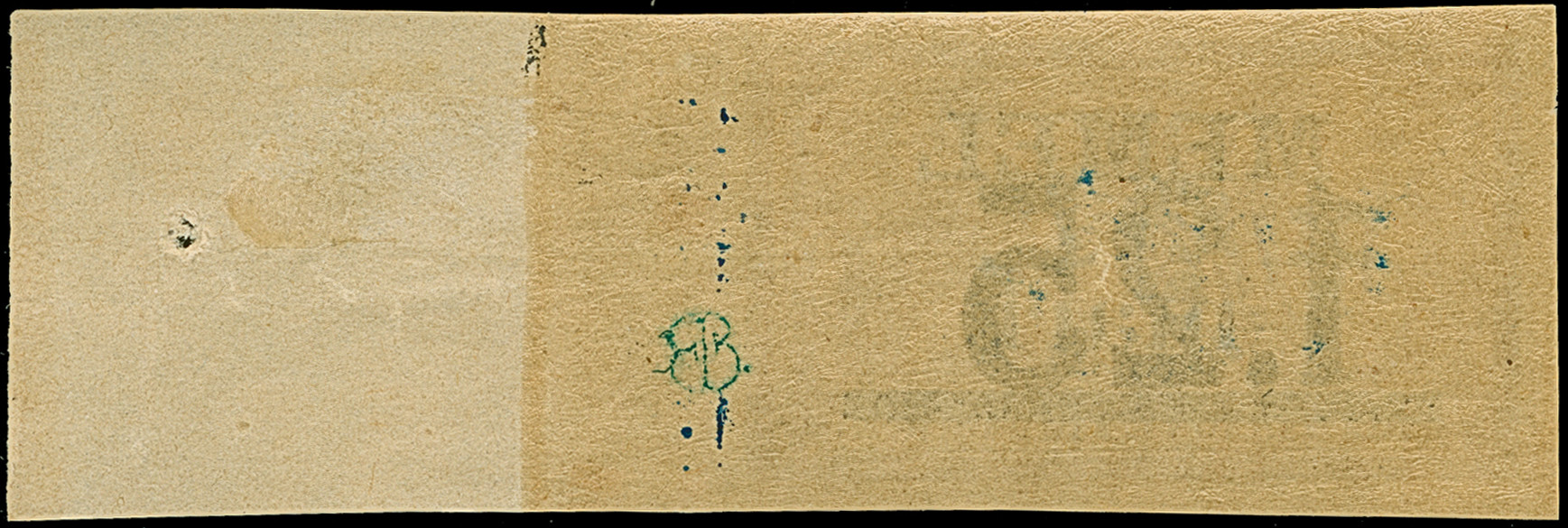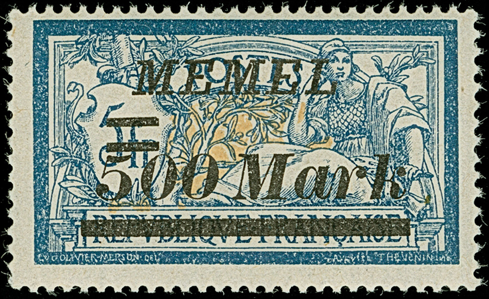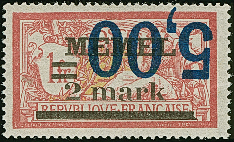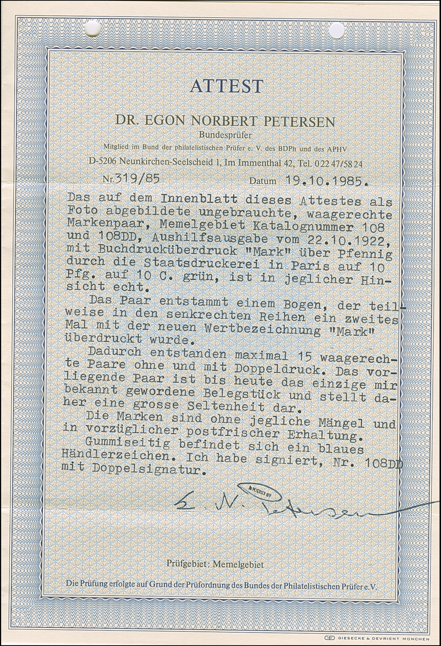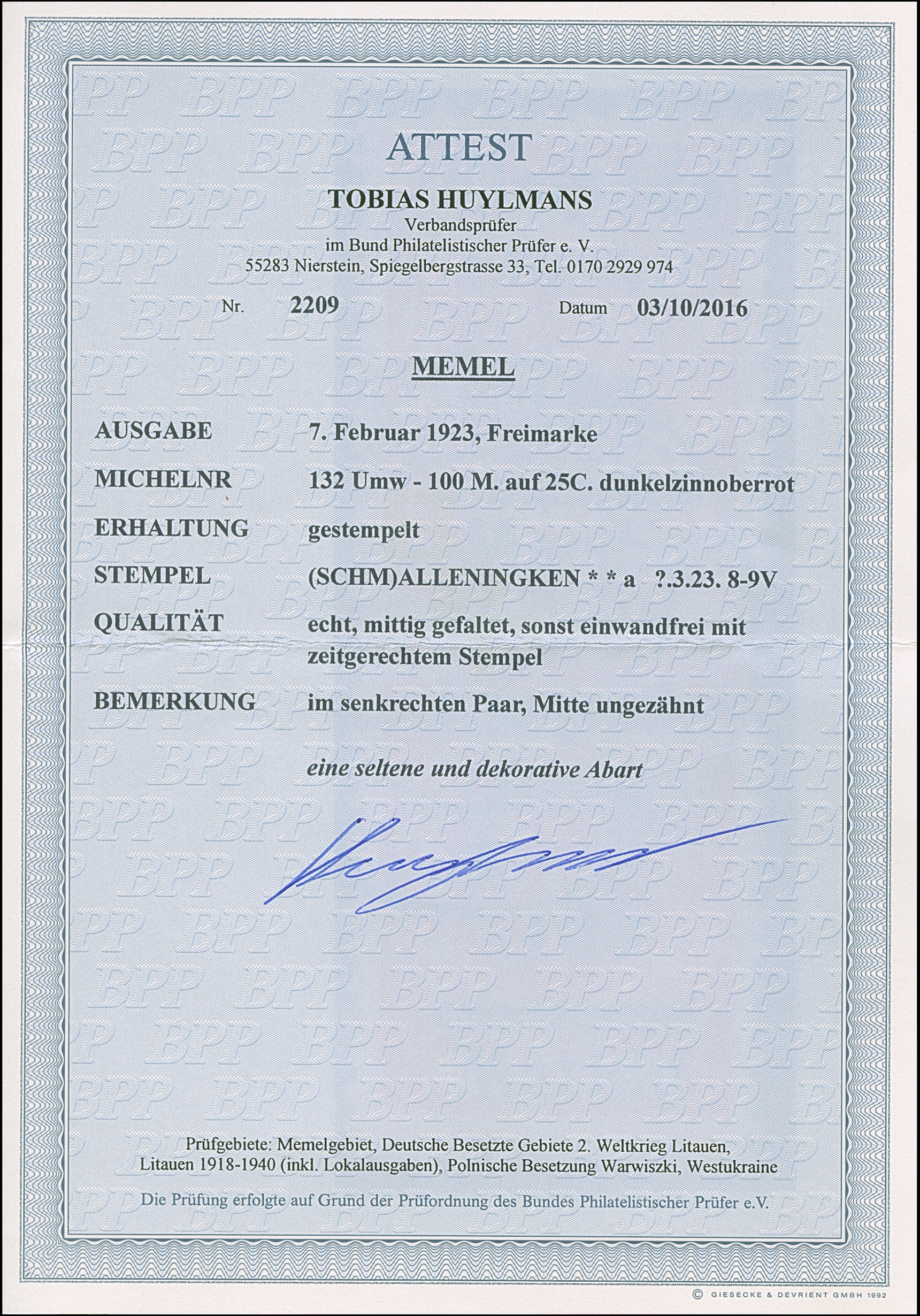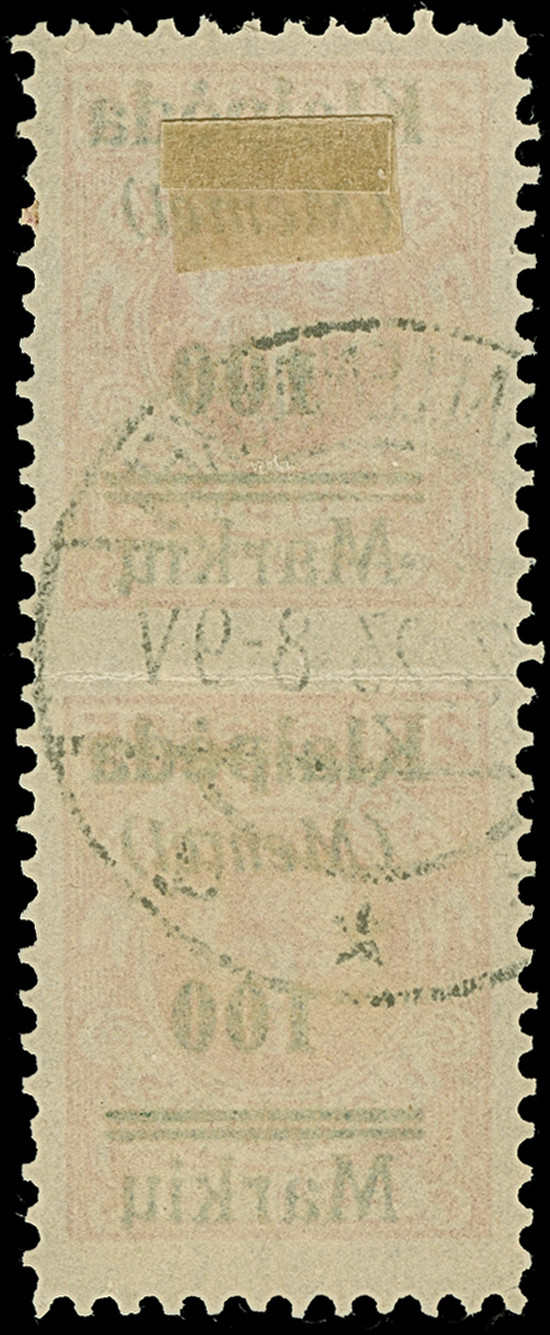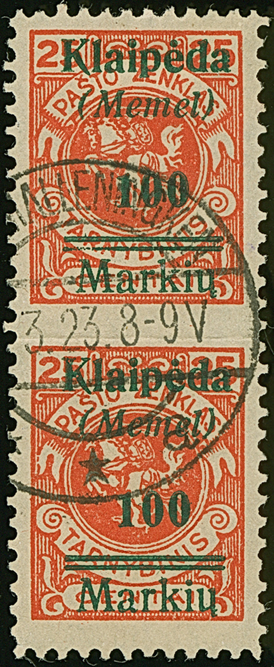 1923, Strichausgabe 100 Markiu auf 25 Centai, senkrechtes Paar, mittig ungezähnt, sauber gestempelt “(SCHM)ALLENINGKEN 3.23”, mittig gefaltet, sonst tadellos. Sehr selten, ProFi hat kein weiteres gebrauchtes Stück dieser Abart registriert, Fotoattest Huylmans BPP (2016)