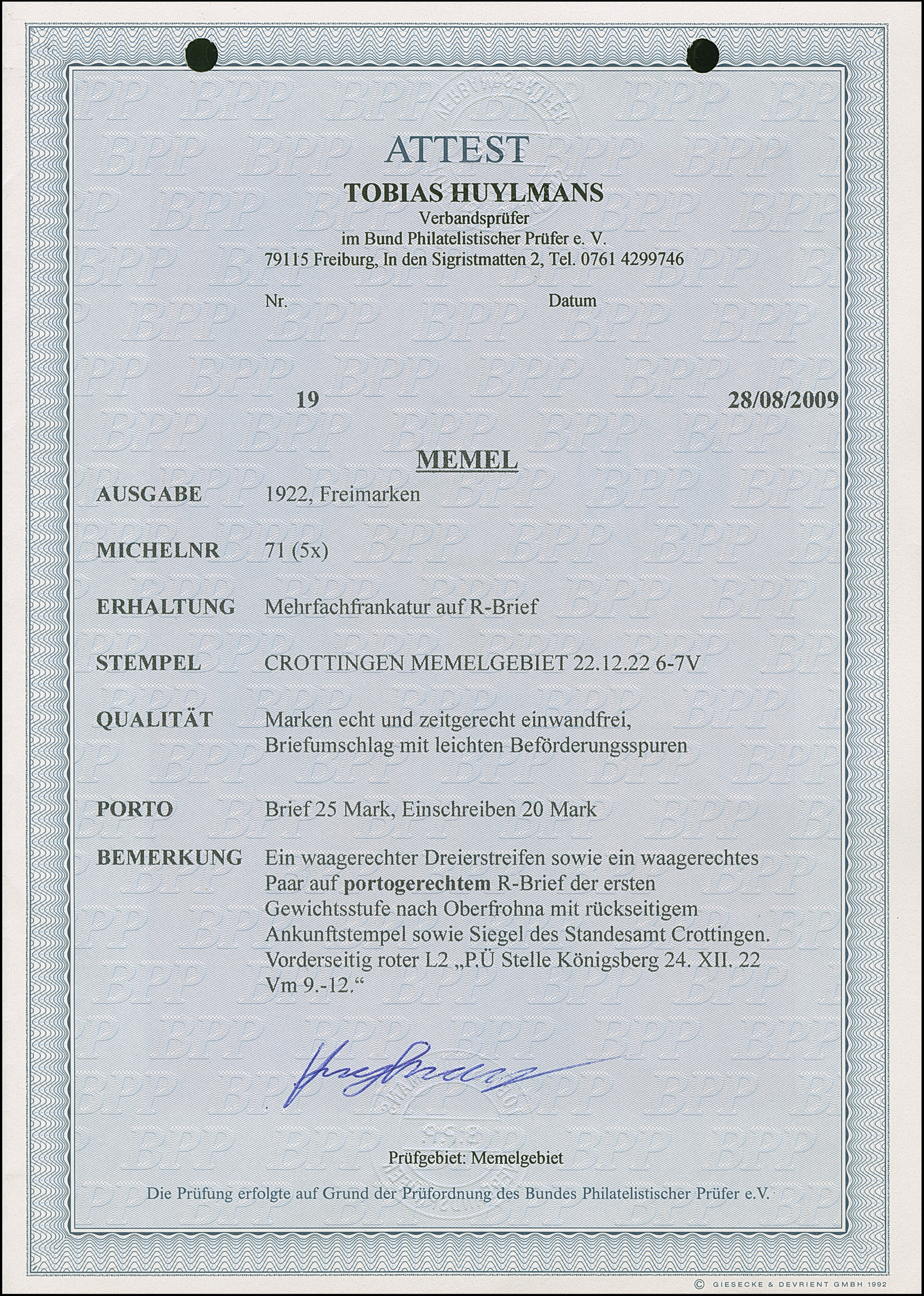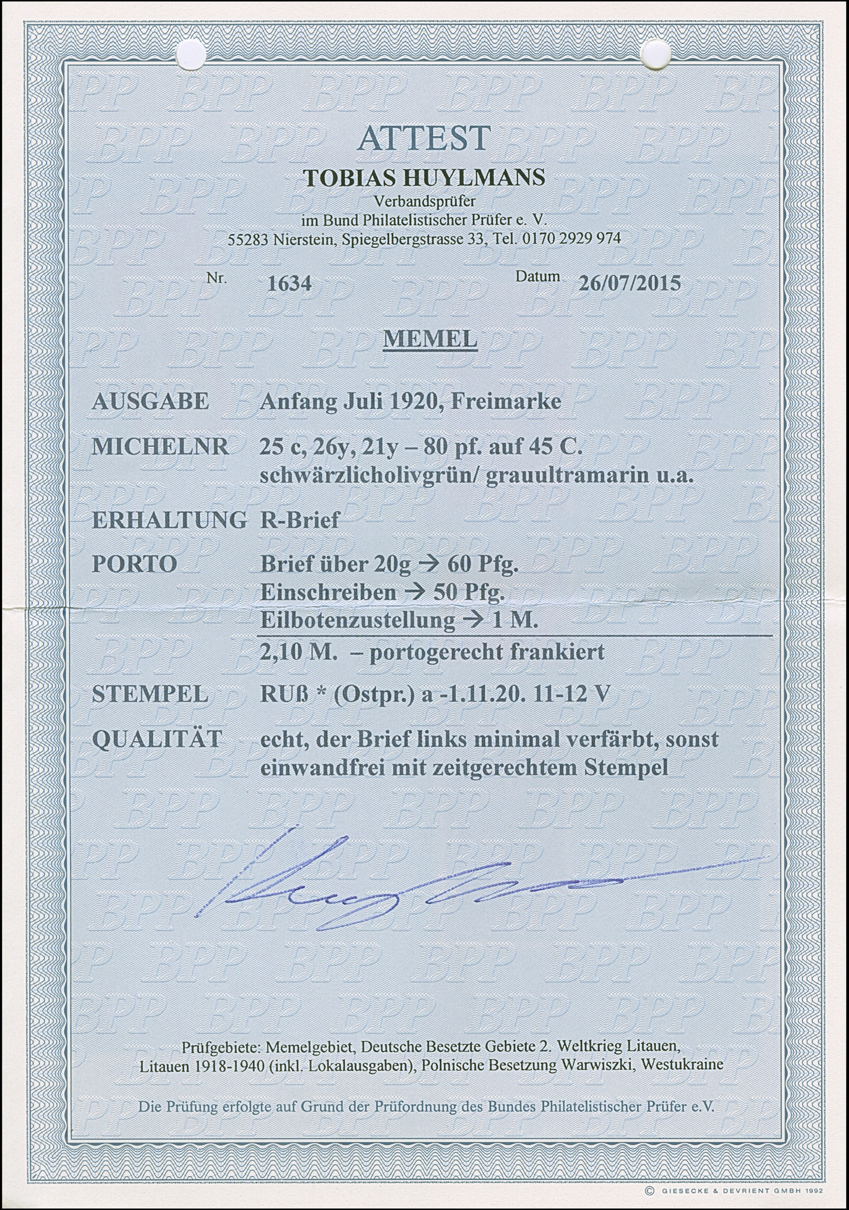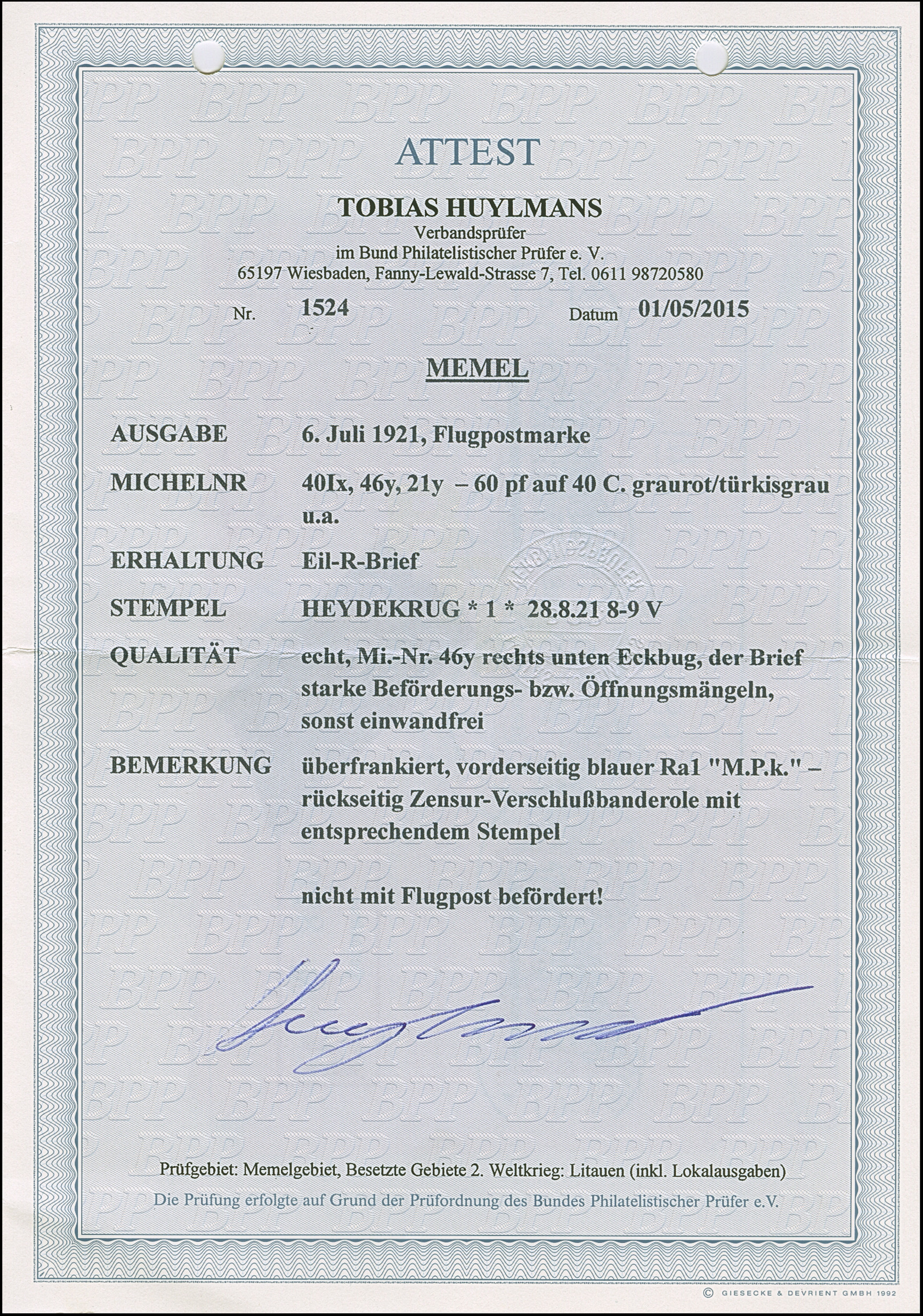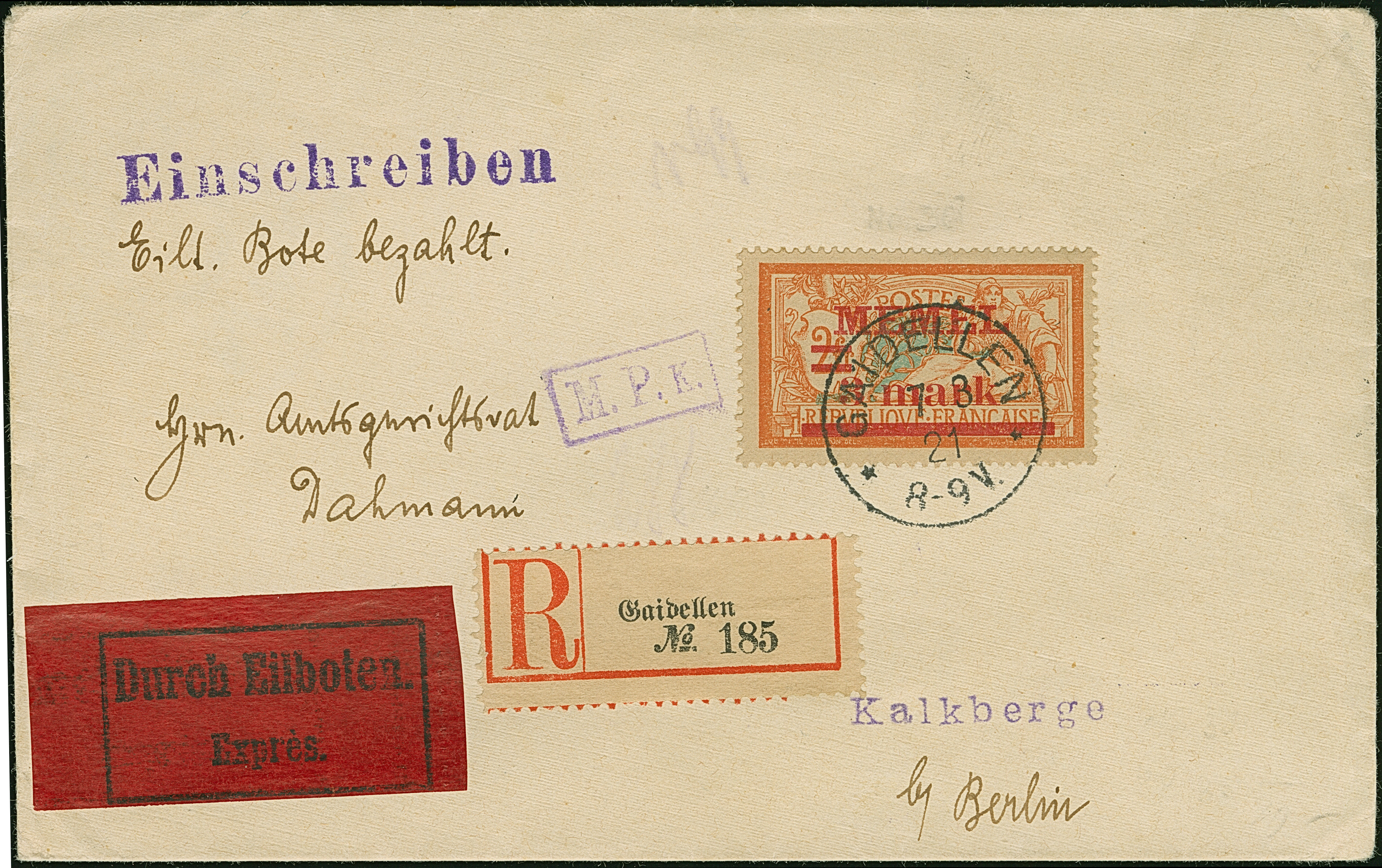 1921, 60 pfennig auf 40 Centimes auf GC-Papier, mit Zufrankatur mit Stempel “HEYDEKRUG 28.8.21” auf überfrankiertem, etwas lädiertem Eil-R-Brief nach Köbigsberg, ein Wert der Zufrankatur kleiner Bug, die Marken sonst tadellos, sehr selten, Fotoattest Huylmans BPP (2015)