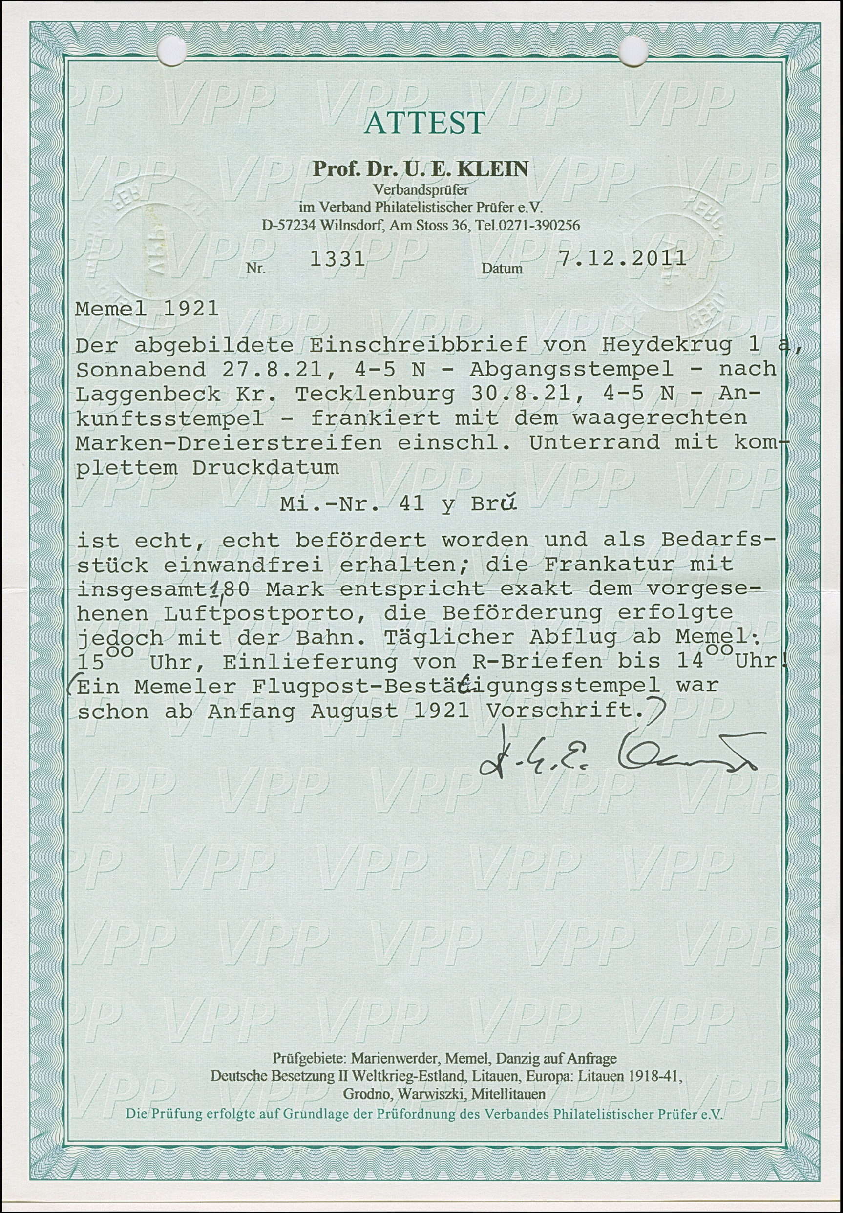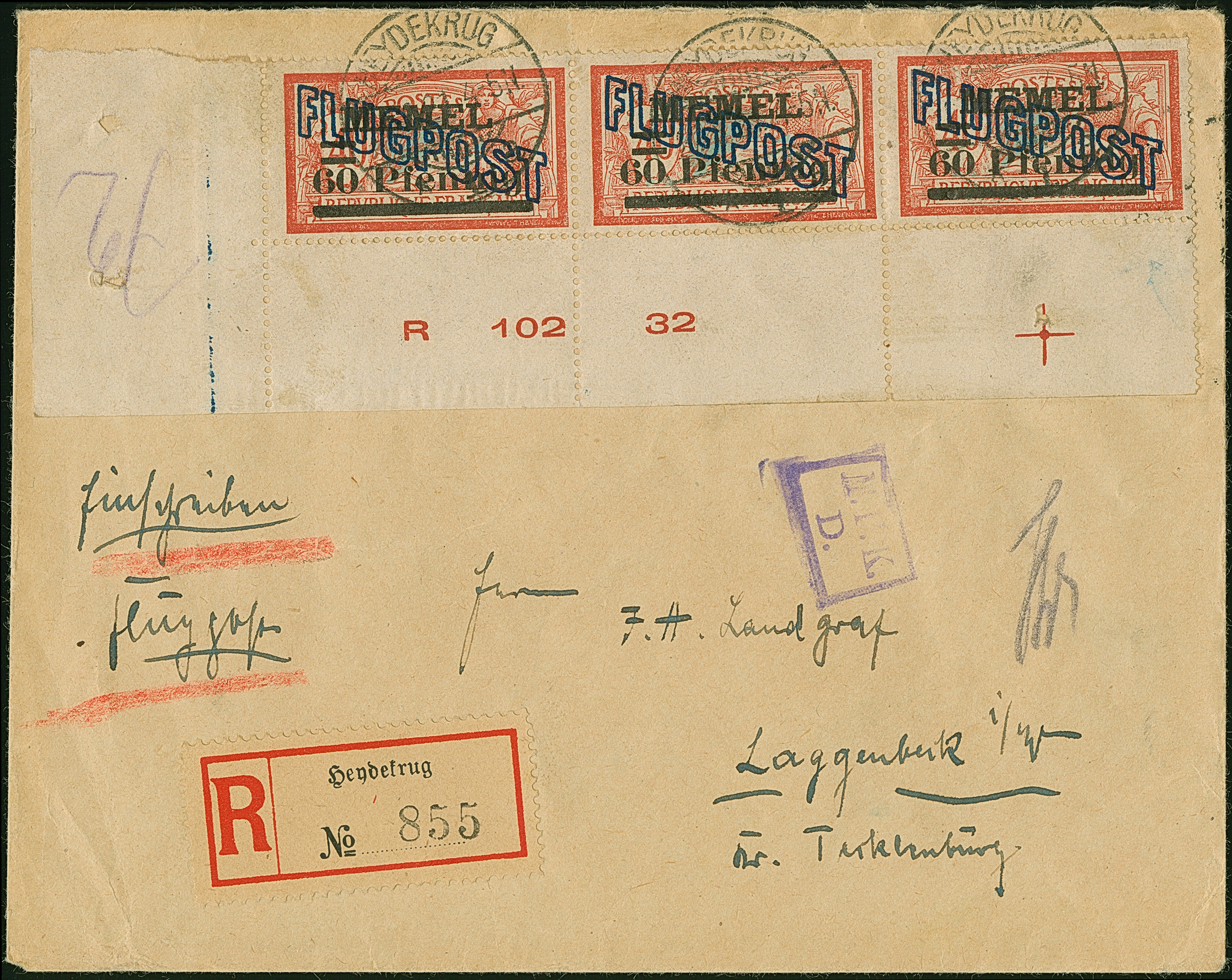 1921, 60 Pfennig auf 40 Centimes, waagerechter Dreierstreifen aus der linken unteren Bogenecke mit Druckdatum “R 102 32” sowie Passerkreuz, Felder 71-72 mit Aufdruckfehler “nachgezogene Druckbuchstaben”, sauber mit Stempel “HEYDEKRUG 27.8.21" auf für den Versand per Flugpost vorgesehenem R-Brief nach Laggenbeck mit Ankunftsstempel, der Umschlag oben etwas knittrig, sonst in guter Erhaltung, Fotoattest Klein (2011)