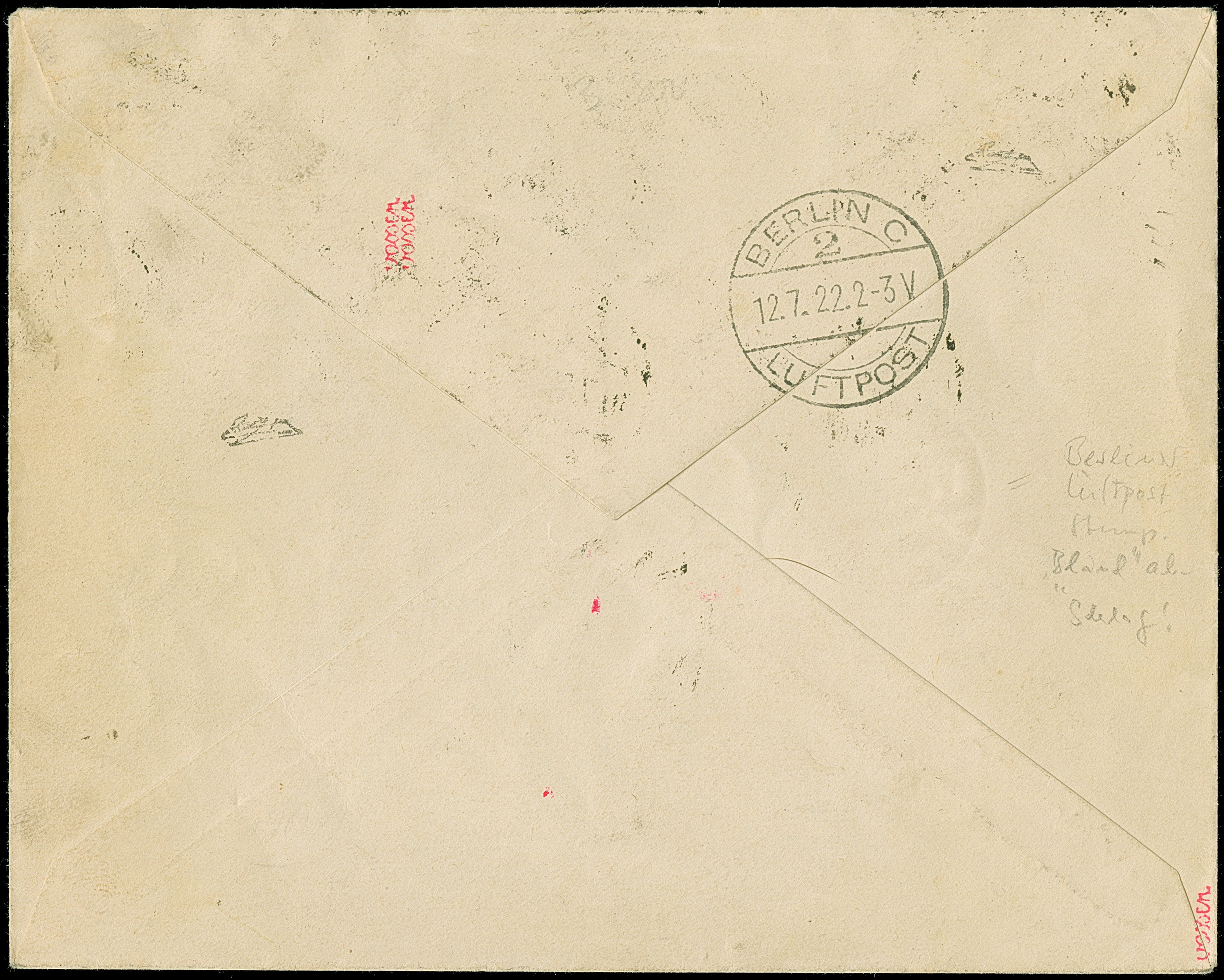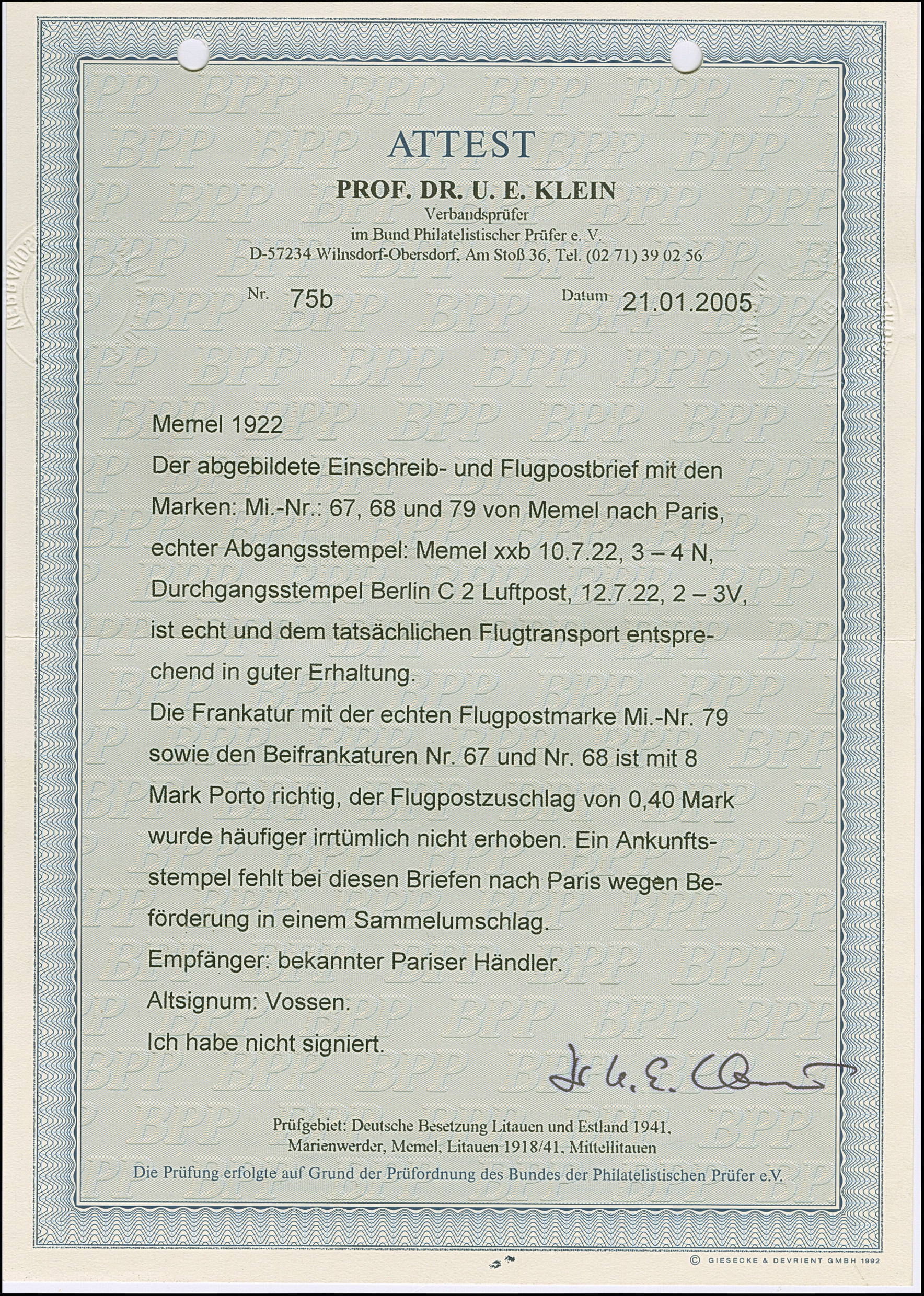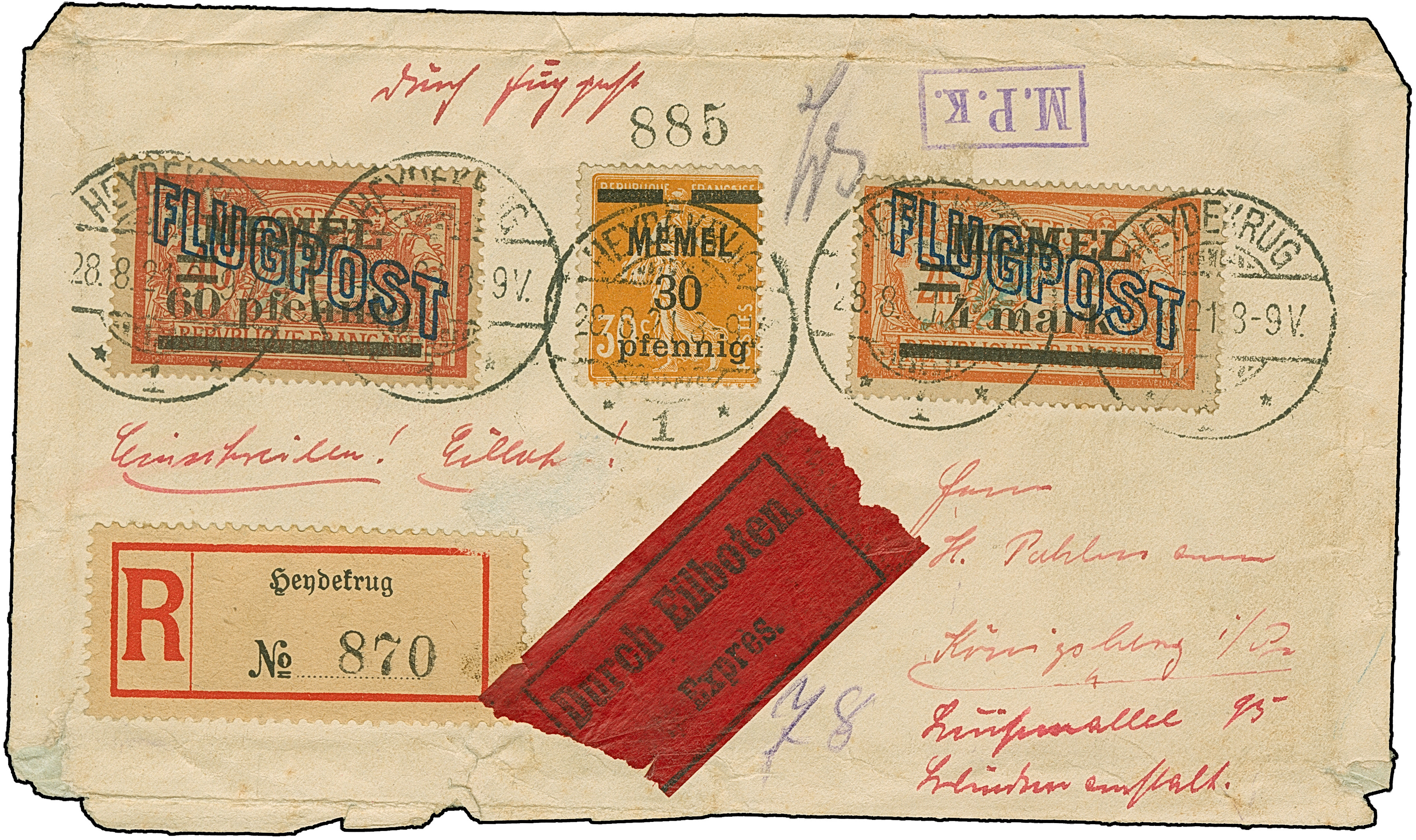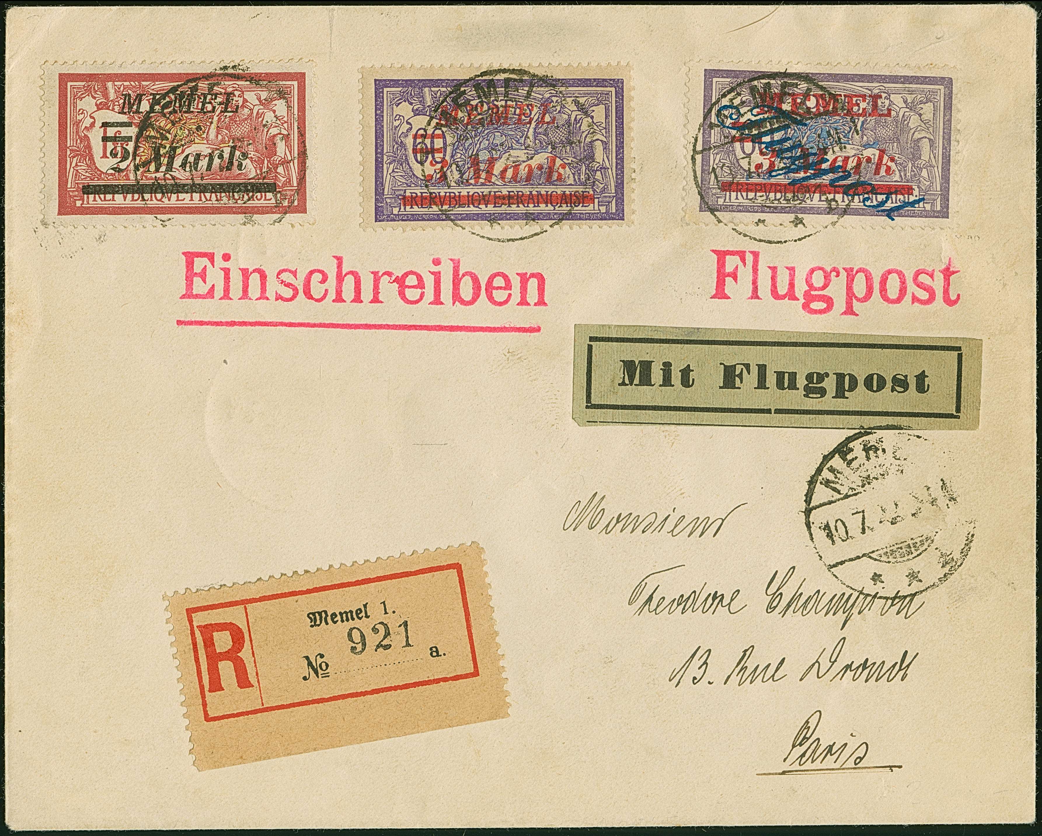 1922, Flugpost 3 M. auf 60 Centime mit Zufrankatur mit Stempel “MEMEL 10.7.22” auf portogerechtem Luftpost-R-Brief nach Paris mit rückseitigem Luftpost-Stempel “BERLIN C 2 LUFTPOST 12.7.22”. Einige Zahnspitzen ergänzt, sonst in tadelloser Erhaltung, sehr selten, es sind nur wenige geflogene Briefe mit dieser Marke registriert, trotz der kleine Einschränkungen sehr attraktiv, sign. Champion sowie Vossen und Fotoattest Klein BPP (2005)