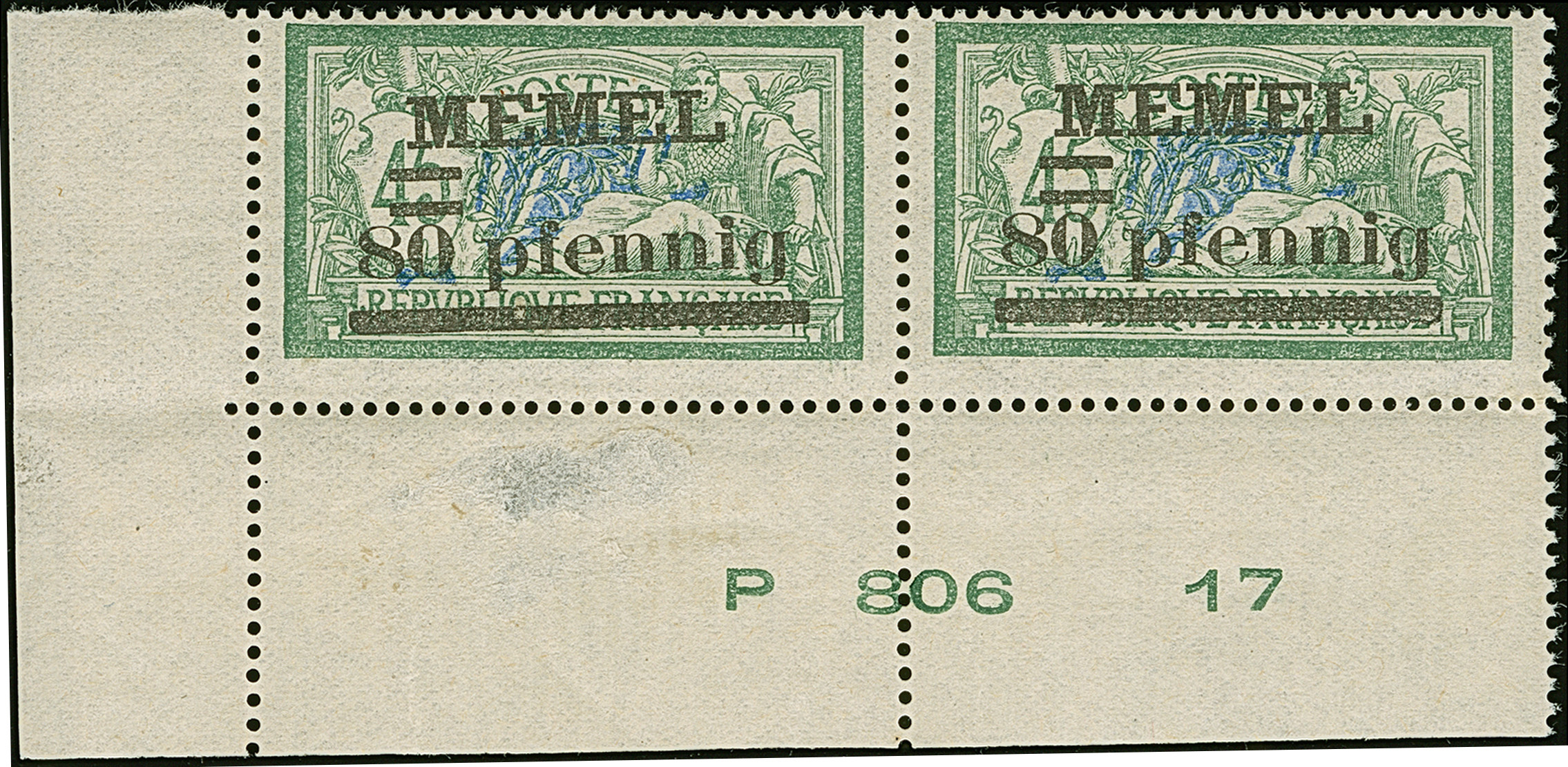 1920, 80 pfennig grün/grauultramarin im waagerechten Paar aus der linken unteren Bogenecke mit komplettem Druckdatum "P 806 17", postfrisch, eine sehr seltene Einheit, vorderseitig im Unterrand etwas geschürft, sonst tadellos, Fotoattest Huylmans BPP (2015)