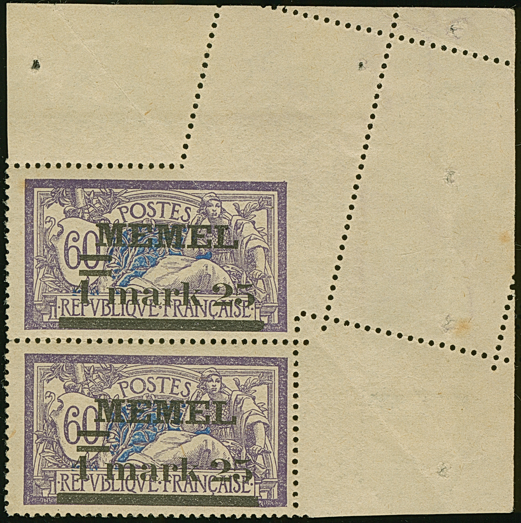 1920 1,25 mark auf 60 Cent im senkrechten Paar aus der rechten oberen Bogenecke mit interessanter Doppelzähnung durch Bogenumschlag, beide Werte mit Aufdruckfehler "enger Abstand zwischen mark und 25", postfrisch, kleine Falzreste im Bogenrand, tadellos, eine seltene und dekorative Einheit