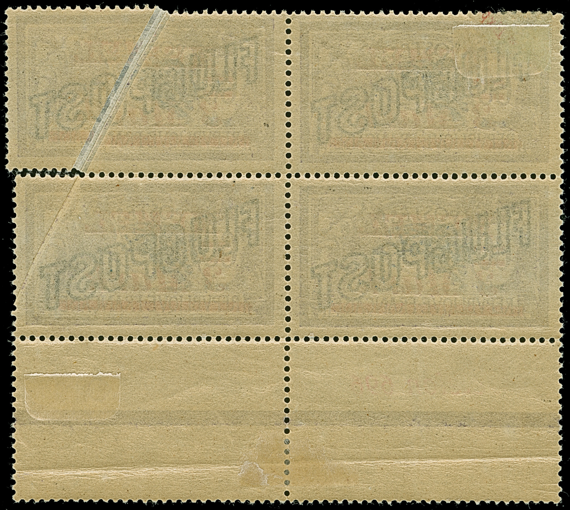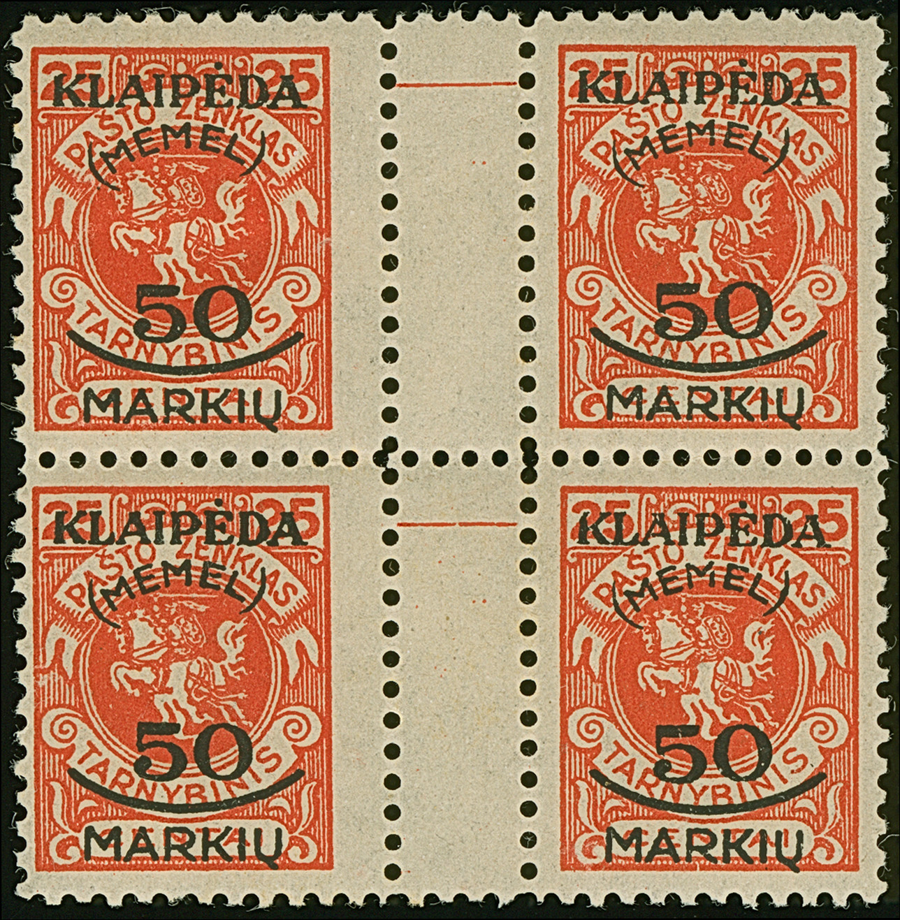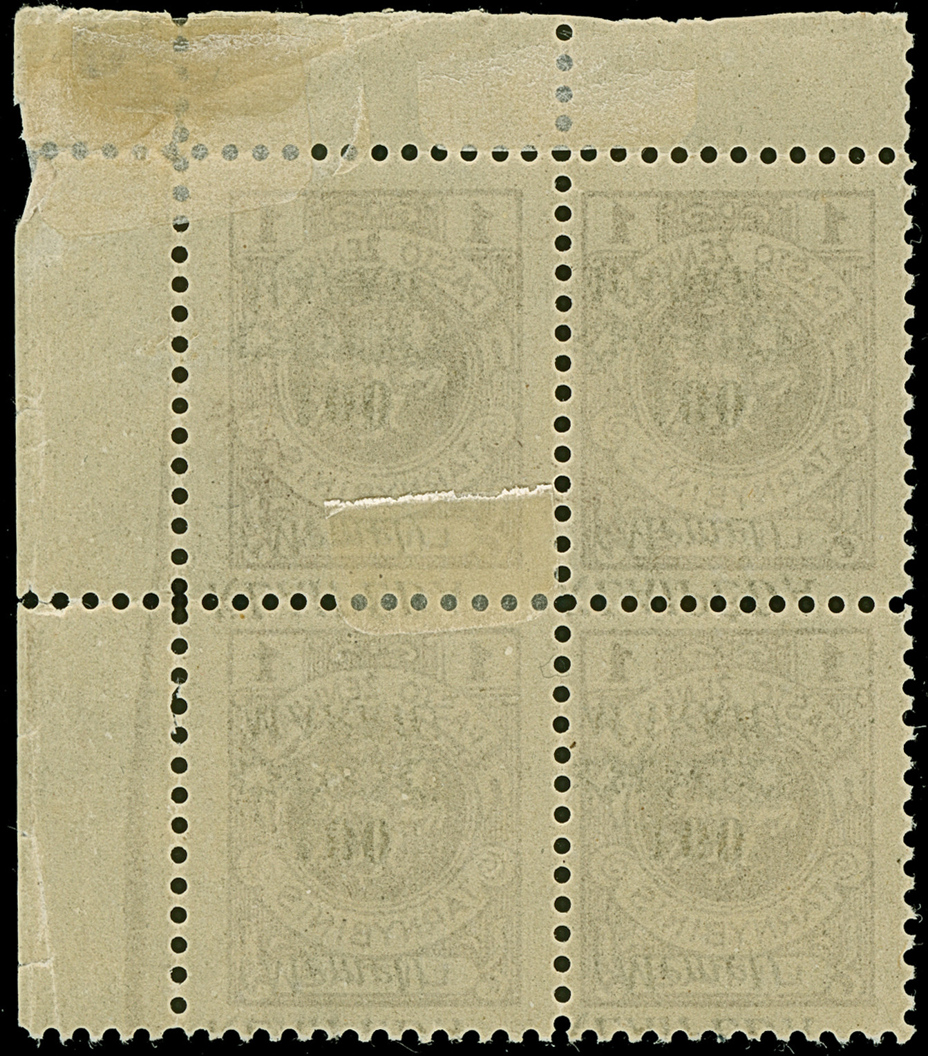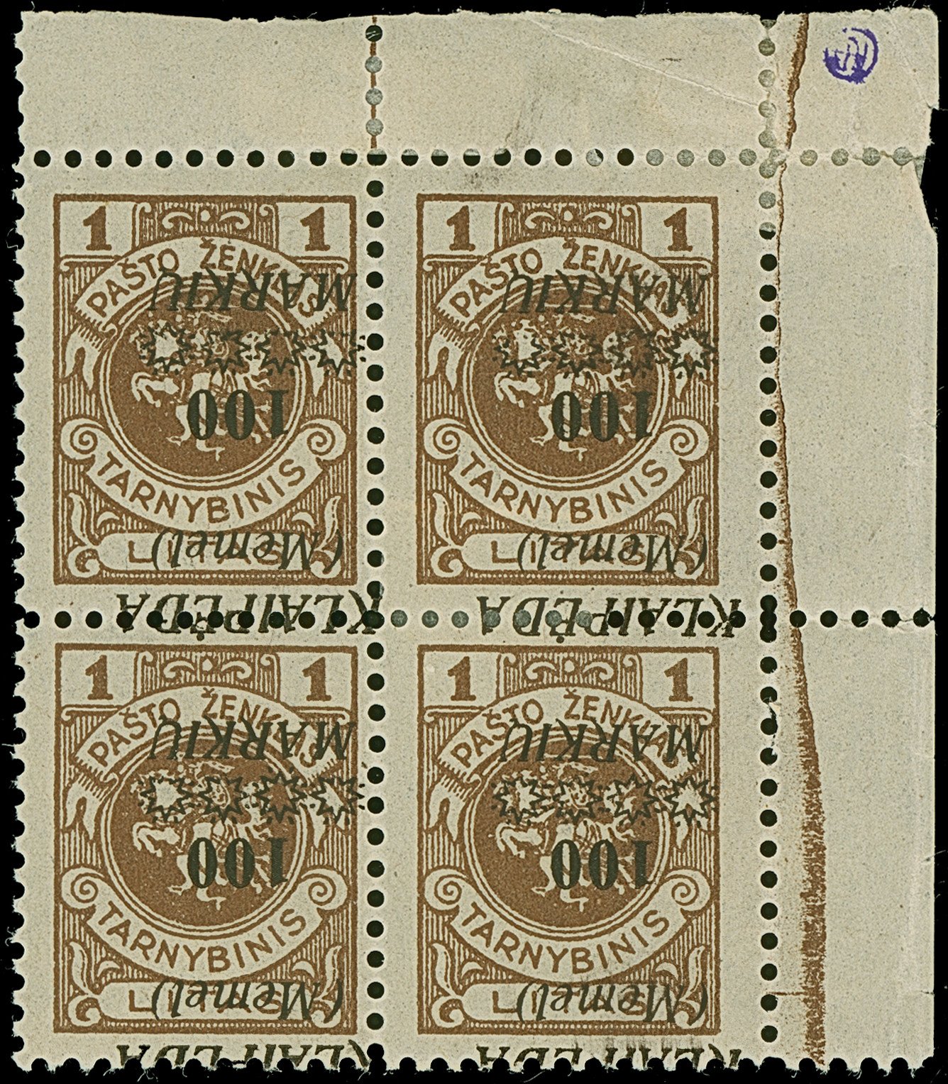 1923, Sternchen-Aufdruck 100 Markiu auf 1 Litas, Viererblock aus der rechten oberen Bogenecke mit kopfstehendem und leicht verschobenen Aufdrucken, der linke obere Wert postfrisch, sonst sauber ungebraucht, tadellos, es wurde nur ein Bogen mit kopfstehendem Aufdruck überdruckt, eine seltene und dekorative Einheit, im Bogenrand sign.