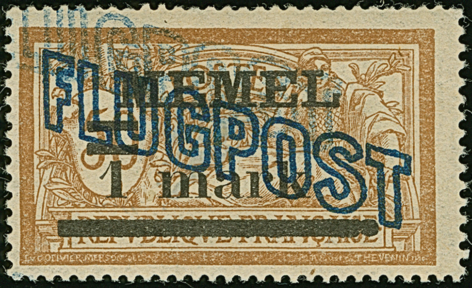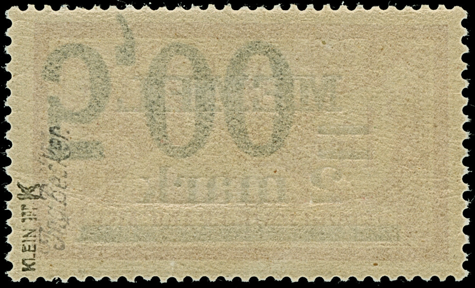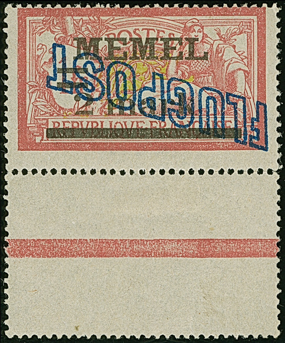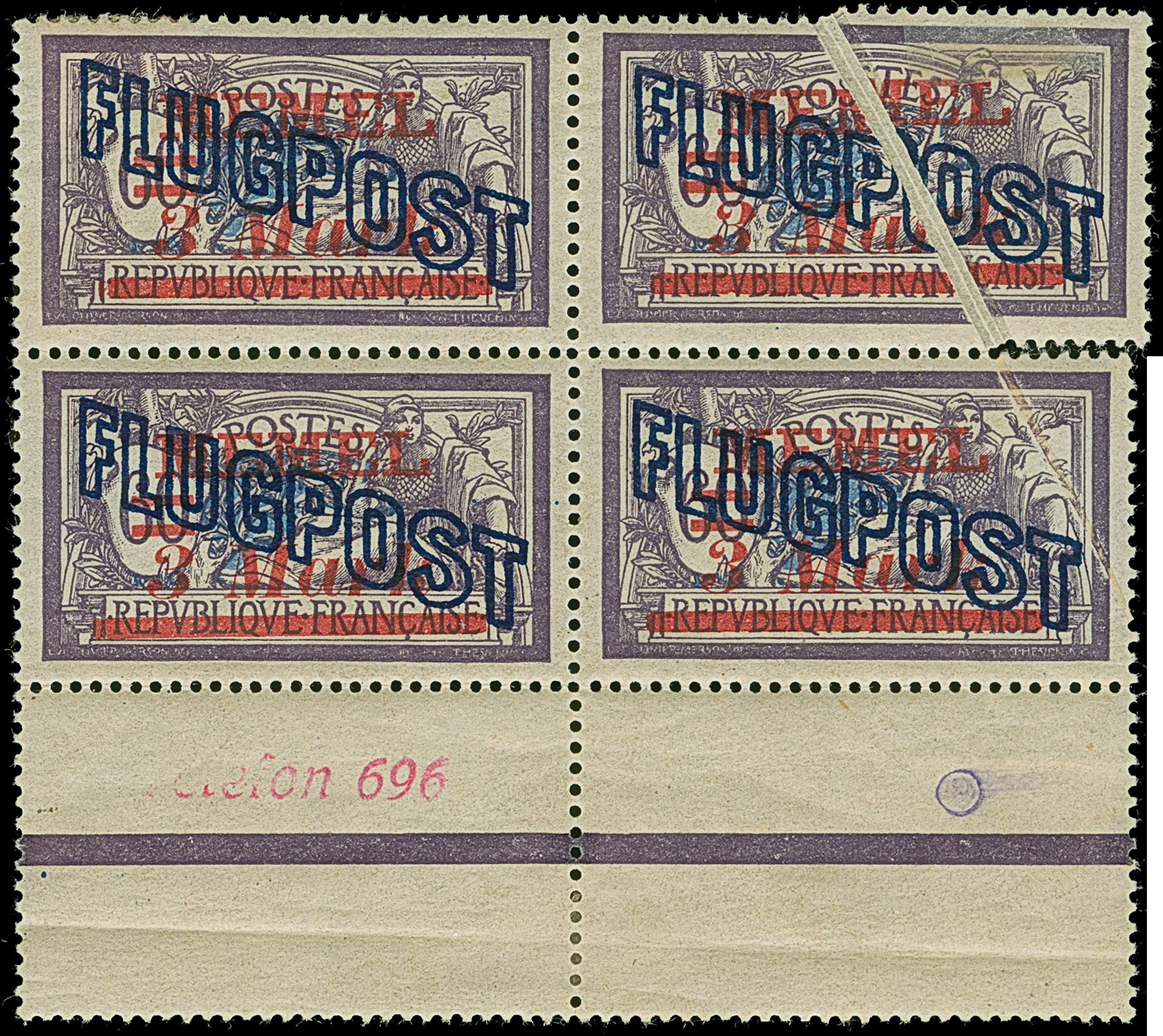 1921, Flugpost 1 mark auf 50 Centimes dunkelgrün/grauultramarin auf weißem Papier, doppelter Aufdruck, mit Urmarkenplattenfehler “weiter Abstand zwischen 1 und mark”, sauber ungebraucht, einige gering verkürzte Zähne, sonst tadellos. Eine sehr seltene Marke, von dieser Marke nach unseren Unterlagen nur ein Bogen mit Doppelaufdruck bekannt, die Auflage dieser Abart beträgt also nur 3 Stück, sign. A. Brun