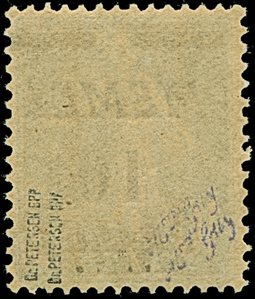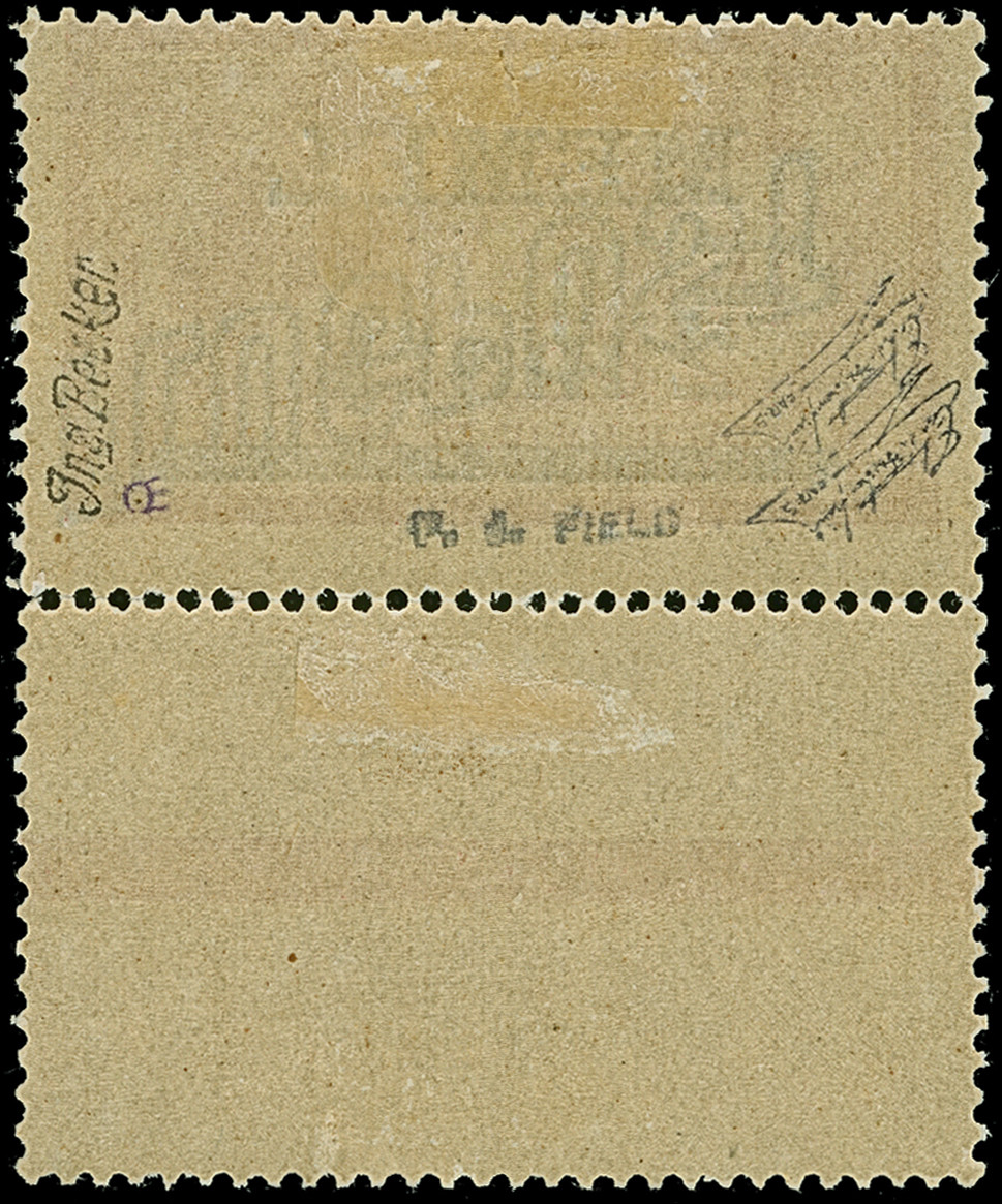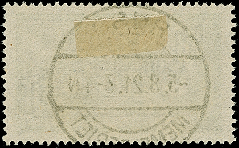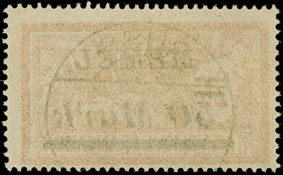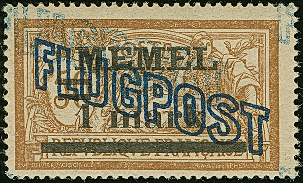 1921, Flugpost 1 mark auf 50 Centimes dunkelgrün/grauultramarin auf weißem Papier, doppelter Aufdruck, mit Urmarkenplattenfehler “weiter Abstand zwischen 1 und mark”, sauber ungebraucht, einige gering verkürzte Zähne, sonst tadellos. Eine sehr seltene Marke, von dieser Marke nach unseren Unterlagen nur ein Bogen mit Doppelaufdruck bekannt, die Auflage dieser Abart beträgt also nur 3 Stück, sign. A. Brun
