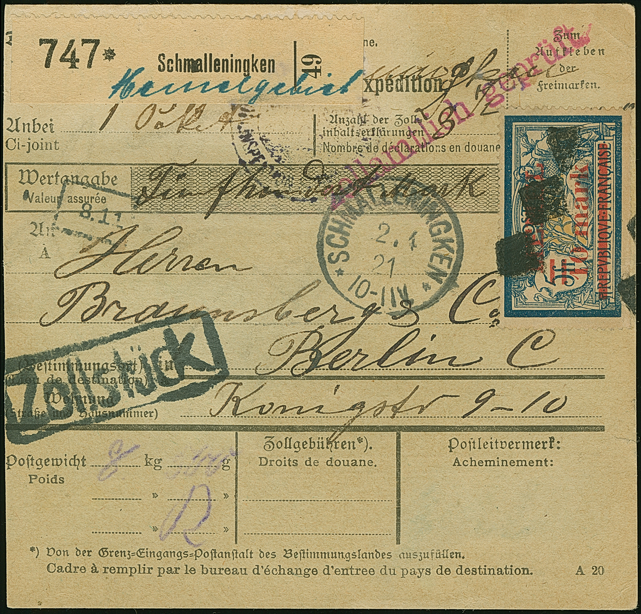 1920, 10 mark auf 5 Franc, sauber mit Korkstempel und nebengesetztem Aufgabestempel “SCHMALLENINGKEN 2.4. 21” auf Paketkarte nach Berlin, die Marke kleine Beanstandungen, sonst in guter Erhaltung