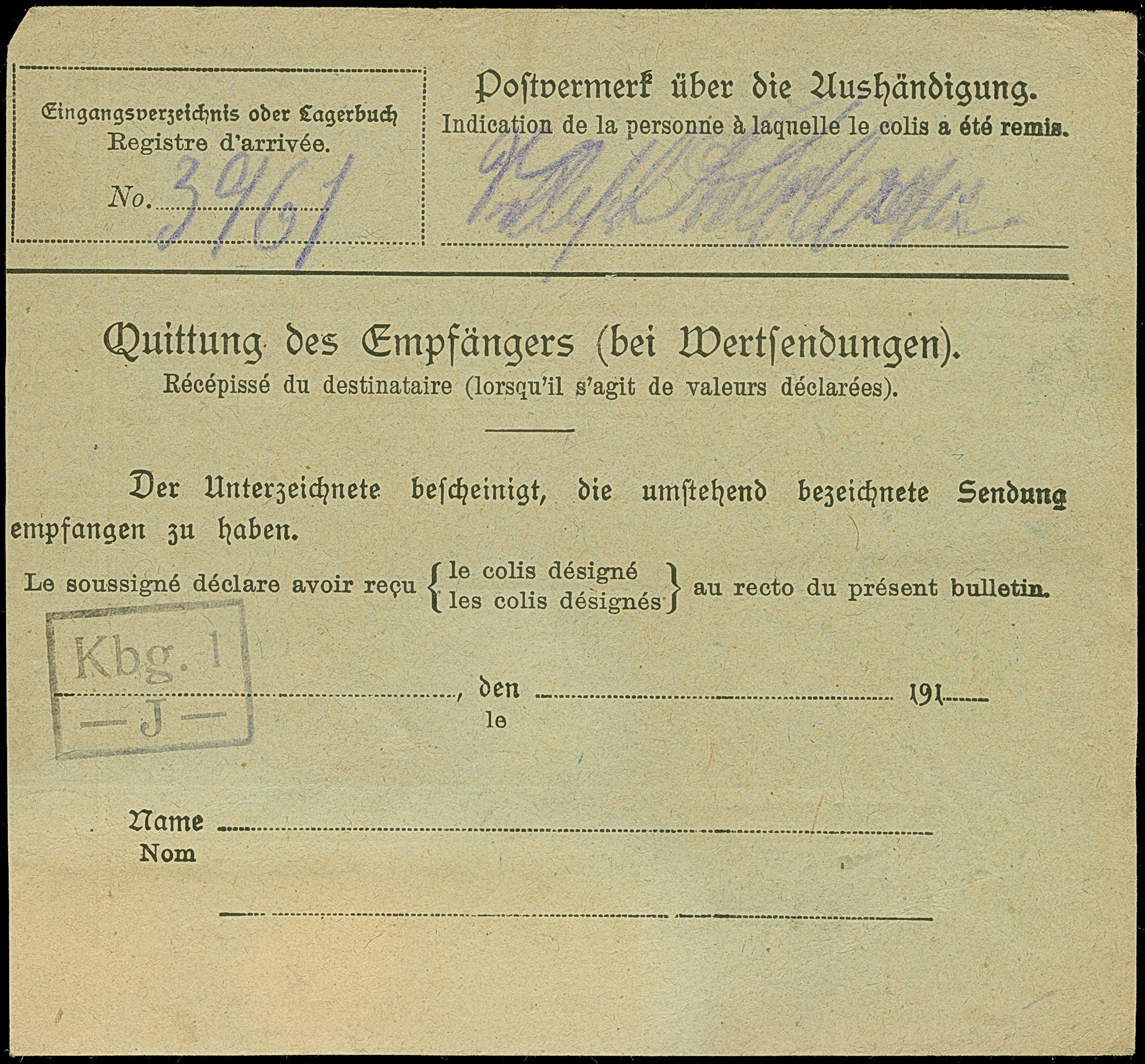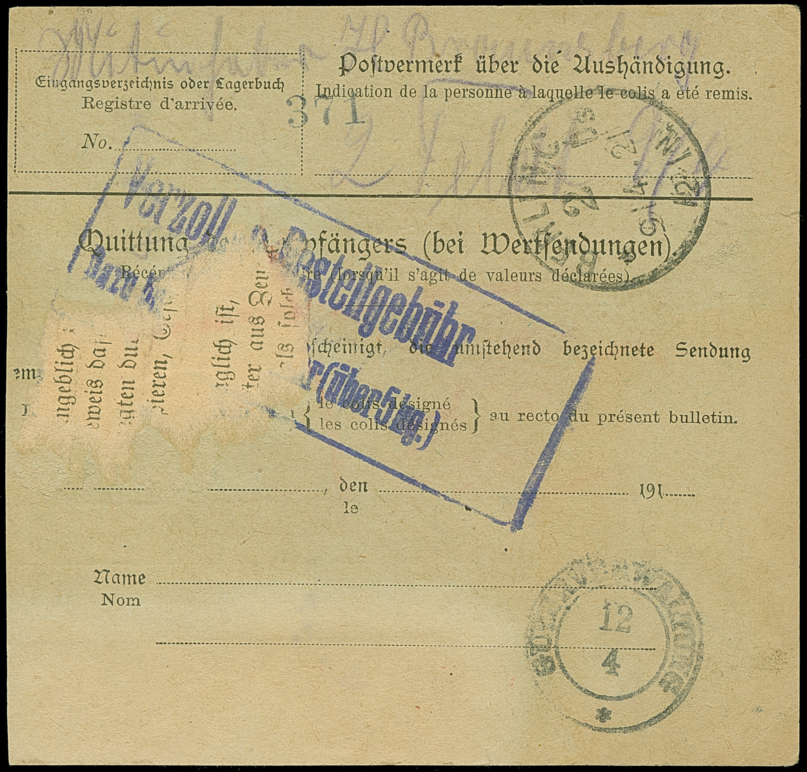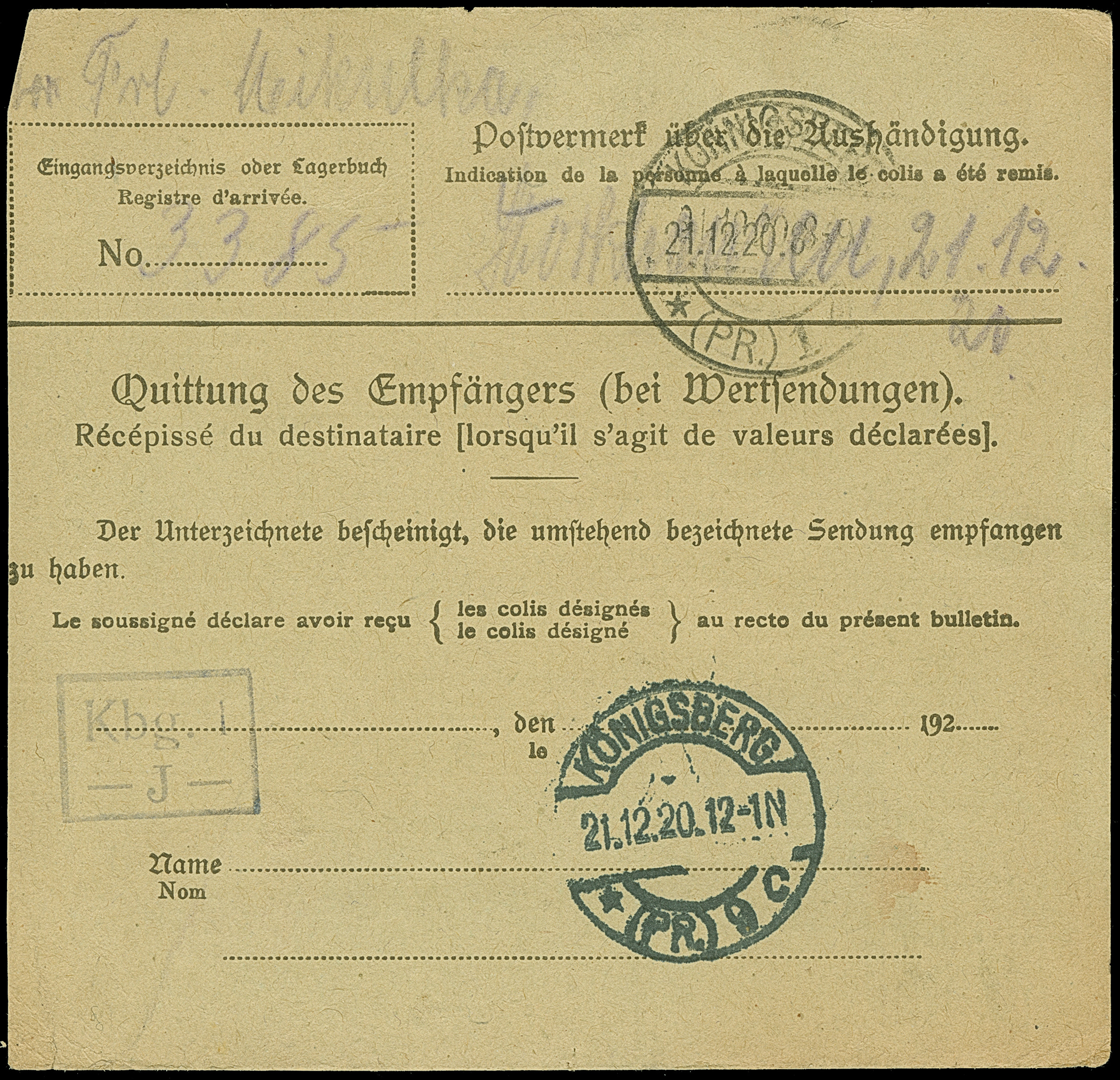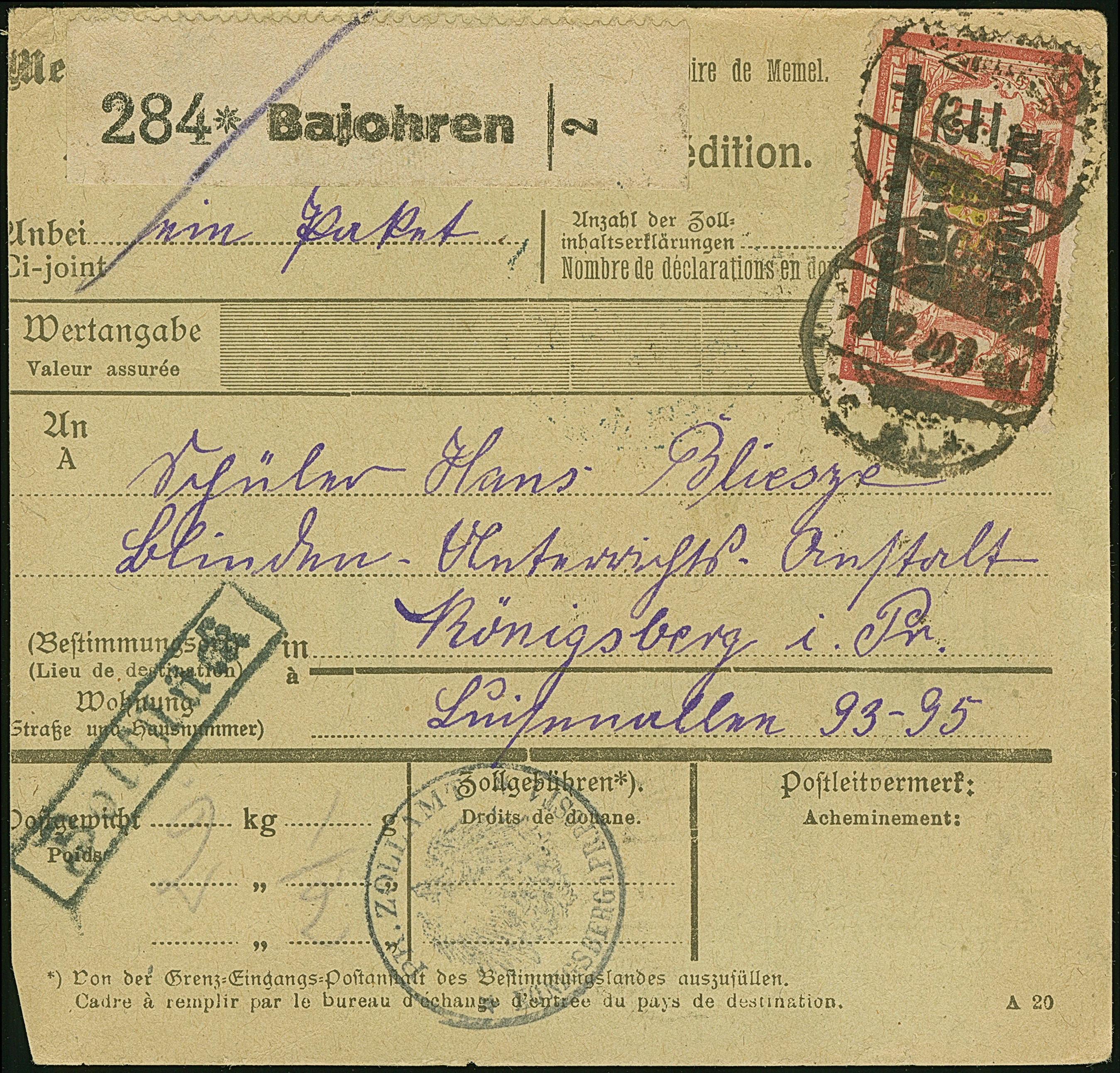 1920, 2 mark auf 1 Franc auf GC-Papier, sauber mit Stempel “BAJOHREN 9.12.20” auf Paketkarte nach Königsberg, die Marke etwas bestoßen, leichte Beförderungsspuren, sonst in guter Erhaltung