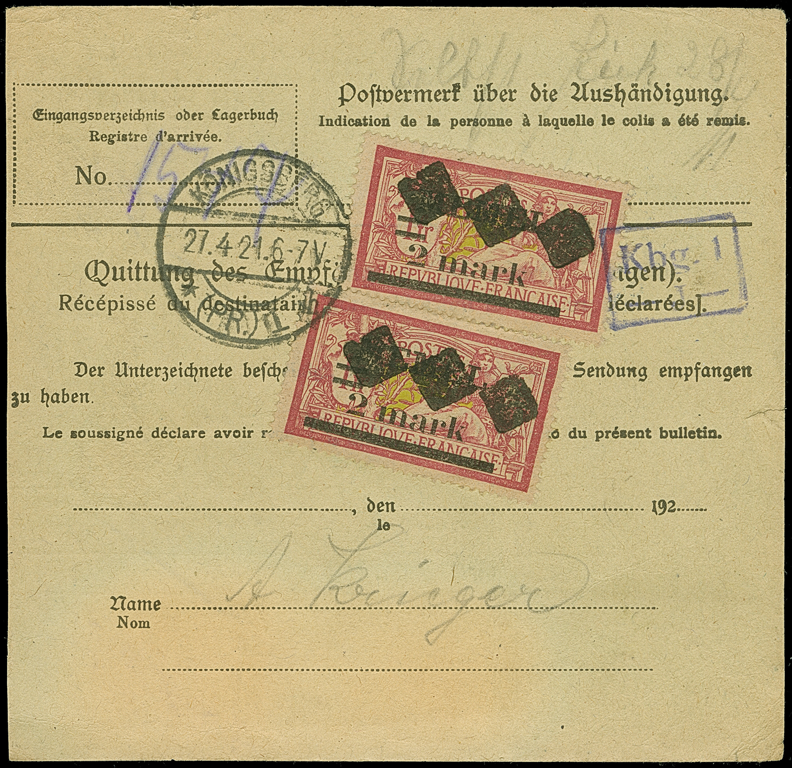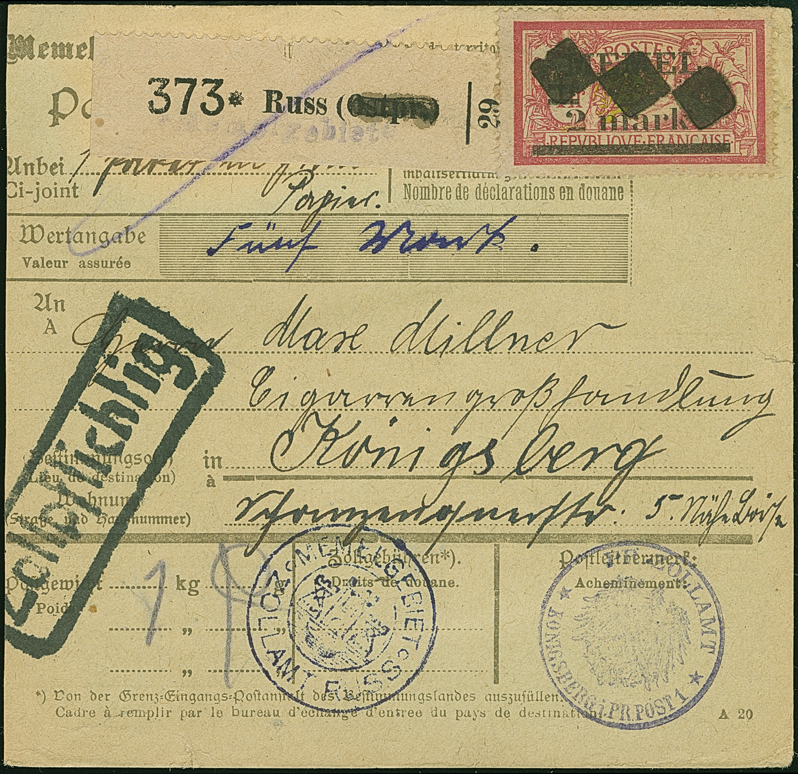1920, 2 mark auf 1 Franc auf GC-Papier, sauber mit Korkstempel auf Paketkarte von Russ nach Königsberg, die Marke etwas bestoßen, leichte Beförderungsspuren, sonst in guter Erhaltung