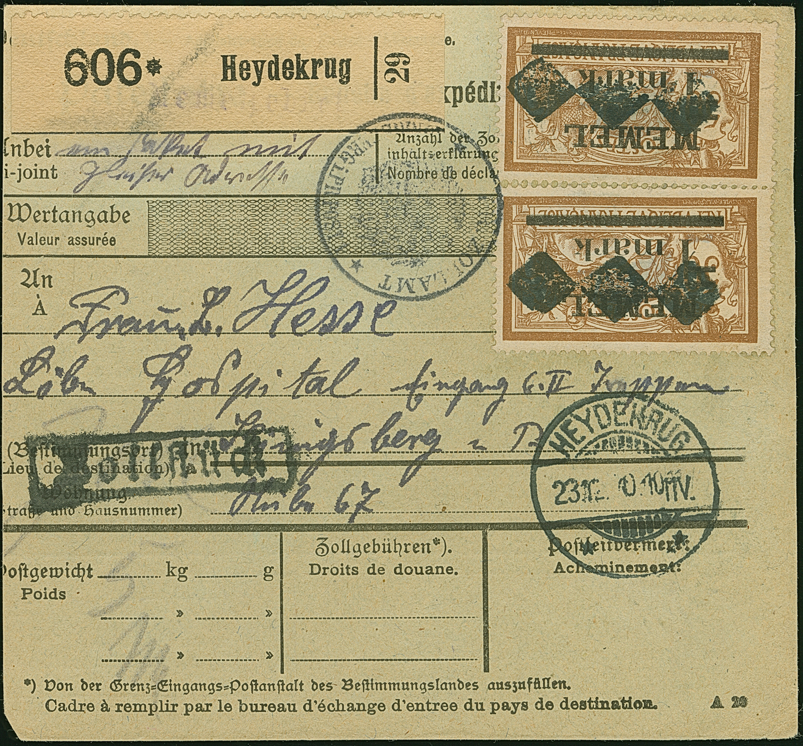 1920, 1 mark auf 50 Centimes, weißes Papier, zwei Einzelwerte, sauber mit Korkstempel und nebengesetztem Aufgabestempel “HEYDEKRUG 23.10.20” nach Königsberg, leichte Beförderungsspuren, sonst in guter Erhaltung