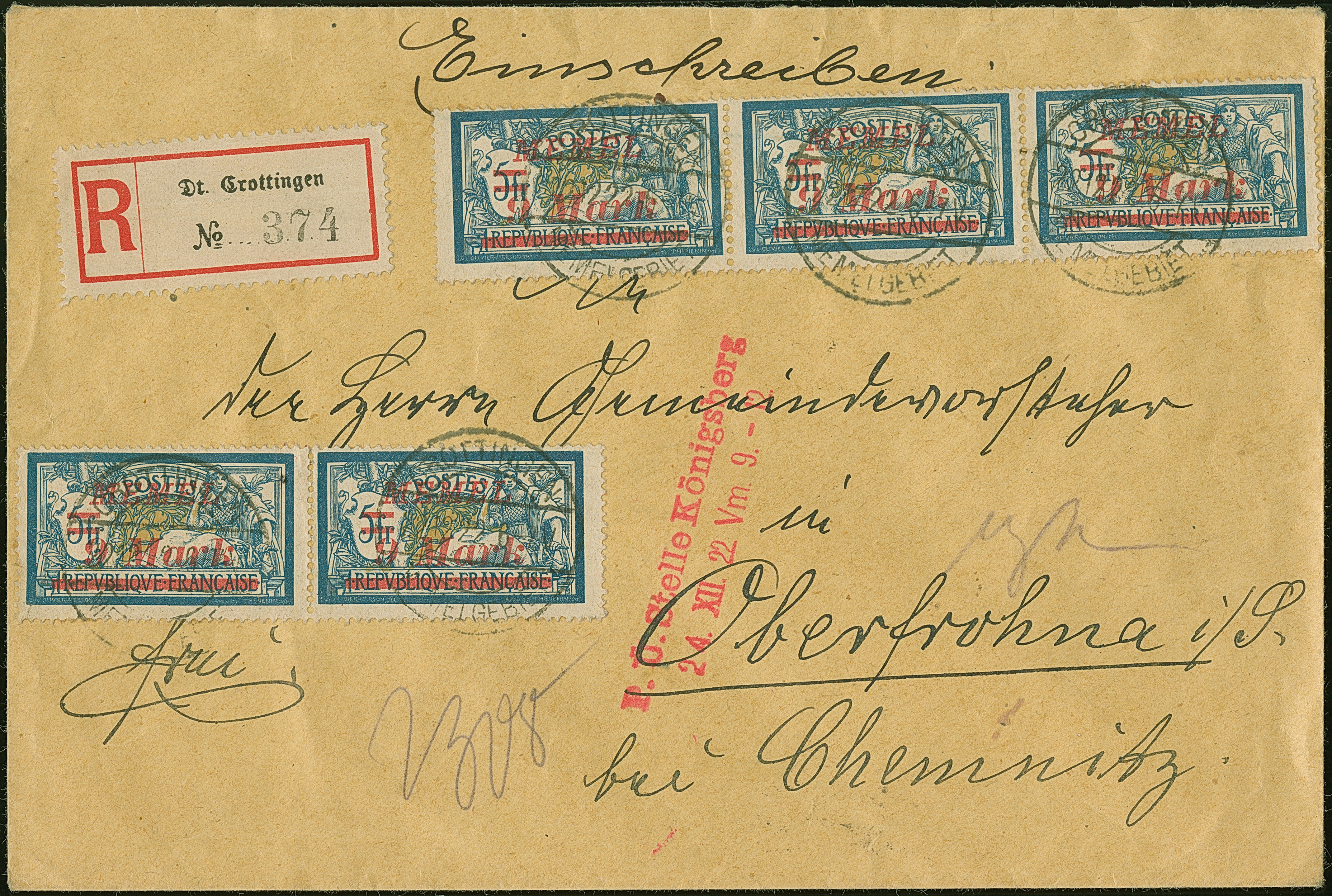 1922, 9 Mark auf 5 Franc, waagerechter Dreierstreifen und Paar, farbfrisch und gut gezähnt, sauber mit Stempel “CROTTINGEN 22.12.22” auf portogerechtem, zensierten R-Brief nach Oberfrohna mit Ankunftsstempel, tadellos, eine seltene Mehrfachfrankatur, Fotoattest Huylmans BPP (2009)