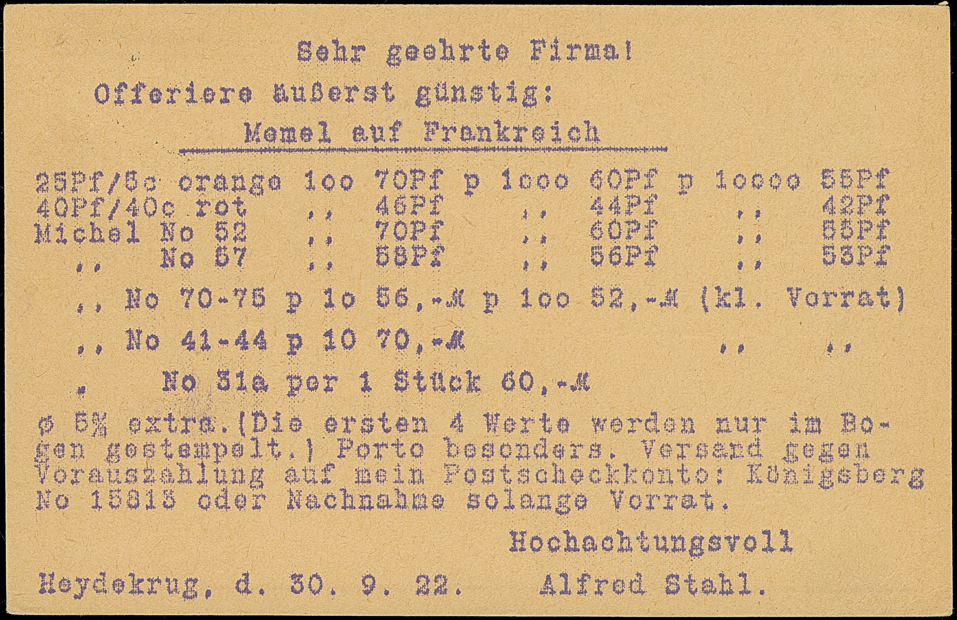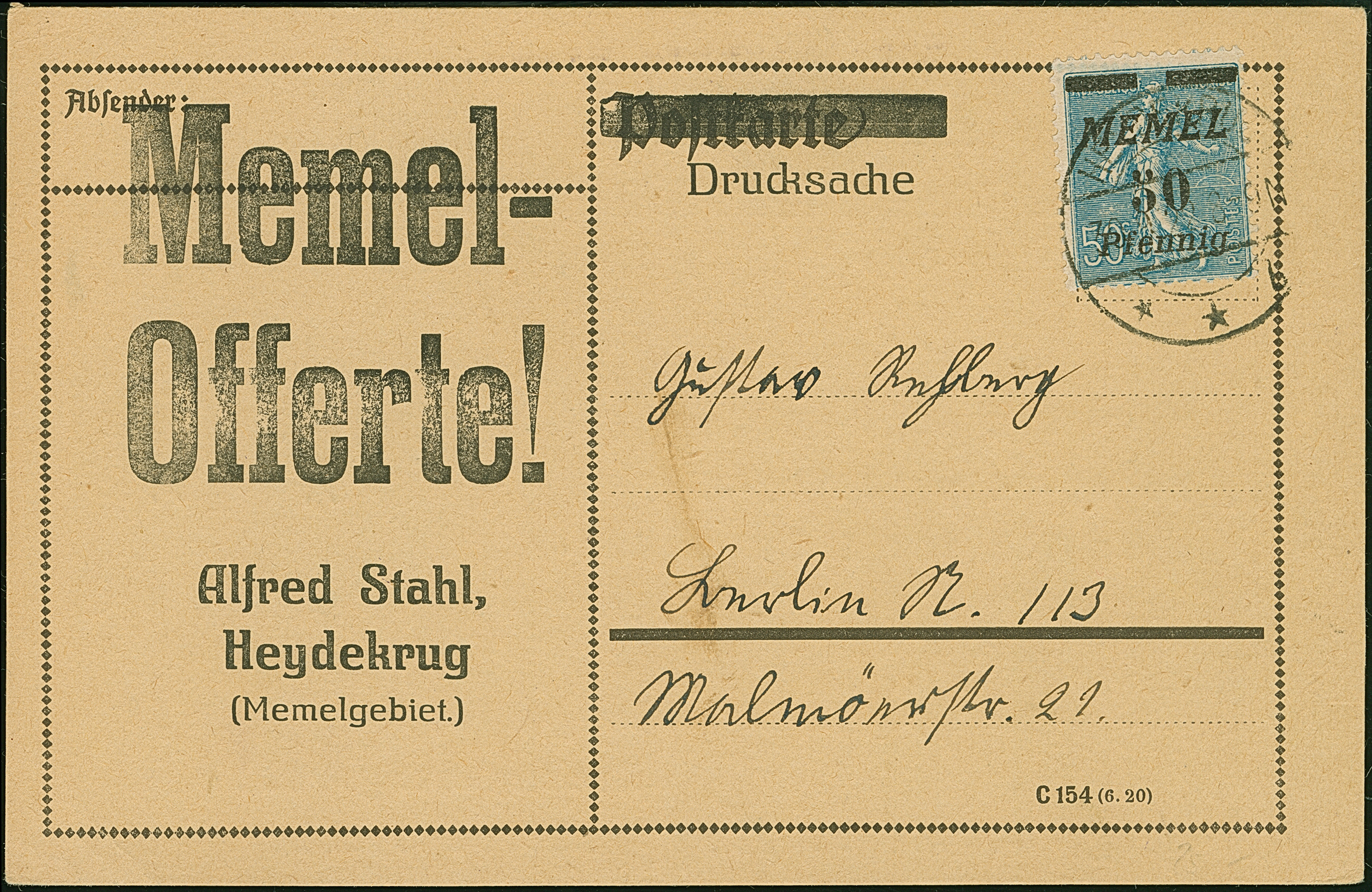 1922, 50 Pfennig auf 50 Centime preußischblau, sauber mit Stempel “HEYDEKRUG 30.9.22” auf portogerechter Drucksachenkarte nach Berlin, tadellos, eine seltene Frankatur, Fotoattest Huylmans BPP (2014)