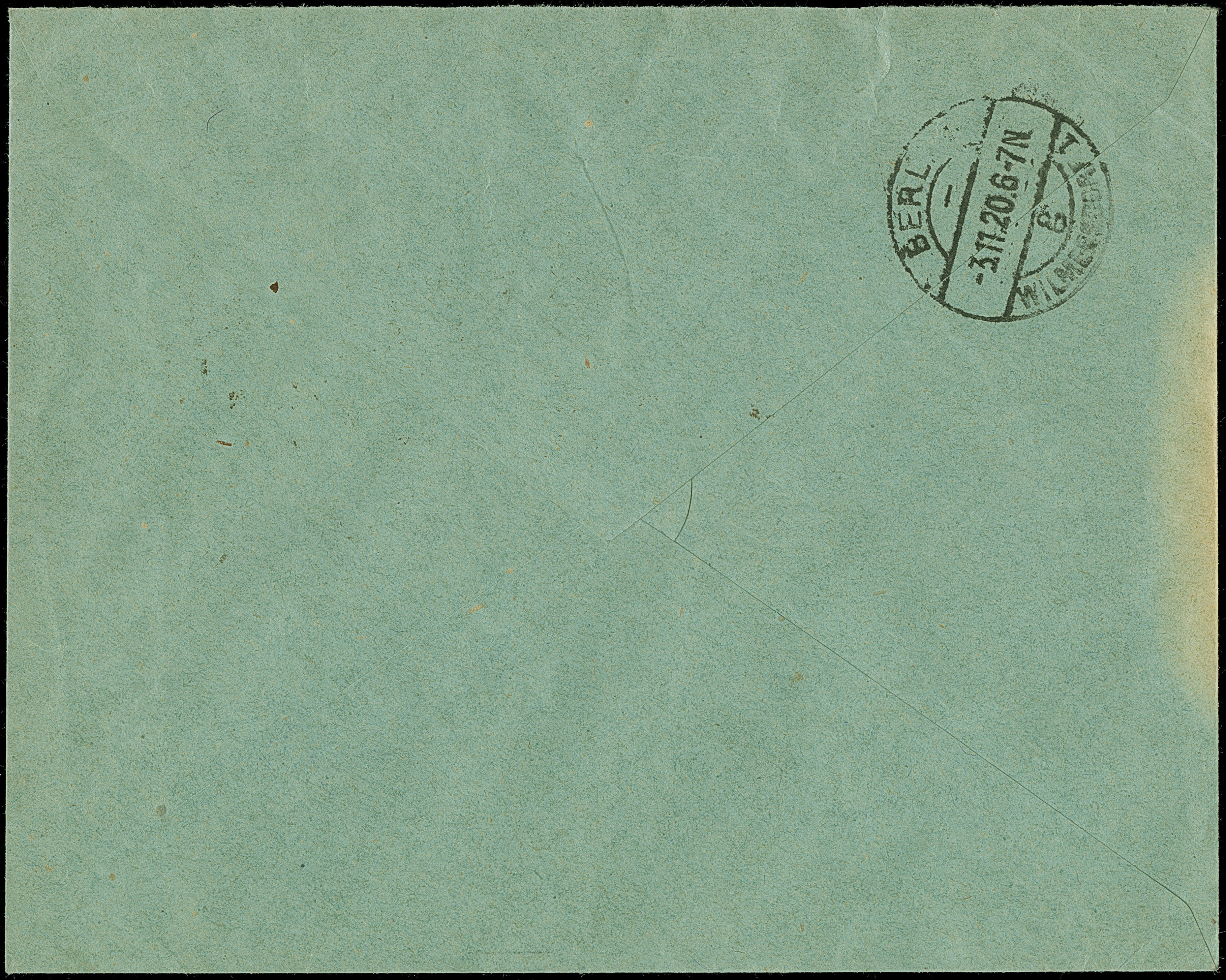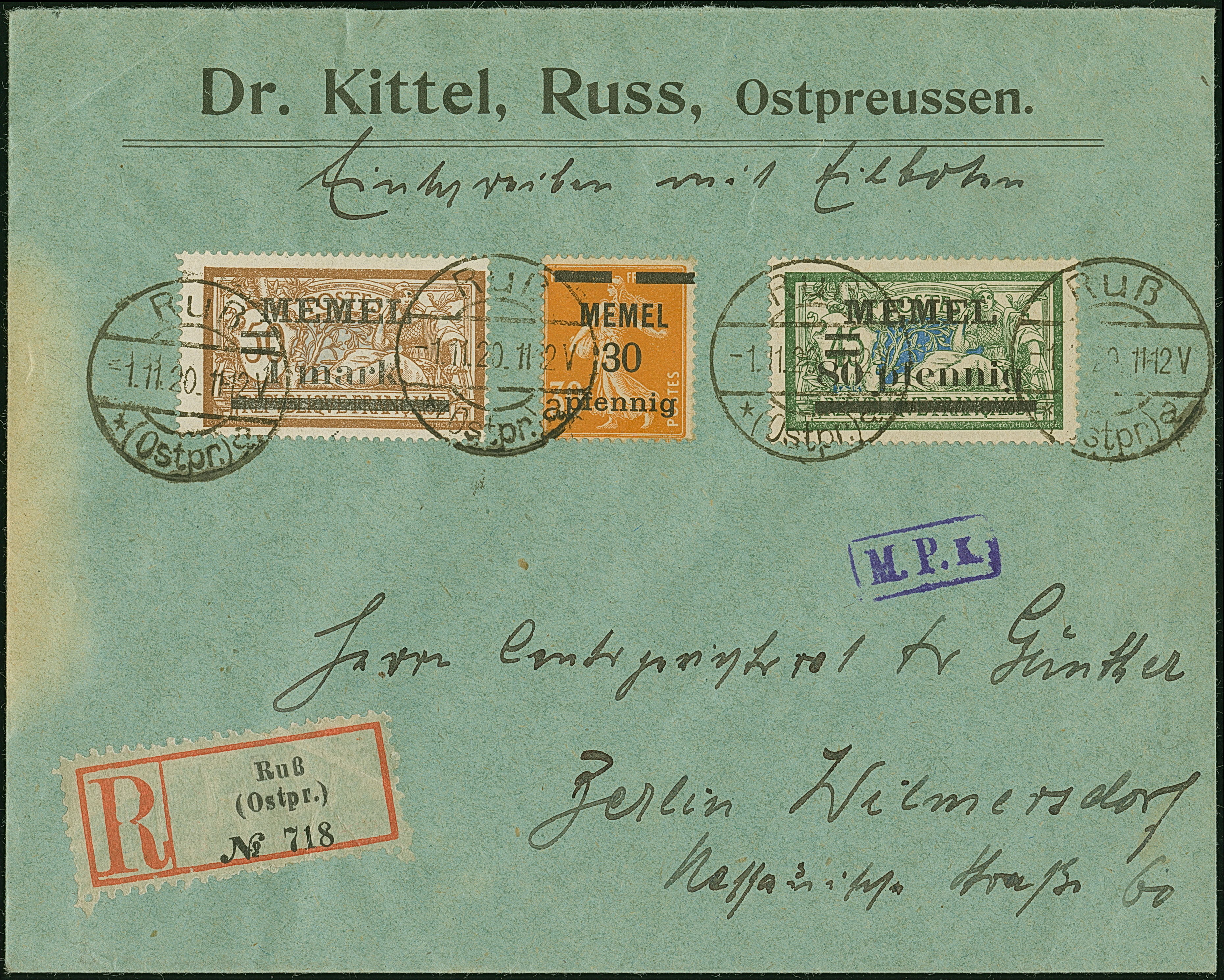 1920, 80 pfennig auf 45 Centime schwärzlicholivgrün mit Zufrankatur mit Stempel "Ruß -1.11.20" auf portogerechtem Eil-R-Brief nach Berlin, der Umschlag links minimal verfärbt, sonst tadellos, selten, Fotoattest Huylmans BPP (2015)