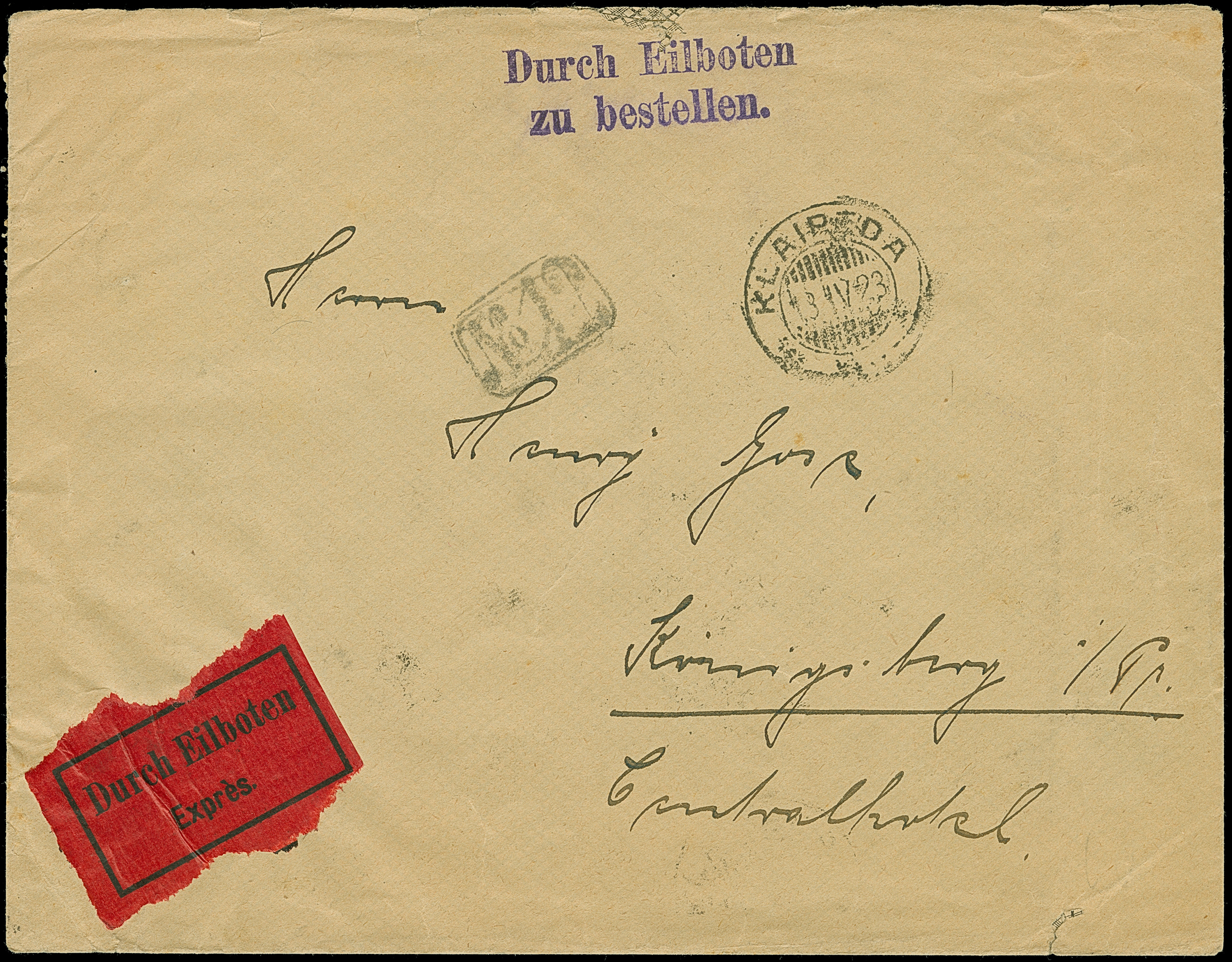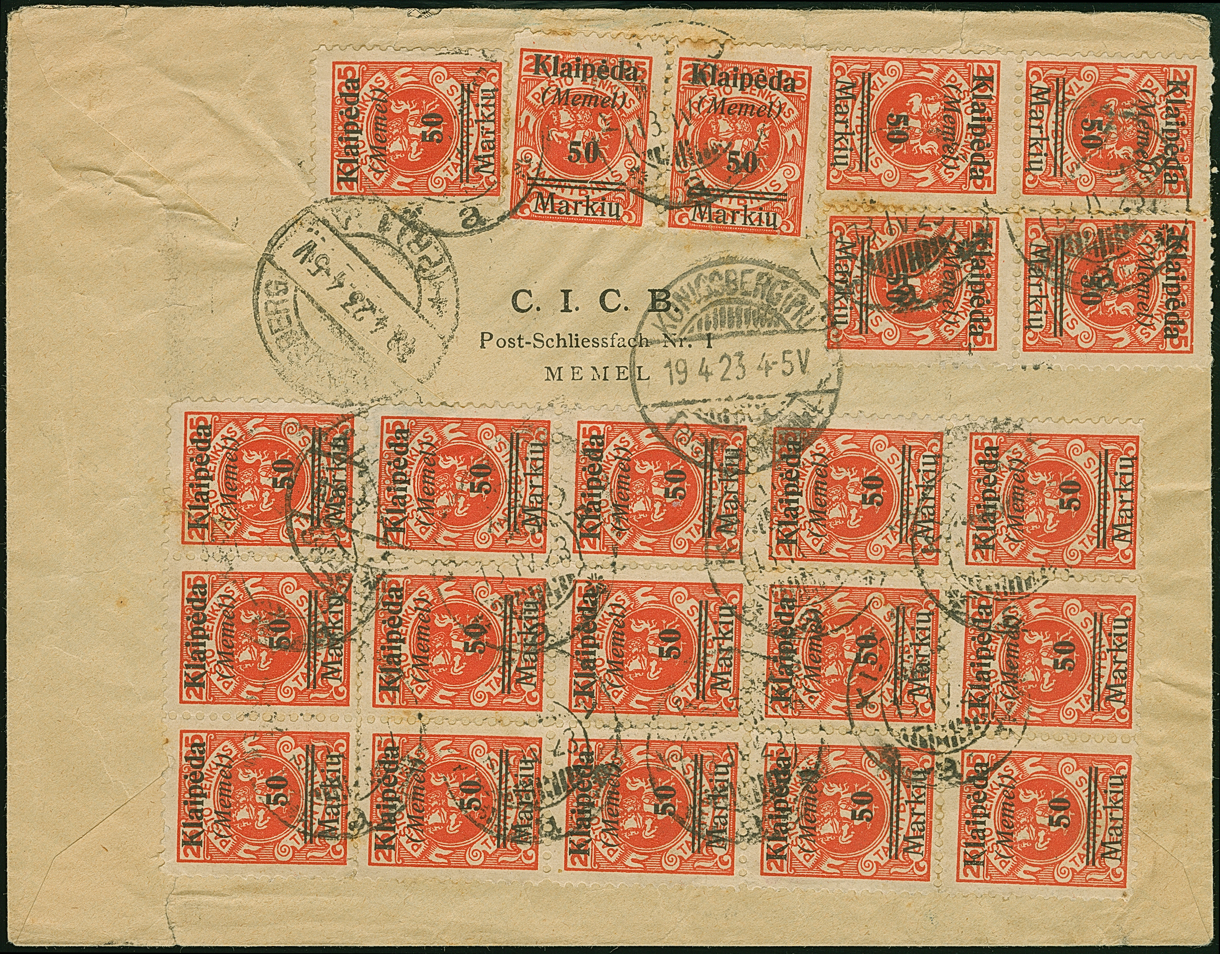 1923, Strichausgabe 50 Mark, 22 Werte meist in Einheiten rückseitig mit Stempel "KLAIPEDA 18.IV.23" auf Eil-Brief nach Königsberg, Umschlag und Frankatur teils mit leichten Mängeln, ein seltener Brief frankiert in Mark-Währung