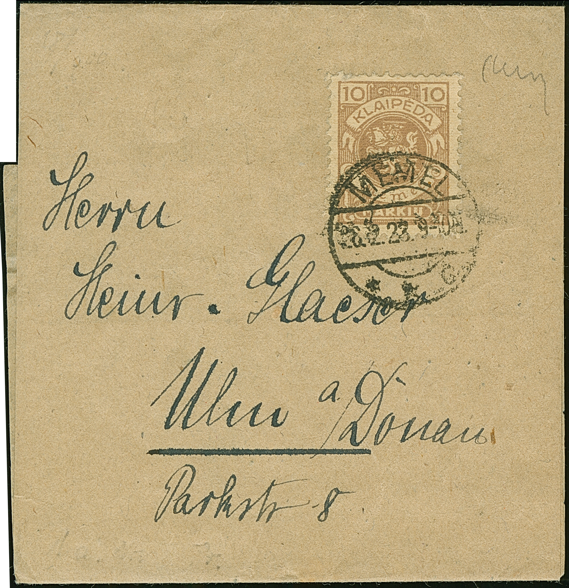 1923, Wappenreiter 10 Mark, sauber mit Stempel "MEMEL 28.2.23" auf portogerechter Drucksachenschleife nach Ulm, eine der großen Seltenheiten denn diese Einzelfrankatur war nur 2 Tage lang möglich, die Frankatur oben links winzig fehlerhaft, sonst tadellos, sign. Dr. Petersen BPP